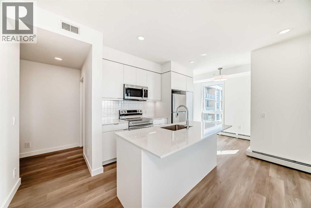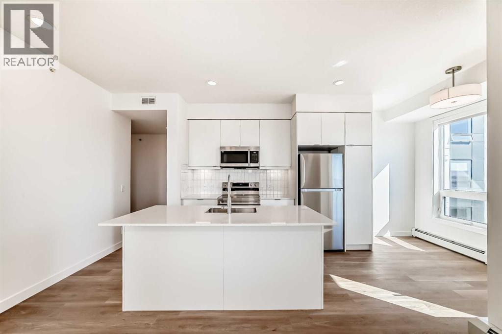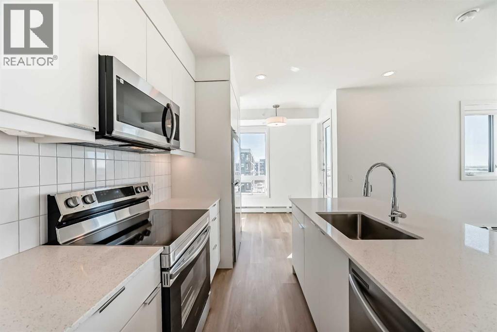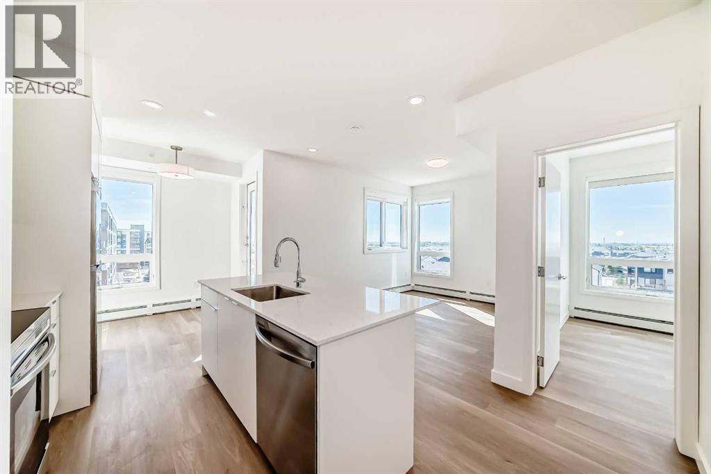 CORNER UNIT WITH 2 ENSUITE BATHROOMS.  This bright 5th-floor corner unit features two spacious bedrooms, each with its own walk-in closet and ensuite bathroom. Located in East Hills Crossing, the home also includes underground parking and a storage locker. Enjoy being just steps from East Hills Shopping Centre (Costco, Walmart, Cineplex, banking), parks, and walking trails, with quick access to Stoney Trail—and only a 20-minute drive to downtown Calgary.Inside, the open-concept layout offers sleek white cabinetry, a large eating bar, and a dedicated dining space. Expansive corner windows flood the condo with natural light, while south and east views highlight its prime position. The dining area opens to a private balcony, perfect for morning coffee or relaxing on sunny afternoons.With in-suite laundry, titled underground parking, and a separate storage unit, this condo delivers a complete package for first-time buyers, downsizers, or investors. Book your private showing today! (id:6769)