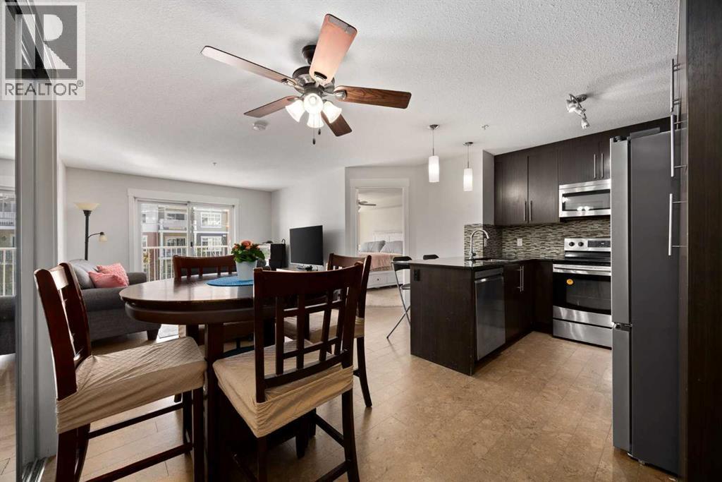 This SOUTH-FACING BALCONY offers a bright, comfortable, and modern living space packed with desirable features. With 2 BEDROOMS & 2 FULL BATHROOMS, there’s plenty of room to relax, entertain, or work from home. Lovingly maintained by the ORIGINAL OWNER, this unit shows pride of ownership throughout.As you step inside, you'll be greeted by an open-concept layout filled with natural light, thanks to its south orientation. The kitchen features STAINLESS APPLIANCES, while the IN-SUITE LAUNDRY with a stackable washer and dryer adds everyday convenience. You'll also appreciate the large IN-SUITE STORAGE ROOM and an ADDITIONAL STORAGE cage located in front of the TITLED PARKING STALL, offering plenty of space for seasonal items or gear. CEILING FANS in both the primary bedroom and dining/kitchen areas help keep the unit cool and comfortable during warmer months.Parking is a breeze with 1 TITLED UNDERGROUND STALL, plus ample VISITOR PARKING and the option to lease surface parking if needed.Located in the vibrant community of Skyview Ranch, you’ll enjoy access to parks, playgrounds, green spaces, and walking and biking paths just steps from your door. For shopping, dining, and entertainment, CrossIron Mills is only a short drive away, offering a wide variety of options.Commuting is convenient with easy access to Stoney Trail and Calgary International Airport, making travel in and out of the city quick and efficient.Don’t miss your chance to own this well-appointed condo in a thriving community... A perfect place to call home! (id:6769)