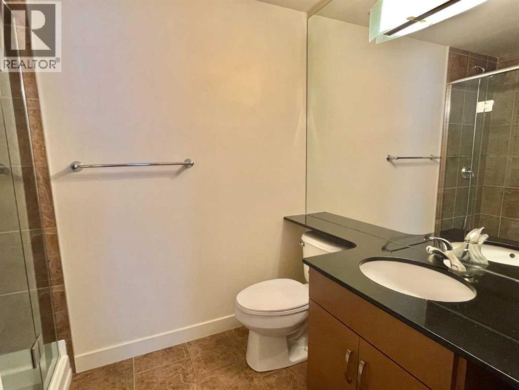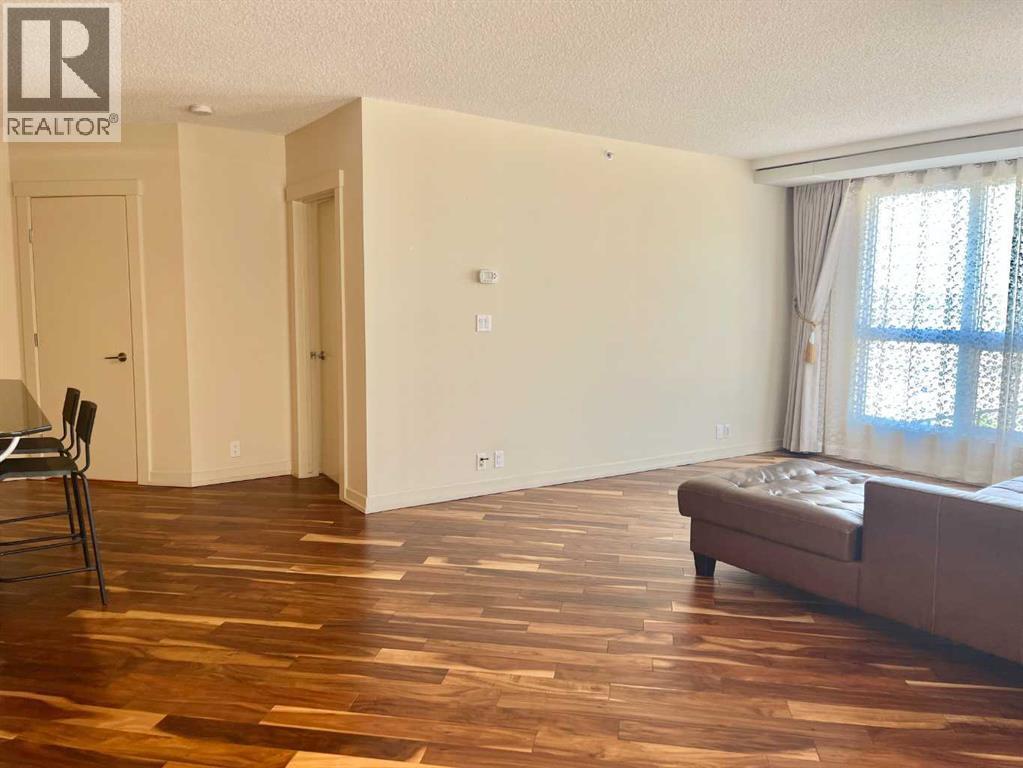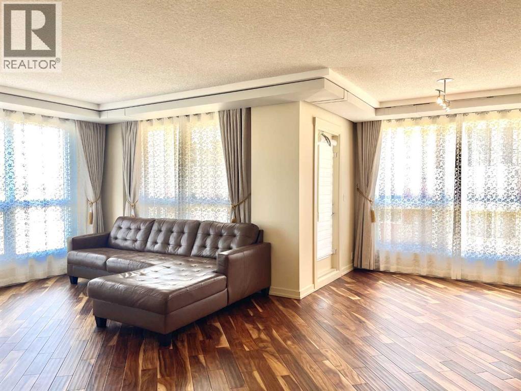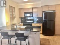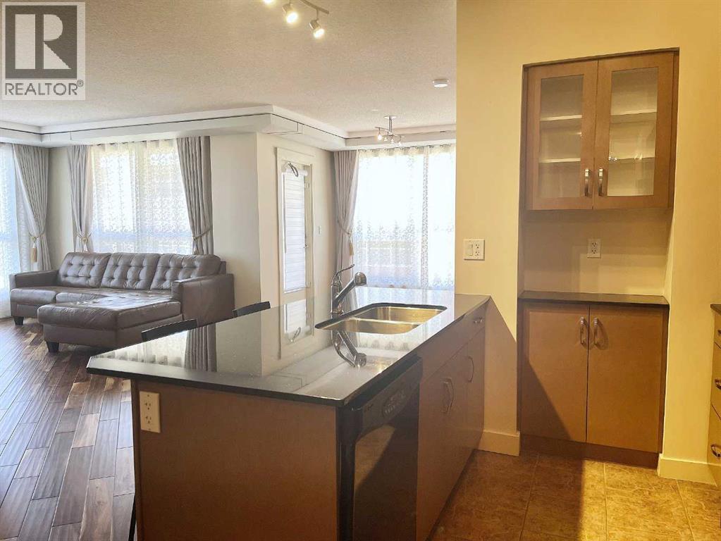 Presenting the largest corner unit in the building—an exceptional 2-bedroom, 2-bathroom residence offering 1,038 square feet of thoughtfully designed living space. This upgraded residence features stylish engineered hardwood flooring and an open concept floor plan. A spacious and welcoming foyer with a double closet sets a sophisticated tone upon entry. Expansive windows throughout the unit allow for an abundance of natural light, further enhanced by the addition of elegant, customized double-layer curtains that provide both privacy and light control. The modernized kitchen is outfitted with updated cabinetry and striking black granite countertops, complemented by a suite of matching black appliances. The generous living room offers ample space for comfortable seating arrangements, with an adjacent dining area that opens to a private balcony featuring pleasant views. The primary bedroom includes a well-appointed four-piece ensuite, adding to the home's overall functionality and comfort. Residents will appreciate the building’s direct access to essential amenities, including nearby grocery stores and restaurants, all reachable without the need for elevator use. A convenient door one level below provides quick, weather-free access to Save-On-Foods via the 4th-floor parkade. Additional features include on-site security, a dedicated concierge, and ample indoor and guest parking. Situated in a highly desirable location within walking distance of numerous services and conveniences, this professionally upgraded unit with a sought-after layout represents exceptional value in today’s market. (id:6769)