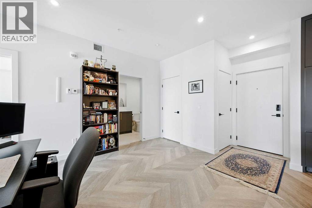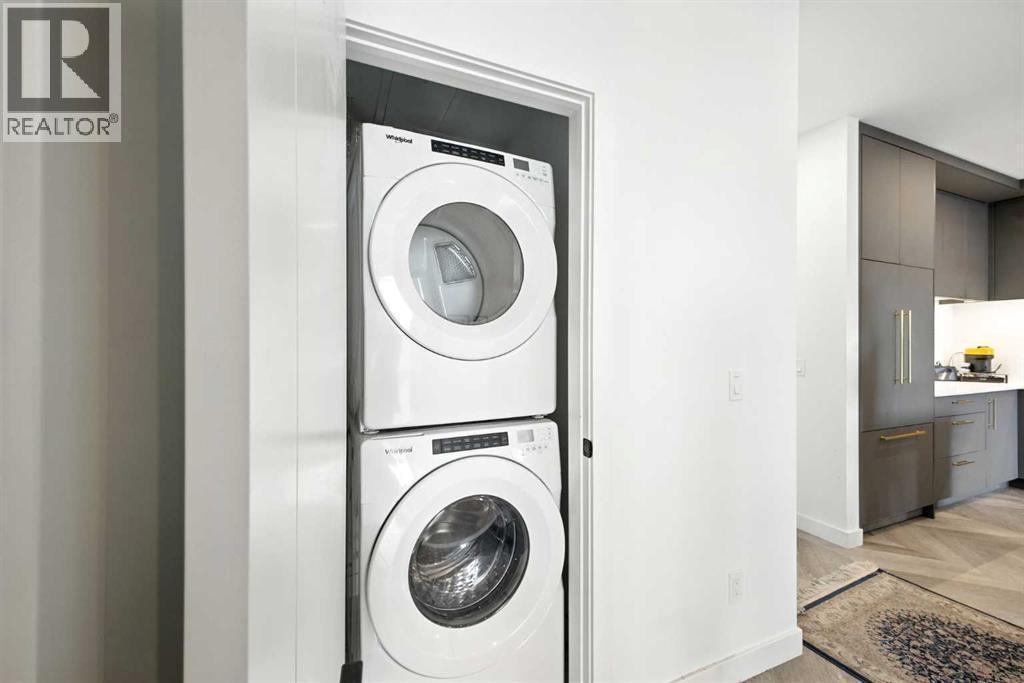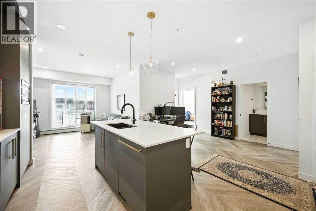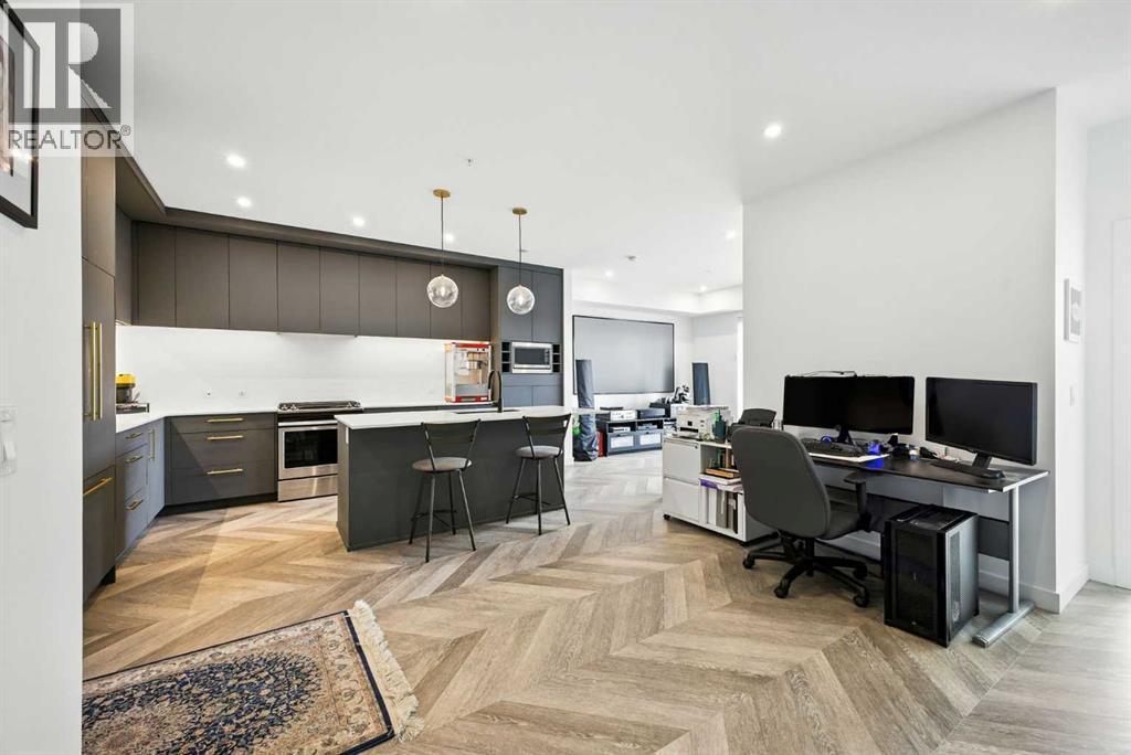 Welcome to this top floor residence in Esquire, a premium condo development in Calgary’s vibrant University District, offering 900 square feet of thoughtfully designed living space with 2 bedrooms, 2 full bathrooms, and a layout that blends modern style with everyday comfort. The chef inspired kitchen is equipped with ceiling height cabinetry, quartz countertops, a tile backsplash, gas range, and a large island with seating. From here, the stylish herringbone vinyl plank flooring leads you through the main living areas of the home, including a bright living room filled with natural light and opening onto a private balcony that provides the perfect spot for morning coffee or evening relaxation while overlooking Esquire’s manicured courtyard. The generous size of this unit also allows room in the main living area for a desk or study nook, making it easy to create a dedicated workspace. The spacious primary suite features a walk-in closet and a 4 piece ensuite with dual vanities and a glass enclosed shower, while the second bedroom and full bathroom create flexibility for family, roommates, or guests. In suite laundry adds comfort and convenience to your daily routine. A titled underground parking stall is also included, keeping your vehicle safe and warm year-round. Residents of Esquire enjoy premium amenities such as a fully equipped fitness centre, pet wash station, and bike storage and maintenance space, while being just steps from shops, restaurants, coffee spots, grocery stores, off leash area, parks, and pathways, with the University of Calgary, Alberta Children’s Hospital, Foothills Medical Centre, and Market Mall only minutes away. Book your showing today! (id:6769)