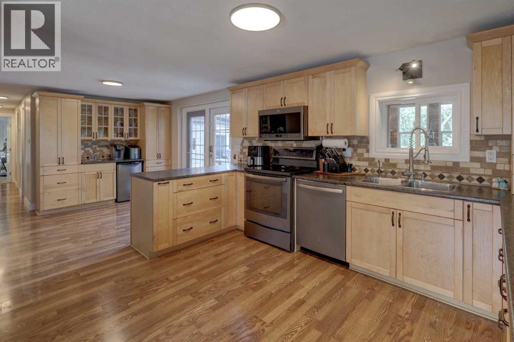 Bring your family to this 2.74 acre parcel - country living in the city w/ pavement to your door. This property is part of the city of Airdrie but is still taxed at the Rockyview County rate. You are quite literally a 3 minute drive to No Frills & the east side of Airdrie from this home. This home has had some renovations over the years & has a MASSIVE EAT IN KITCHEN, tons of BUILT INS inc desk/work area & CHINA CABINETS. Maple cabinets w/CROWN MOULDING & upgraded backsplash lend to the country feel. There are 3 large bedrooms upstairs (plenty of room for a queen sized bed in each of the secondary bedrooms) & a spacious primary suite w/ 3 pc ensuite. Plenty of light in the primary w/the south windows & a door off of the west side of the room. Plumbing & light fixtures have also been upgraded & durable laminate floors are kid and pet friendly. The main floor boasts 1546 sq ft w/another 187 sq ft sunroom complete w/WOOD BURNING FIREPLACE. The bsmt is fully finished w/a large rec rm space, guest room space (WINDOW DOES NOT MEET EGRESS), gaming space, gorgeous bath & storage. Outside the kids will be thrilled - SO MUCH SPACE TO PLAY! Numerous outbuildings provide lots of storage & the TRIPLE HEATED DETACHED GARAGE (940 sq ft) is perfect for parking & storage as well. The MASSIVE SOUTH FACING deck, NEWER SEPTIC TANK (2017) & NEWER WINDOWS add to the value & MATURE TREES make this the whole package. (id:6769)