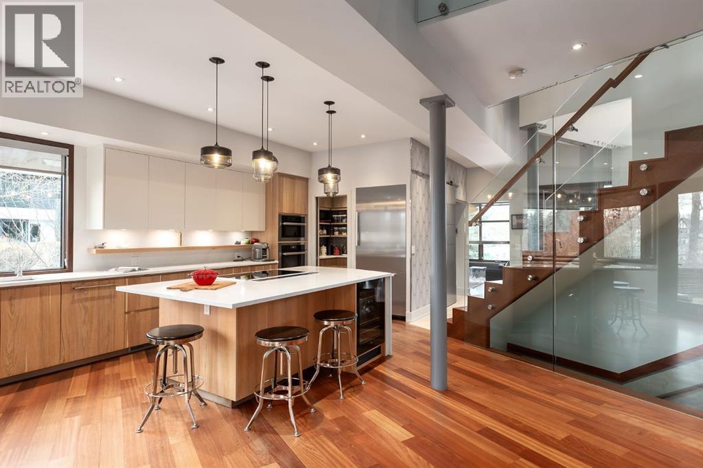 Opportunity awaits - Nestled along Rideau Road, this rare offering combines history, nature, and modern luxury— in a rare river & park adjacent location. Opportunities like this in Rideau Park are few and far between, making this home a truly one-of-a-kind find.Inside, Brazilian cherry hardwood floors set the tone for timeless elegance. The main floor is designed for both connection and privacy, with a central glass staircase anchoring the layout. Enjoy the front library/den, an elegant living room, or dining with a view of the trees.The Porcelanosa kitchen is a showpiece—flooded with natural light and overlooking the park and river. Outfitted with a full Miele appliance package, induction cooktop with hidden hood, beverage center, walk-in pantry, and Porcelanosa finishes, it’s both functional and striking. A floor-to-ceiling window and wood-burning fireplace create a warm dining atmosphere.Upstairs, the southwest-facing primary retreat offers vaulted ceilings, a private balcony with river views, spa-like ensuite with natural stone, walnut cabinetry, heated floors, soaker tub, walk-in shower, and custom wardrobe system. Two additional bedrooms complete this level—one with cheater ensuite and steam shower, the other with rare river views.The finished basement includes a gym, rec room, 4th bedroom, full bath, laundry with sink, storage, and access to the front attached garage.The backyard flows seamlessly into one of Calgary’s most scenic parks, with the Elbow River Pathway just outside your door. Whether for morning jogs or evening strolls, this location is unmatched for lifestyle and connection to nature.Rooted in legacy, Rideau Park is one of Calgary’s most prestigious communities, once home to CHCT-TV’s first studios. Rarely do homes of this caliber on Rideau Road come to market—this is more than a home, it’s a once-in-a-generation opportunity to own a piece of Calgary’s history in an irreplaceable location. (id:6769)