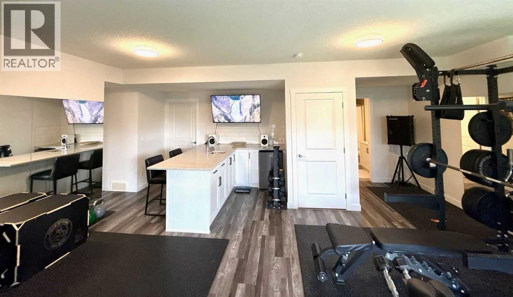 Click brochure link for more details**Stunning Canal-View Walkout in Bayside Estates, Airdrie. Welcome to this exceptional 5-bedroom, 3.5-bathroom walkout home located in the highly desirable community of Bayside Estates. Built in 2020 by Genesis Homes, this beautifully upgraded residence offers over 3,100 square feet of finished living space, set on a 4,900 sq ft pie-shaped lot backing onto peaceful canal views.The northwest-facing backyard is perfectly positioned for evening sunsets, offering an incredible outdoor living experience without the premium price tag of full canal-front homes. Enjoy the expansive 36-foot composite deck, complete with a covered gazebo dining area—ideal for entertaining or relaxing year-round. The front and back yards have been professionally landscaped, and permanent exterior LED lighting adds charm and ambiance in every season. Just steps away, scenic walking and biking paths wind along the canals, and several parks and green spaces are within easy reach, making this an ideal location for active families and nature lovers.Inside, the home’s layout is as functional as it is elegant. The upper level features three generously sized bedrooms, including a stunning primary retreat with unobstructed canal views, a spa-inspired ensuite featuring dual vanities and a freestanding soaker tub, and a large walk-in closet. A spacious bonus room with large windows fills the upper level with natural light, while a convenient upstairs laundry room adds day-to-day practicality.The main floor is thoughtfully designed for both everyday living and entertaining. A private office at the front of the home is perfect for remote work or study. The open-concept kitchen, dining, and living space is sun-drenched and showcases picturesque views of the canal. The chef’s kitchen is equipped with floor-to-ceiling cabinetry, an oversized island with abundant storage, a premium gas range, and sleek stainless steel appliances—all combining to create a welcoming and hi gh-performance cooking space.The fully developed walkout basement adds valuable square footage with two additional bedrooms, a full bathroom, and a large recreation area currently set up as a home gym. A modern wet bar enhances the space for entertaining guests, while a spacious storage and utility room ensures everything has its place.The oversized double attached garage offers epoxy-coated floors and an extra tandem bay, ideal for a vehicle lift, workshop, or additional storage. It also features a gas heater rough-in, allowing for future year-round use. Additional upgrades throughout the home include central air conditioning, a high-efficiency furnace and water heater, upgraded LED lighting, and high-end finishes that reflect both comfort and quality craftsmanship.This remarkable property combines luxury, lifestyle, and location in one incredible package. A home for peace, productivity, and lasting memories. (id:6769)