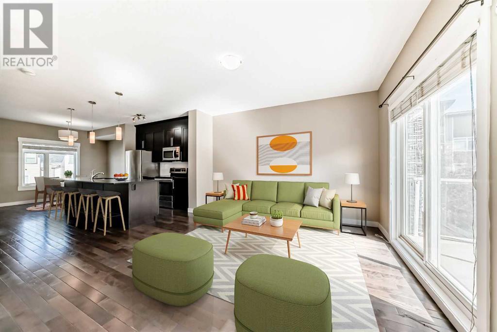 ** OPEN HOUSES, SAT. JULY 19, 1-3pm & SUN. JULY 20, 1-3PM** This beautiful 2-bedroom, 2.5-bathroom townhouse in Skyview Ranch offers both comfort and convenience. Highlights include a welcoming entry with a den and a large mudroom leading to the double attached garage. The main floor features an open-concept living area with distinct, functional spaces and great flow, including a well-designed kitchen with a large island, granite countertops, ceiling-height cupboards with lots of storage space, a pantry and a charming dining area. The large, bright living room is a wonderful, welcoming space with a balcony overlooking the courtyard, perfect for enjoying outdoor evenings. Upstairs, you'll find a versatile flex space ideal for an office, reading nook, or small family room. The second bedroom and main 4-piece bathroom are also well-sized, with the washer and dryer conveniently located nearby. This property is professionally landscaped, with plenty of visitor parking, and is situated in an established community close to schools, parks, major routes like Stoney Trail and Deerfoot Trail, and minutes to the airport. Recent updates include a newer washer and dryer, and the carpets have all been professionally cleaned. This home is move-in ready and an excellent choice for your next home! (id:6769)