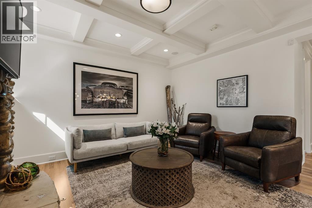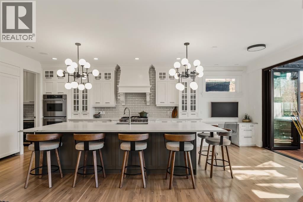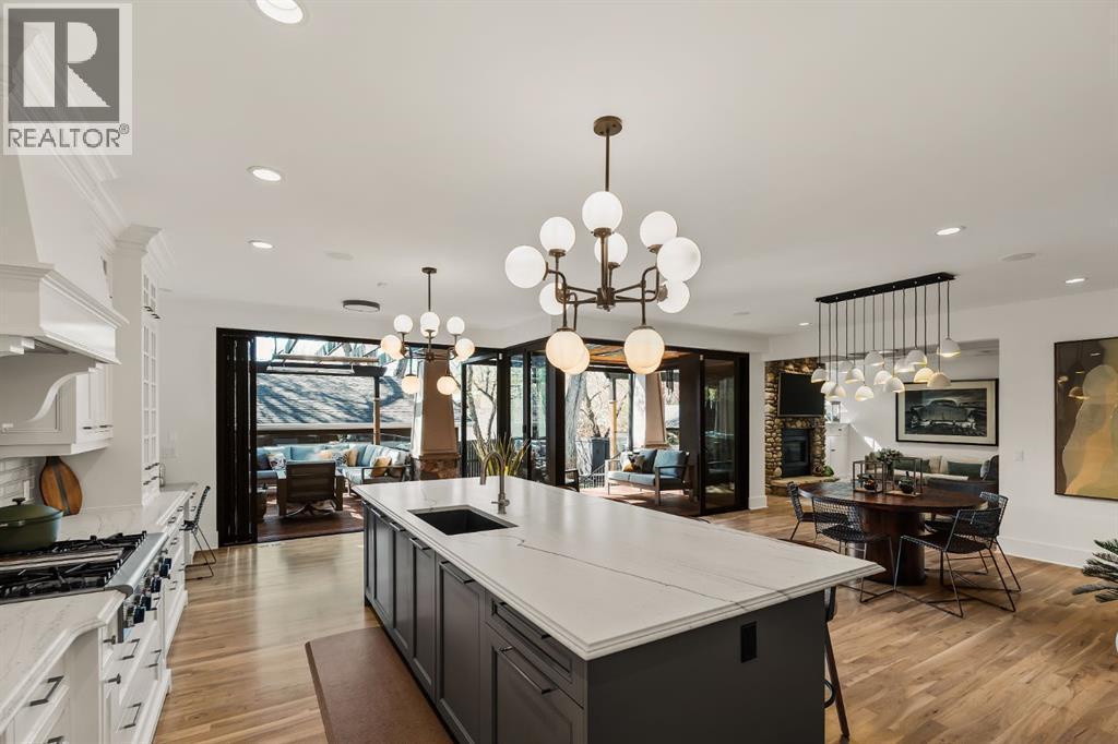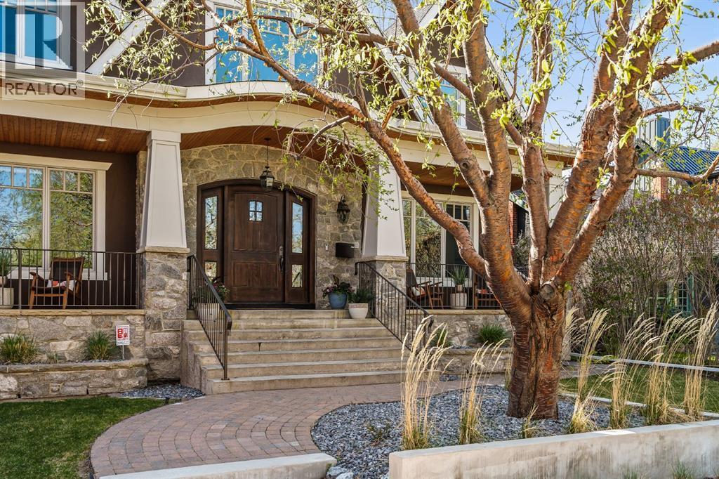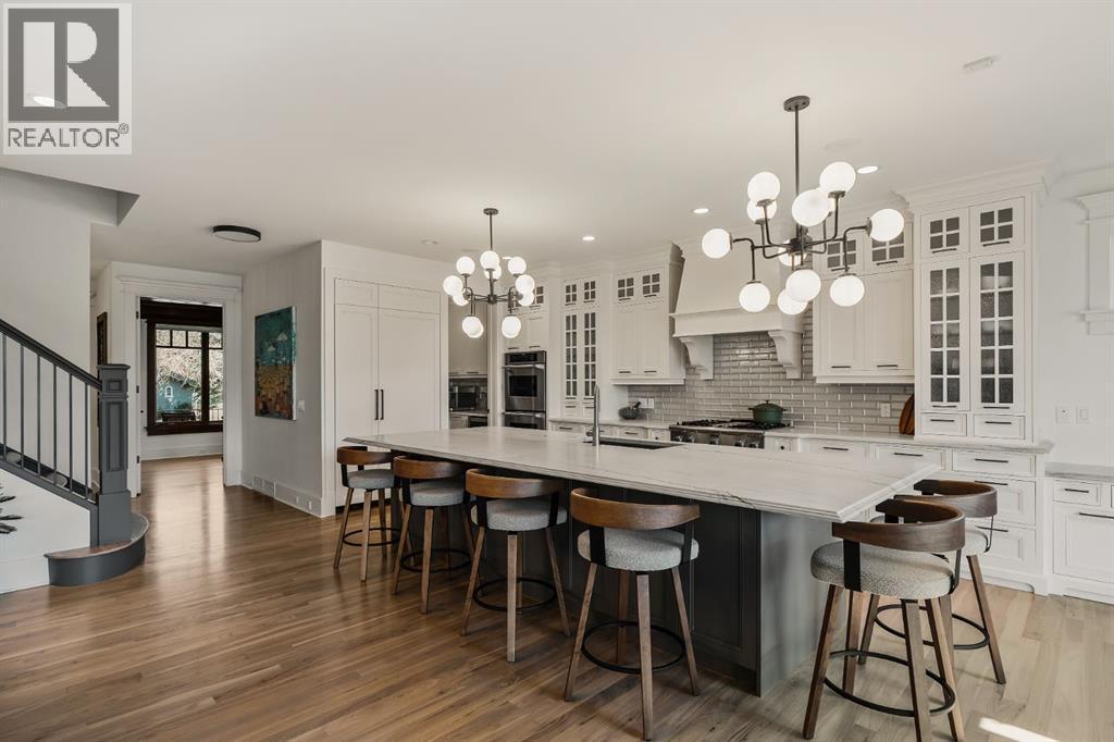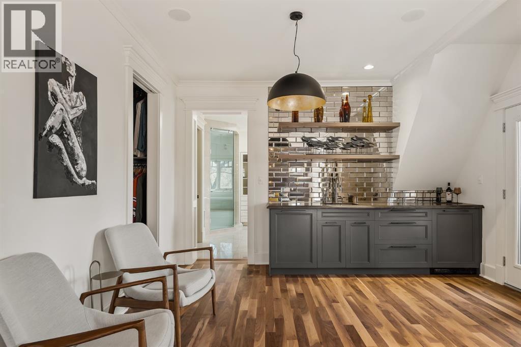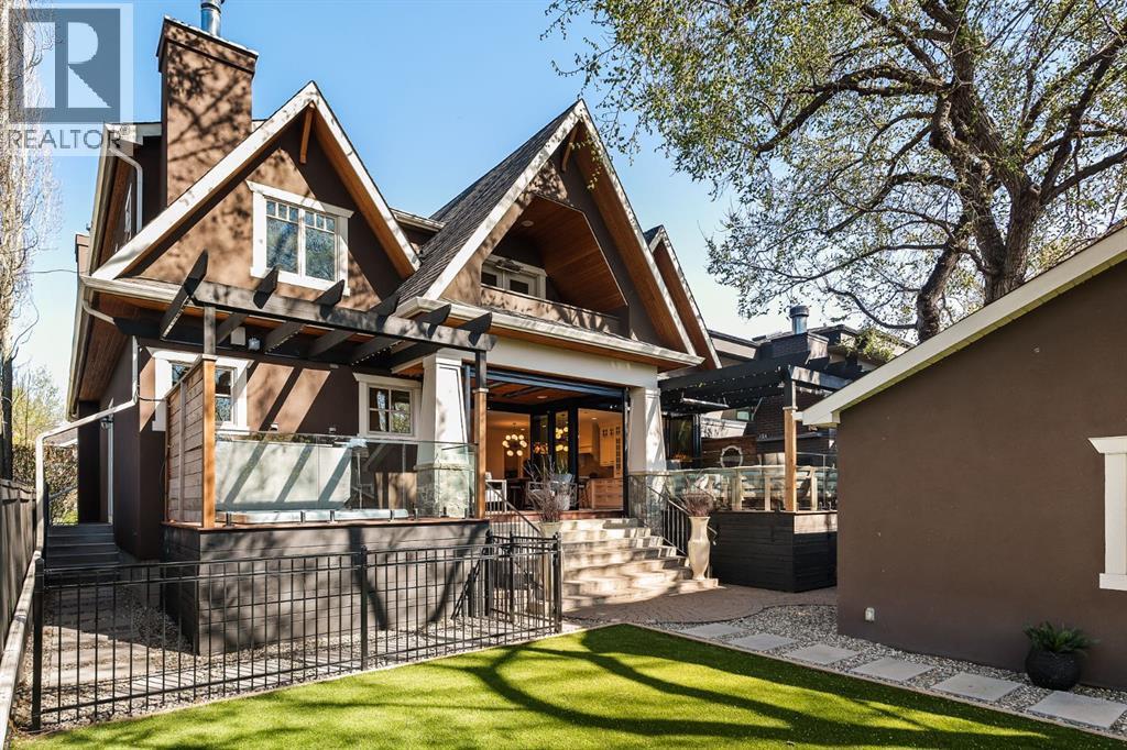 A Roxboro Masterpiece — Luxury Living in One of Calgary’s Most Prestigious Communities. Nestled on the coveted 3rd Street, this architectural masterpiece—originally custom built by McKinley Masters offers over 5,850 sq ft of meticulously developed space, crafted for those who value exceptional quality, timeless design, and seamless indoor-outdoor living. From the moment you step inside, you’ll sense the uncompromising attention to detail. Rich millwork, coffered ceilings, and designer lighting set the tone, while an open-concept layout makes entertaining effortless. The heart of the home is the spectacular main living area where the living room, dining space, and state-of-the-art kitchen flow together in perfect harmony. A custom NanaWall opens fully to reveal a west-facing outdoor sanctuary designed for year-round enjoyment. Featuring IPE Brazilian hardwood decking, overhead infrared heaters, a brand-new hot tub, wood-burning fireplace with nat gas assist, and motorized privacy screens, this outdoor space transforms with the seasons—whether you’re hosting summer soirées or cozy winter evenings by the fire. The chef’s kitchen is a true culinary playground, outfitted with high end appliances, dual ovens, two dishwashers, wine fridge, and a butler’s pantry complete with filtered water, a direct water line for your espresso machine, and hot water on demand. Whether preparing a gourmet meal or casual brunch, this kitchen performs with style and ease. Across from the kitchen, the family room invites you to unwind beside a charming gas fireplace, while the elegant formal living room offers a more refined space for conversation or post-dinner cocktails. The main level also features a distinguished front-facing office bathed in natural light, adorned with intricate millwork is perfect for working from home in comfort and style. Ascend to the second level and discover a luxurious primary retreat designed for total relaxation. A private lounge area, coffee/wine bar with dishw asher and filtered water, heated balcony, and a walk-in closet that rivals a boutique all lead to a truly spa-inspired ensuite with a steam shower, in-floor heating, and dual vanities. Two additional bedrooms, a full bath, and a flexible office/music room that could serve as a 4th bedroom complete the upper floor. The lower level is built for entertainment and wellness. A stunning custom bar with wine fridge and dishwasher takes center stage beside a one-of-a-kind wine cellar and cold room. Shoot pool, play shuffleboard (both included), or host game day gatherings in this stylish and functional space. A full home gym adds convenience, while a spacious guest suite provides comfort for visitors. Additional Features: fully finished, heated garage with epoxy floors includes two electric car chargers and storage. Lutron home automation throughout, Sonos sound throughout, dual A/C units and furnaces, steam humidifiers, Gemstone exterior lights, irrigation, and artificial turf/low maintenance landscaping. (id:6769)