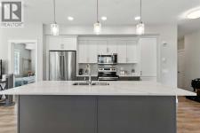 Welcome to this stylish corner unit with 2 bedrooms and 2 bathrooms, featuring 2 TITLED underground parking stalls and an assigned storage locker. This bright and modern 884 sq. ft. apartment offers an open layout with 9 ft. ceilings, luxury laminate and tile flooring, and marble quartz countertops.The kitchen includes full-height two-tone cabinets, a central island with bar seating, stainless steel appliances, and a classic tile backsplash. Enjoy the spacious dining area and sunny living room with wrap-around windows, leading to a large patio overlooking a peaceful zen garden—great for outdoor living with a gas BBQ line.The primary suite has a walk-in closet and a 5-piece ensuite with dual vanities, a soaker tub, and a tiled shower. The second bedroom can serve as a guest room or home office, with easy access to the second full bath. Additional features include new laminate flooring in the bedrooms, in-suite laundry, heated underground parking, and a heated driveway ramp.Located steps from South Health Campus, Seton Urban District, and the Seton YMCA, this home offers great walkability to shops, restaurants, recreation, and transit. Enjoy the best of urban living in Seton! (id:6769)