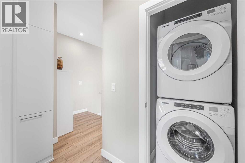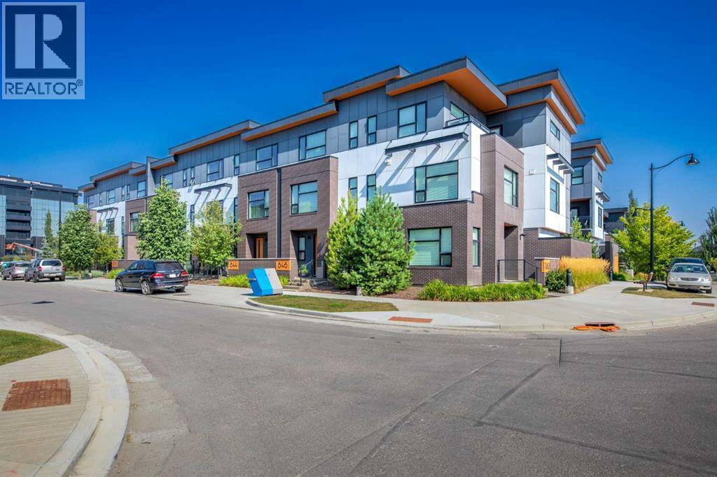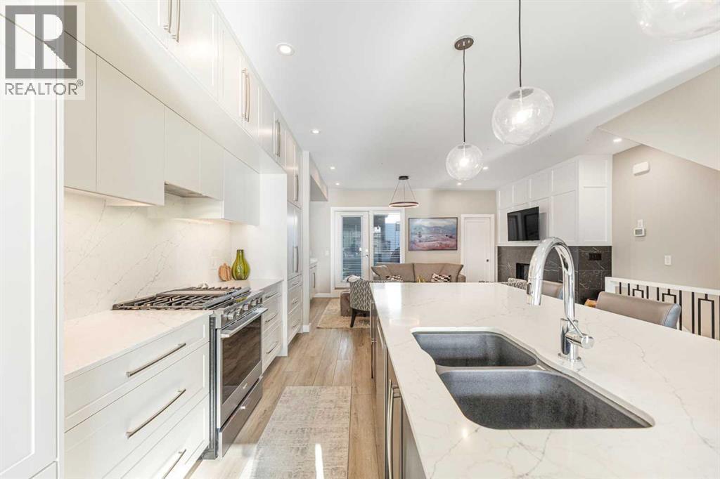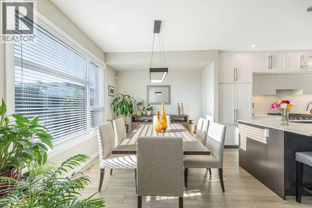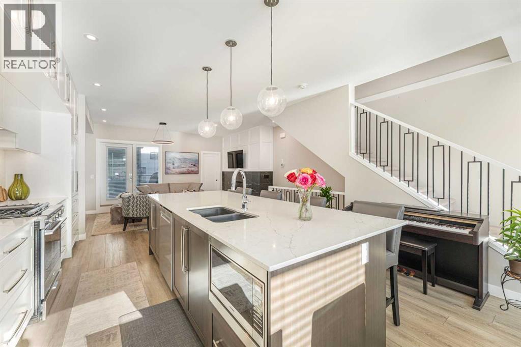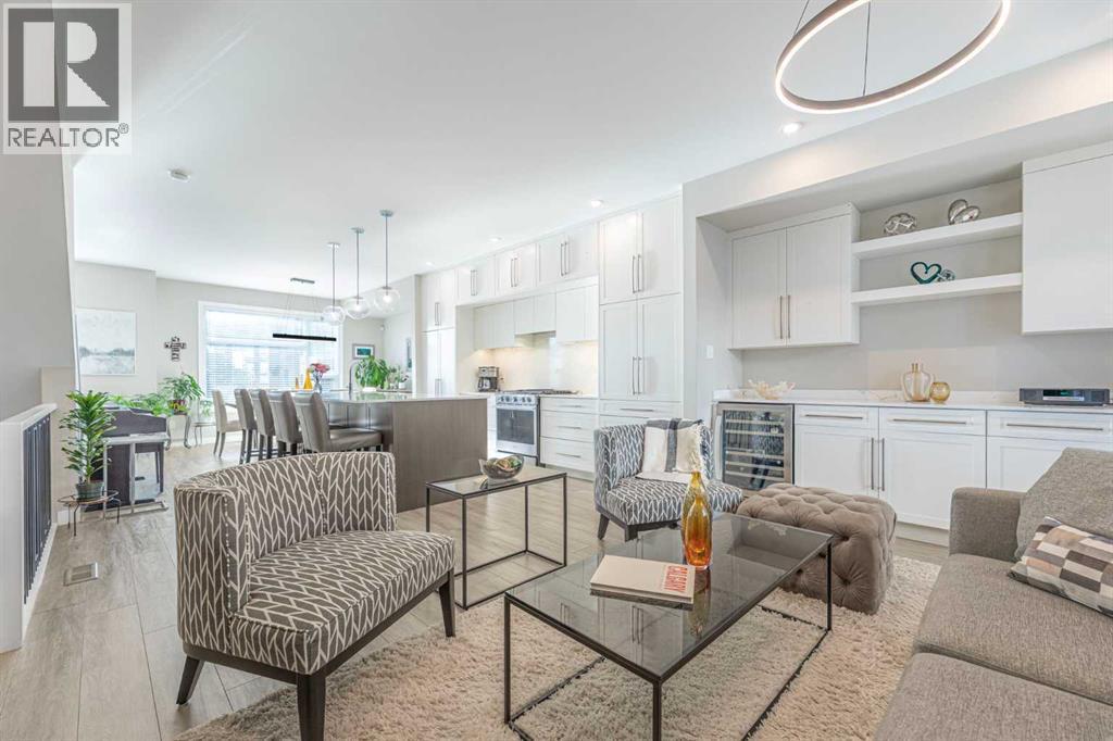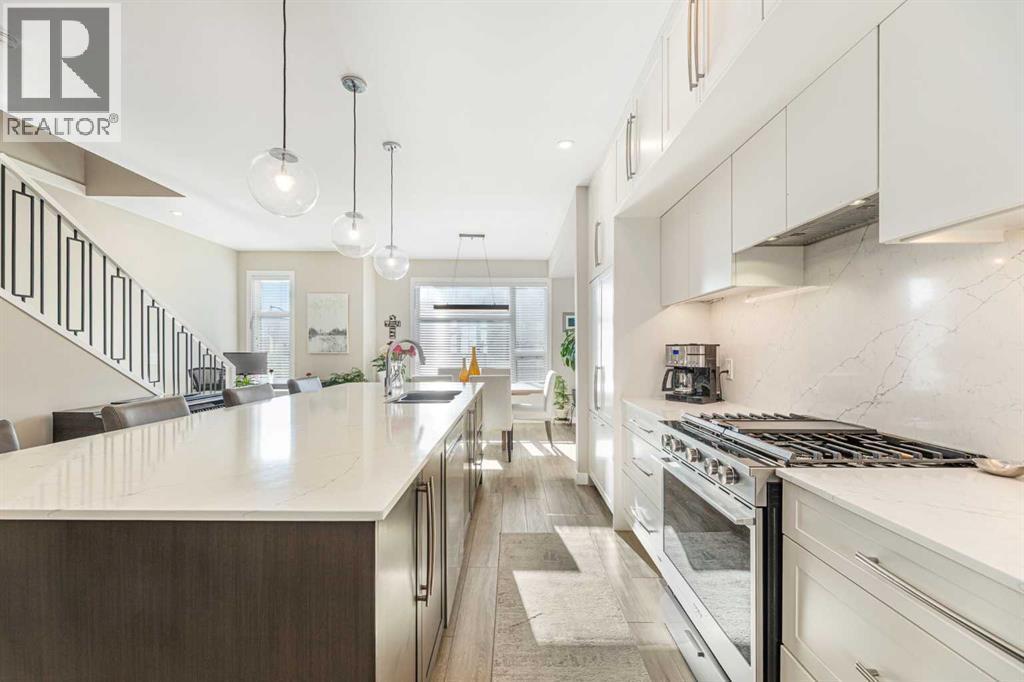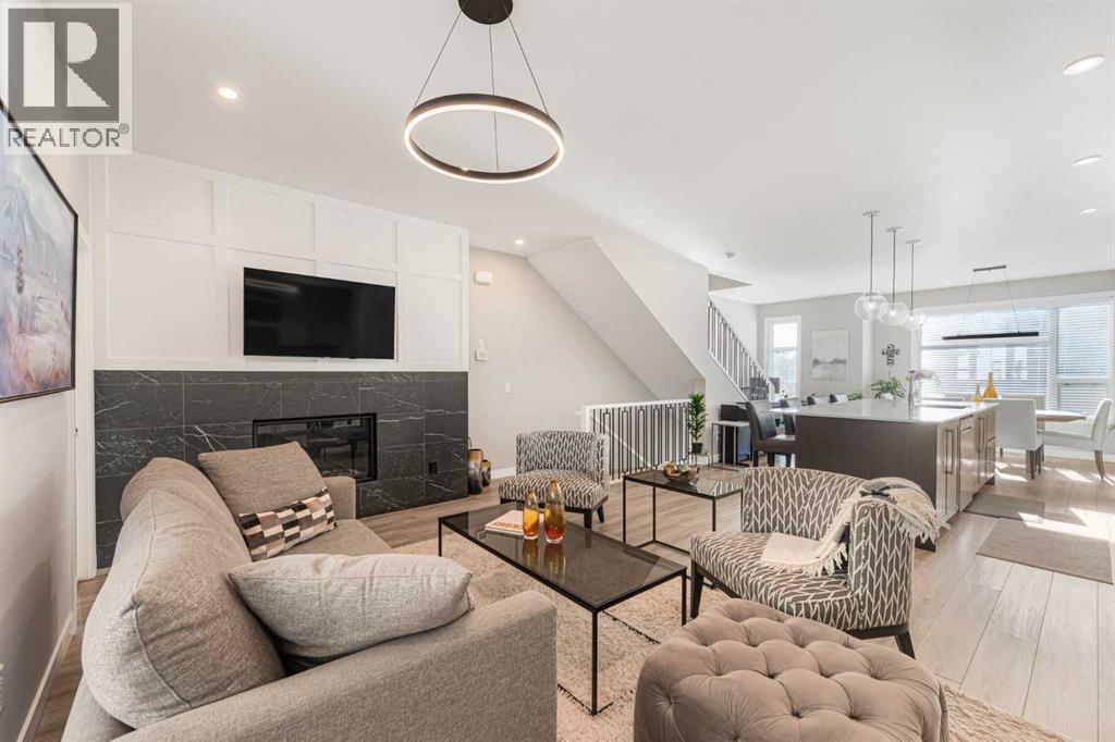 Welcome to this stunning original owner townhome located in the sought-after West District in West Springs. This beautifully upgraded 1,763 sq ft home offers a modern lifestyle with exceptional convenience and design. Step into a spacious entry foyer on the lower level, large enough to comfortably accommodate a home office, additional sitting area, or even exercise equipment. Thoughtfully designed with custom built-in cupboards for storage and direct access to the finished double attached garage, this space is both functional and versatile. The main level impresses with luxury vinyl plank flooring throughout, high ceilings, and an open-concept layout filled with natural light. The chef-inspired kitchen features full height cabinetry, deep storage in the oversized island, quartz countertops and backsplash, a gas range, and a built-in, integrated refrigerator for a sleek, modern finish. Adjacent to the kitchen is a built-in bar or coffee station with a wine fridge. The bright and spacious living room boasts a beautiful fireplace and opens onto a private balcony, perfect for relaxing. The generous dining area easily fits a large table, creating a seamless flow for both daily living and entertaining. Upstairs, you’ll find three well-appointed bedrooms and two full bathrooms. The primary suite is a luxurious retreat with a custom walk-in closet and a spa-inspired ensuite featuring a dual floating vanity and luxury shower. A convenient stacked laundry is also located on this level. Enjoy being part of a vibrant community, just steps from top-rated schools, shopping, dining, fitness centres, and everyday amenities. Radio Park, opening in September, is walking distance from your front door and will span 8.4 acres, offering year-round activities, pathways, and a dedicated dog park for residents to enjoy. With close proximity to Winsport, city parks, and quick access to Highway 1, you're minutes from the mountains or downtown Calgary. (id:6769)