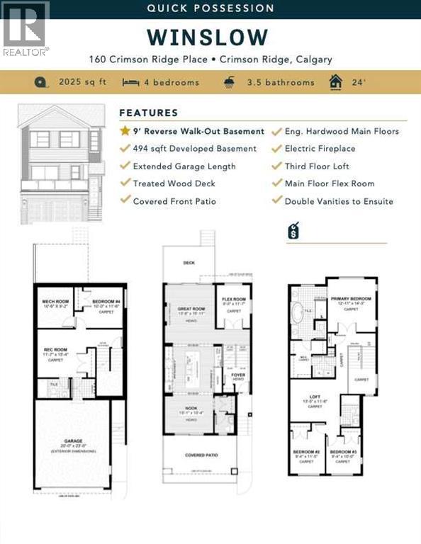 Discover the Winslow by Master Builder Douglas Homes!Welcome to The Winslow a masterfully designed reverse walkout home by Douglas Homes, nestled in the highly sought-after community of Crimson Ridge.Backing onto the prestigious Lynx Ridge Golf Course and siding onto green space and scenic walking paths, this home offers a rare combination of luxury living and natural beauty. Spanning over 2,000 sq. ft., this beautifully appointed new build features an open-concept layout with modern elegance and quality finishes throughout. Hardwood flooring flows seamlessly across the main level, where you'll find a spacious great room anchored by a sleek electric fireplace, an elegant dining area, and a chef-inspired kitchen. The gourmet kitchen boasts an oversized island, quartz countertops, stylish cabinetry, and five stainless steel appliances, including a gas range. main floor flex room provides the perfect space for a home office or den. Step out onto the expansive 20' x 10' covered patio, ideal for entertaining or enjoying the peaceful surroundings of Crimson Ridge.Upstairs, discover three generous bedrooms, a versatile loft-style bonus room, and a convenient laundry area. The luxurious primary suite is your private escape, complete with a spa-like 5-piece ensuite featuring a deep soaker tub, stand alone shower, dual vanities, and a large walk-in closet.The fully finished basement expands your living space with a spacious recreation room, an additional bedroom, and a full bathroom, perfect for guests, teens, or multi-generational living.Surrounded by nature yet just minutes from everyday amenities, this is a rare opportunity to own a Douglas Home in one of the area's most desirable locations (id:6769)