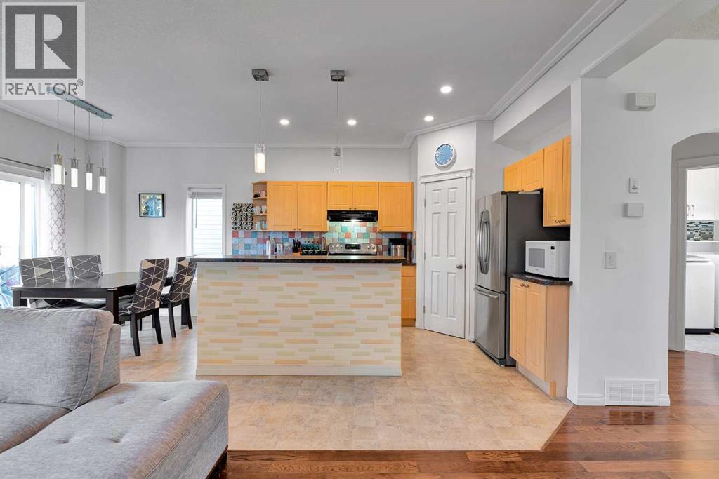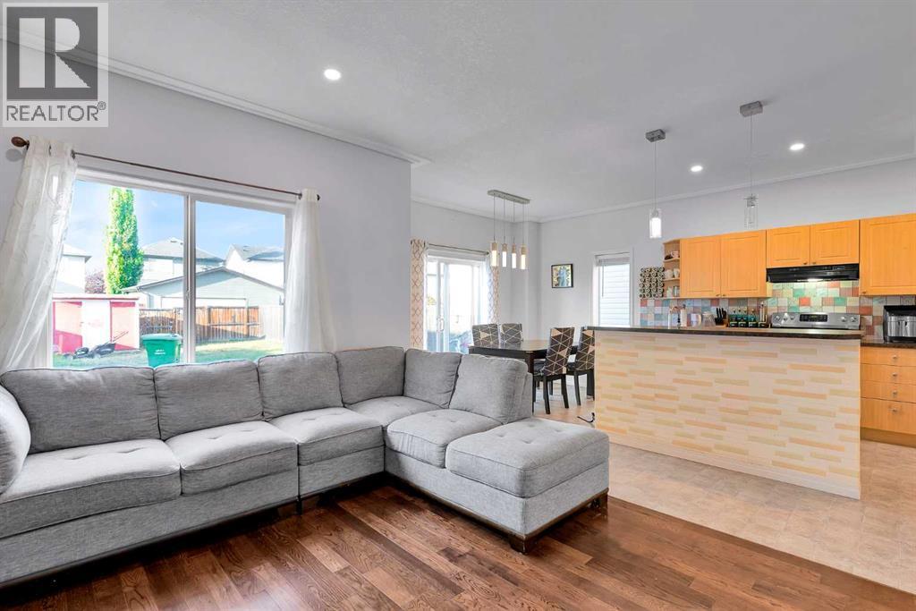 Discover this affordable 2-storey detached home in the desirable community of Evanston, offering over 2110 sq.ft of living space with 3 bedrooms, 3.5 bathrooms, and a thoughtful layout designed for modern family living. The main floor welcomes you with 9-ft ceilings, as the large foyer leads to a bright and open-concept living room centred around a cozy gas fireplace. The spacious kitchen features a corner pantry, SS appliances, a centre island with raised eating bar, and a dining area with double patio doors. Those doors lead to the deck and huge backyard with storage shed and plenty of room for a double detached garage. A laundry room and 2-pc bath complete this level. Upstairs, the serene primary suite offers a walk-in closet and private 4pc ensuite, while two additional bedrooms are generously sized and filled with natural light, sharing a 4pc bath. The fully finished basement expands your living space with a large recreation room, a den with a built-in office, and a 3pc bath — perfect for movie nights, a playroom or a home gym. Outside, the oversized backyard is fully fenced and landscaped, offering space for play, gardening and entertaining. Situated in a family-friendly community close to schools, grocery stores, cafes and shops, with easy access to Stoney Trail and major routes for a smooth commute. Call to book your private viewings today! (id:6769)