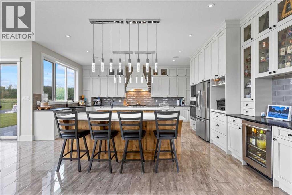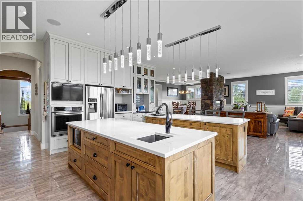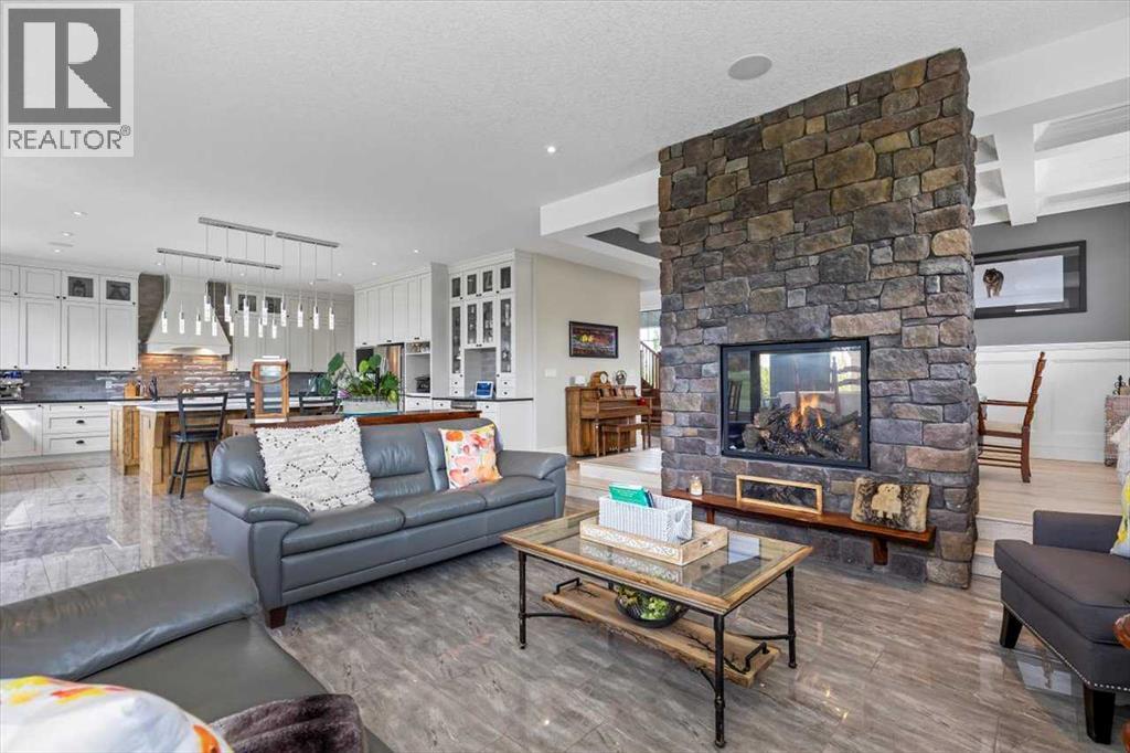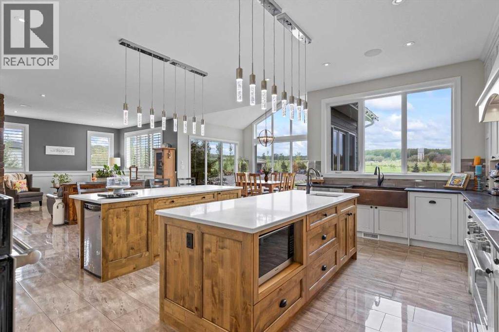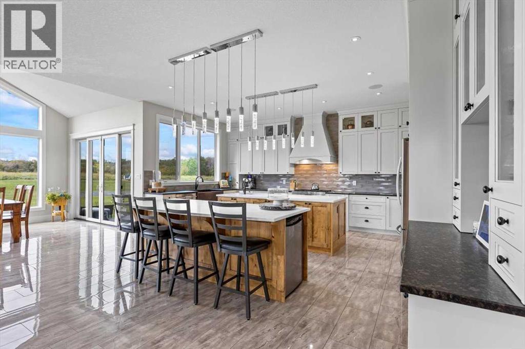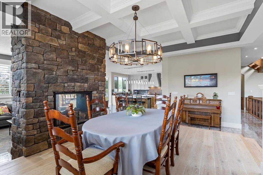 Welcome to an extraordinary CUSTOM-BUILT estate where functional luxury and privacy meet in perfect harmony. Set on 3.12 acres at the end of a quiet cul-de-sac with no neighbours behind, this residence offers more than 7,000 sqft of impeccably designed living space across three levels and a seamless balance of serene country living with city convenience. As you step inside the foyer, the 20-foot ceilings might be the last thing you notice as the adjacent awe-inspiring floating Alderwood staircase immediately grabs your attention and sets a tone of refined craftsmanship. While still standing in the foyer, the open concept design allows you to look past the raised dining room with coffered ceiling, double-sided stone fireplace and living room into the nook with its own 14-foot vaulted ceiling and a panoramic view of the backyard. The gourmet kitchen is a chef’s dream that features floor-to-ceiling custom cabinetry, double 8-foot Knotty Alder Islands, Jenn-Air Professional 36” Dual Fuel 6-Burner Range & Jenn-Air Professional Convection Wall Oven, 40” Native Trails Copper Farmhouse sink, and the striking combination of quartz and leathered granite countertops provides seemingly endless counter space. The main floor also includes a private office ideal for working from home, along with two mudrooms that provide entrance into the home from both heated garages. This magnificent home includes 8 BEDROOMS (each with its walk-in closet) and 7.5 BATHS (in total) with a fully developed basement. Upstairs, you'll find six bedrooms, including the luxurious primary retreat with an oversized walk-in closet and a beautifully appointed ensuite, along with five bedrooms. There is room for extended family or multi-generational living. The fully finished basement boasts a massive recreation room/games room, two spacious bedrooms and storage. Comfort and efficiency are paramount with in-floor radiant heating, built-in multi-zone sound system and instant hot water throughout the house. The home comes equipped with water treatment, a dedicated sports room, ample storage and even three washers and three dryers to keep pace with an active lifestyle. Enjoy outdoor living at its finest with a large front veranda, a private gazebo surrounded by maturing trees, a firepit / BBQ area, and stunning views of the Calgary Skyline. There is room for your RV, complete with full RV hookups, along with ample parking spaces for more cars than you can imagine. The property is just outside of Okotoks corporate limits (500m), offering you the choice of public and Catholic schools within 5 minutes or private schools less than 10 minutes away from the house. This premium property delivers unrivalled space, privacy and craftsmanship making it a rare offering, add in its ideal location, it’s a one of a kind offering on the market today! (id:6769)