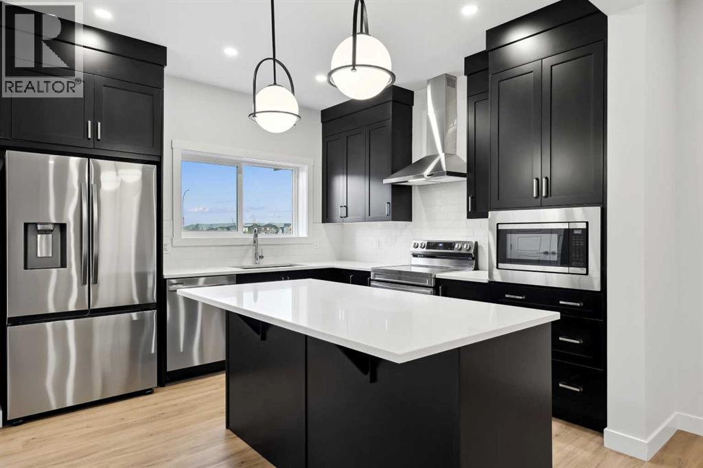Welcome to the Luna model in Cochrane’s Fireside community, offering 1,528 sq. ft. with 3 bedrooms and 2.5 bathrooms. The main floor is designed with an open layout that connects the great room, dining area, and kitchen. In the kitchen you’ll find quartz countertops, Chantilly Lace shaker cabinetry, a Blanco Silgranit sink in Truffle, Boardwalk matte white backsplash, and a Mistral island that provides both workspace and seating.Upstairs, the primary bedroom includes a walk-in closet and ensuite. Two additional bedrooms, a full bathroom, and upper-level laundry complete this floor. Interior finishes include maple-stained railing with nickel spindles, Cozy White luxury vinyl plank, Off Shore carpet, and Micabella LVT. This home includes a side entry with basement rough-ins, a 9’ foundation, and gas lines to the range and BBQ. A gravel parking pad is also included.Fireside is a well-established Cochrane community with two schools, nearby shops and services, playgrounds, and an extensive pathway system. It also offers quick access to Highway 22 for commuting into Calgary or exploring the mountains. Photos are representative, colours and finishes may vary. *Area size was calculated by applying the RMS to the blueprints provided by the builder. (id:6769)