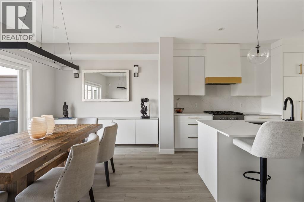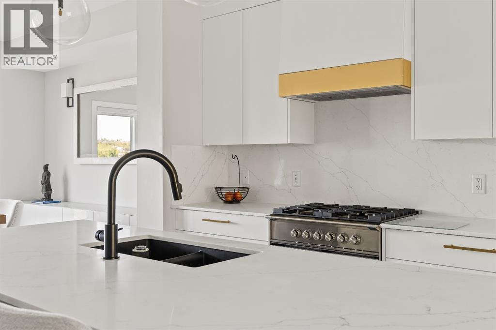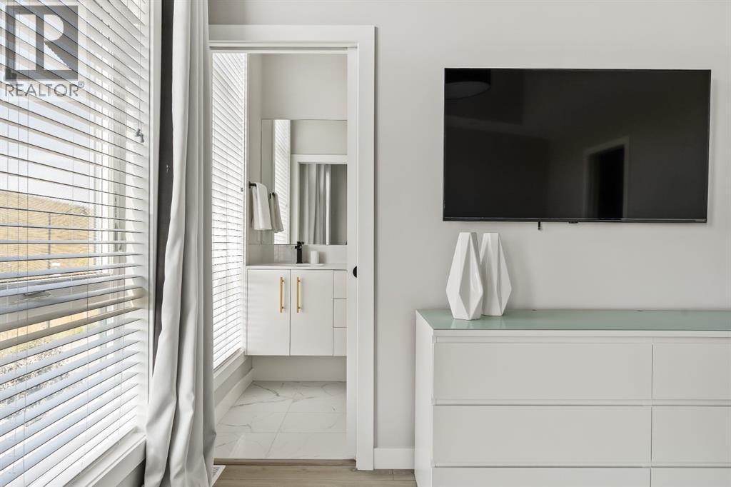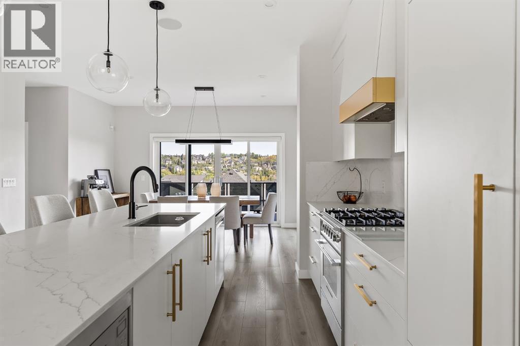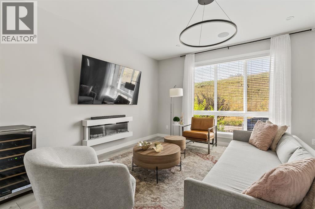 Executive living at its finest on Calgary’s WONDERFUL Upper Westside. This three storey townhome, just three years young, offers 2565 sq ft of living space over three levels with all of the latest design elements. Situated at the top of the hill this home presents a wonderful view to the SE, all the way to the Glenmore reservoir and exposure to a grassy knoll and the mountains to the west – a COMFORTING sense of space. With its east/west orientation, and generous window treatments, this home follows the sun, offering a WARM & BRIGHT home, on all three levels. On arrival you will enjoy the broad, open plan under 9’ ceilings with resilient luxury vinyl flooring, designer lighting and window treatments and a kitchen featuring Fisher Paykal s/s appliances, including a gas stove. There is a generous dining space here, leading directly to a large rear deck, measuring 240 sq ft – WITH A VIEW! Upstairs you will find a double primary floor plan. The primary bedroom sits under 10’ ceilings with a view to the west and features a 5pc en suite with quartz countertops and large walk-in closet. The second primary enjoys views to the Glenmore reservoir, a 4pc en suite and large walk-in closet. The lower level has been developed for entertaining with a large rec/media space leading directly to a second large covered deck… 423 sq ft with a fantastic HOT TUB… WITH A VIEW! This level also enjoys a large flex space, which easily accommodates a sleeping space for guests and a 3rd full bathroom. This home offers an attached, HEATED & OVER-SIZED garage, multi media ethernet cabling and 15 B/I speakers throughout and an ELEVATOR serving all four levels! This is a turnkey lifestyle with an ELEVATOR which presents an opportunity to age in place… on Calgary’s Upper Westside!! (id:6769)