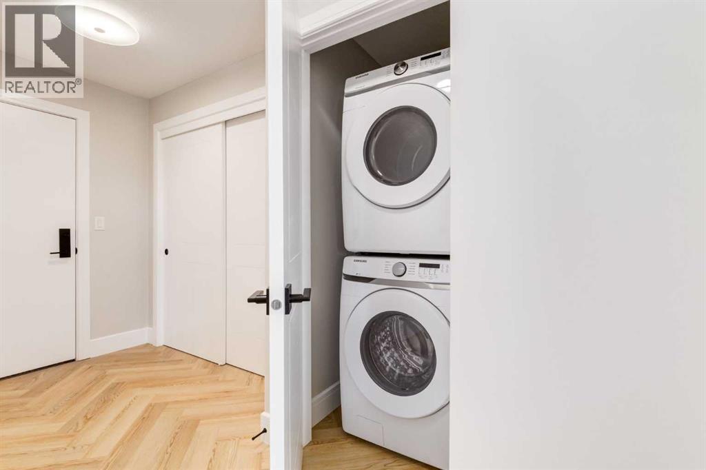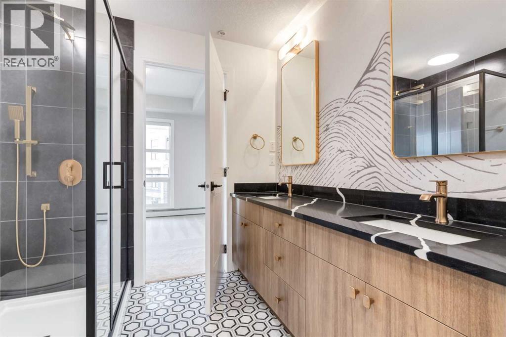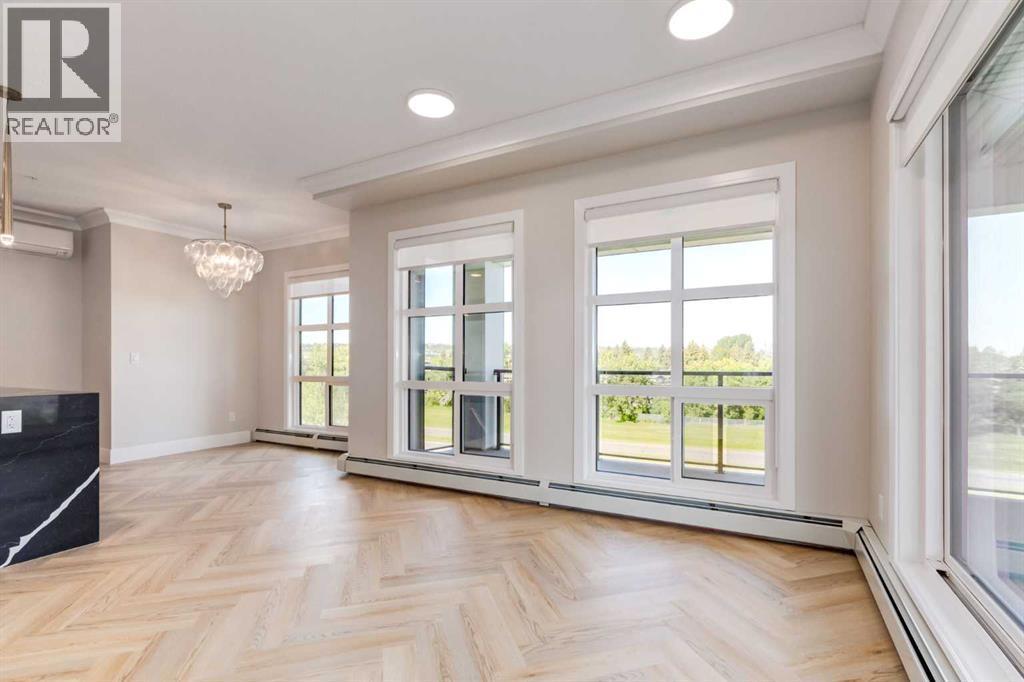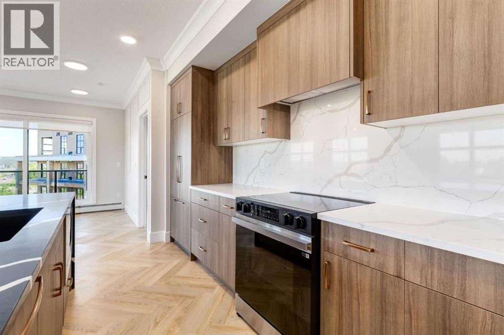 Discover the "Argento" floorplan by award-winning Rohit Homes—a beautifully designed 2-bedroom, 2-bathroom corner unit that offers the perfect balance of style and functionality. Located on the second floor in the sought-after Quesnay at Currie Barracks, this bright and airy home is flooded with natural sunlight, making it an ideal sanctuary for downsizers or anyone seeking a serene, low-maintenance lifestyle. Featuring the sophisticated Neo-Classical color palette, blending timeless elegance with modern finishes.. Designed by the award-winning Louis Duncan-He, the unit includes premium finishes such as 9' ceilings, quartz countertops with a waterfall edge, a quartz backsplash, full-height cabinetry, a stainless appliance package, bespoke light fixtures, and window coverings. The open-concept layout seamlessly integrates the kitchen, dining, and living areas, perfect for both relaxing and entertaining. The spacious primary bedroom includes a private ensuite, while the second bedroom and additional full bath offer comfort and flexibility for guests or a home office. Step outside to enjoy a large SE facing balcony, extending your living space into the outdoors. This pet-friendly and AIRBNB-friendly building offers titled heated underground parking and plenty of visitor spaces. Ideally located minutes from downtown, Mount Royal University, and the vibrant amenities of 17th Ave and Marda Loop, the Argento floorplan is a rare gem. Limited units are available—secure your slice of modern living today! **Photos are taken from existing building of the same models. Not of the exact unit ** (id:6769)