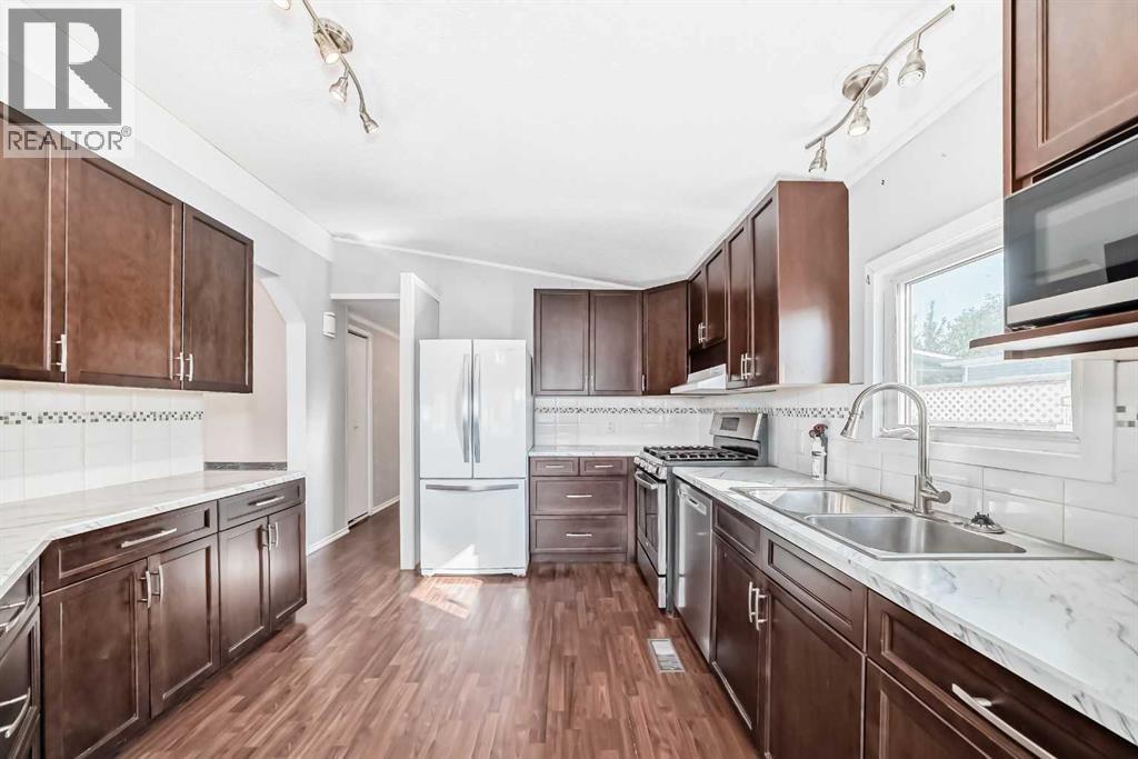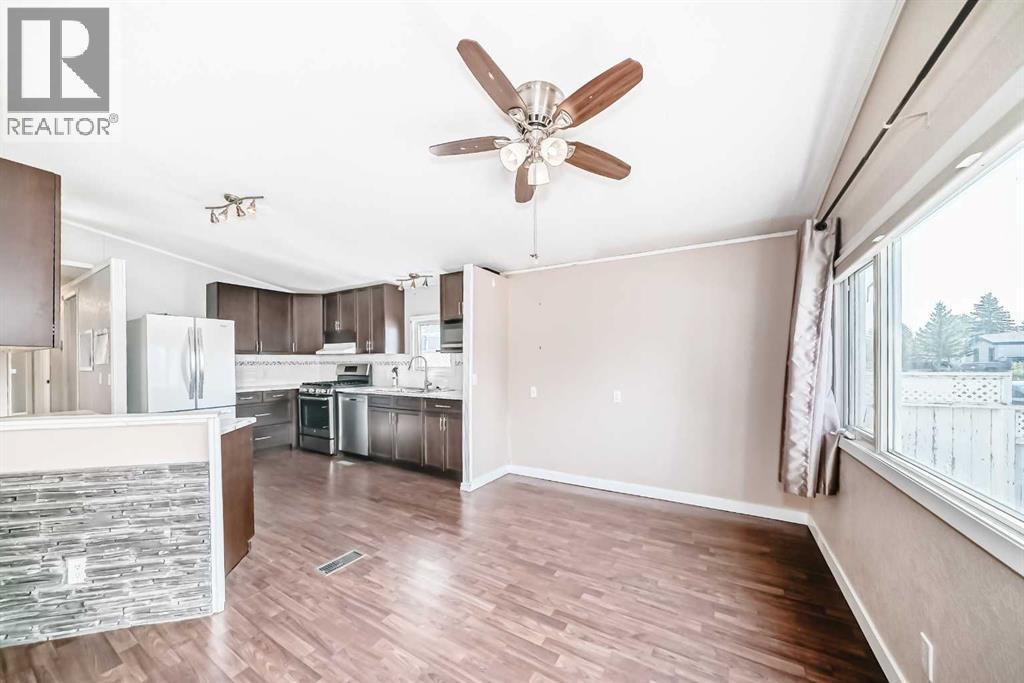 Incredible value awaits in this spacious three-bedroom double-wide mobile home tucked into a quiet neighborhood in Strathmore. The kitchen has been updated with newer appliances, countertops, and cabinets, and flows seamlessly into the dining and living room area. This home comes with many extras including vinyl windows, newer shingles, central air conditioning, a shed, vacuum system with attachments, a newer hot water tank, and a newer washer and dryer.The master bedroom features a three-piece ensuite and plenty of closet space. Two additional bedrooms and a four pce bath finish off this single level home. A side mudroom with backyard access houses the laundry area for added convenience. The front foyer opens to a porch, and outside there is room for two vehicles in the side driveway. There is an addition to the side of the mobile home which could be an office or just a huge mud room that goes into the backyard that is fully fenced and landscaped . Located close to all the amenities including schools, hockey arena, swimming pool, and just minutes from shopping, this home offers convenience without being right in the heart of town. With easy access to the Trans-Canada Highway and only a short half-hour drive to Calgary, this property combines affordability with lifestyle. Don’t miss the chance to make it yours. (id:6769)
