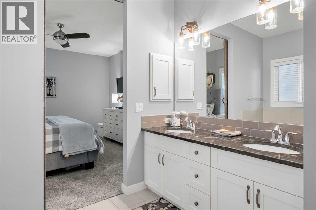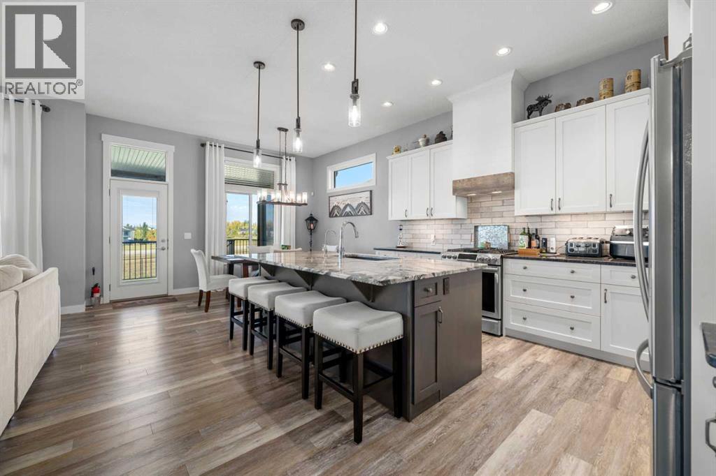 Gorgeous upgraded walkout 3 bedroom bungalow backing onto greenspace with great mountain views. This beautiful home has central air conditioning, epoxy flooring in a heated oversized garage, underground sprinklers, amazing landscaping, a full width deck with a gazebo and remote control screens, gemstone lighting and many other upgrades. As you drive up to the property you will love the low maintenance front yard and the great curb appeal on this home. Inside you will find beautiful LVP flooring, high ceilings and a fabulous layout. This home was designed to take full advantage of the west facing views, featuring huge windows throughout the back of the property, providing tons of natural light and allowing you a great view of our awesome sunsets. The spacious living room has a gas fireplace - making it a great place to relax after a long day! Entertain in the large dining room or step out side onto the massive deck and then you can choose whether to sit in the covered, screened area or be out in the open enjoying your BBQ! The kitchen is stunning and features a huge granite island with room for 4 bar stools, stainless steel appliances, including a gas stove, extended height white cabinets and a walkthrough pantry. The laundry room has a lovely barn wood counter above the washer and dryer, a sink with granite counter, drink fridge and a useful built in storage bench. The spacious master bedroom has a walk in closet and features a beautiful barn wood door leading to the 5 piece ensuite with large shower, soaker tub and dual sinks with granite counter. Completing this level is a half bathroom. In the fully finished walkout basement there is a large family/games room with built in speakers and lots of natural light from the large windows. There is a gym area with rubber flooring and mirrors - perfect for the fitness enthusiast or for a children's play area. There are 2 large bedrooms both with great sized closets and a 3 piece bathroom with a large shower. The furnace ro om has lots of storage with built in shelving. Did I mention this home has a water softener, a reverse osmosis system for your drinking water and gemstone lights both front and back? The yard has beautiful landscaping and includes a large concrete pad outside of the walkout basement, a paved patio area, a gravel firepit area, underground sprinklers and beautiful flower beds and trees. The 22x24ft heated garage features high ceilings, epoxy flooring, slat walls, tire rack and a bicycle pulley system - a garage to be proud of! This home is stunning and should be viewed to be appreciated! View 3D tour/Multi Media/virtual tour. (id:6769)