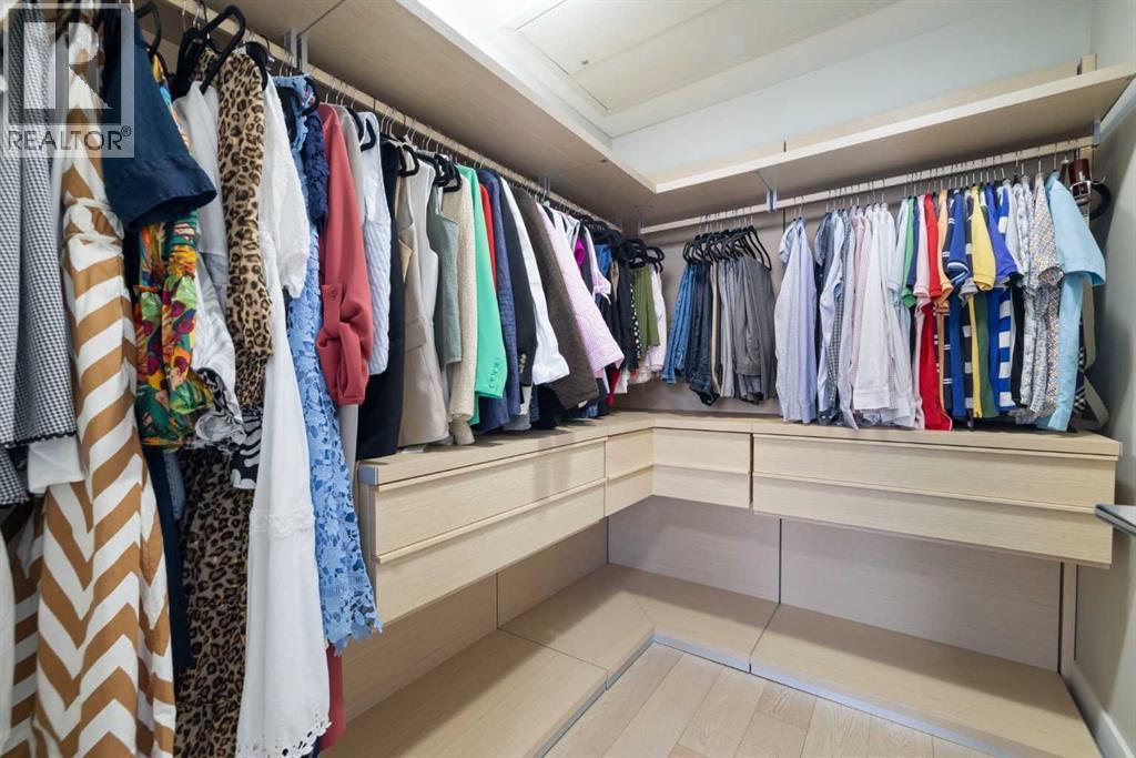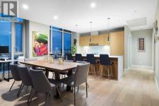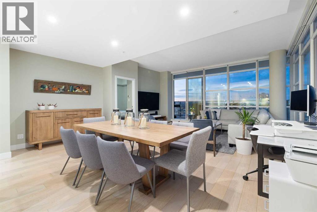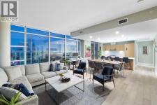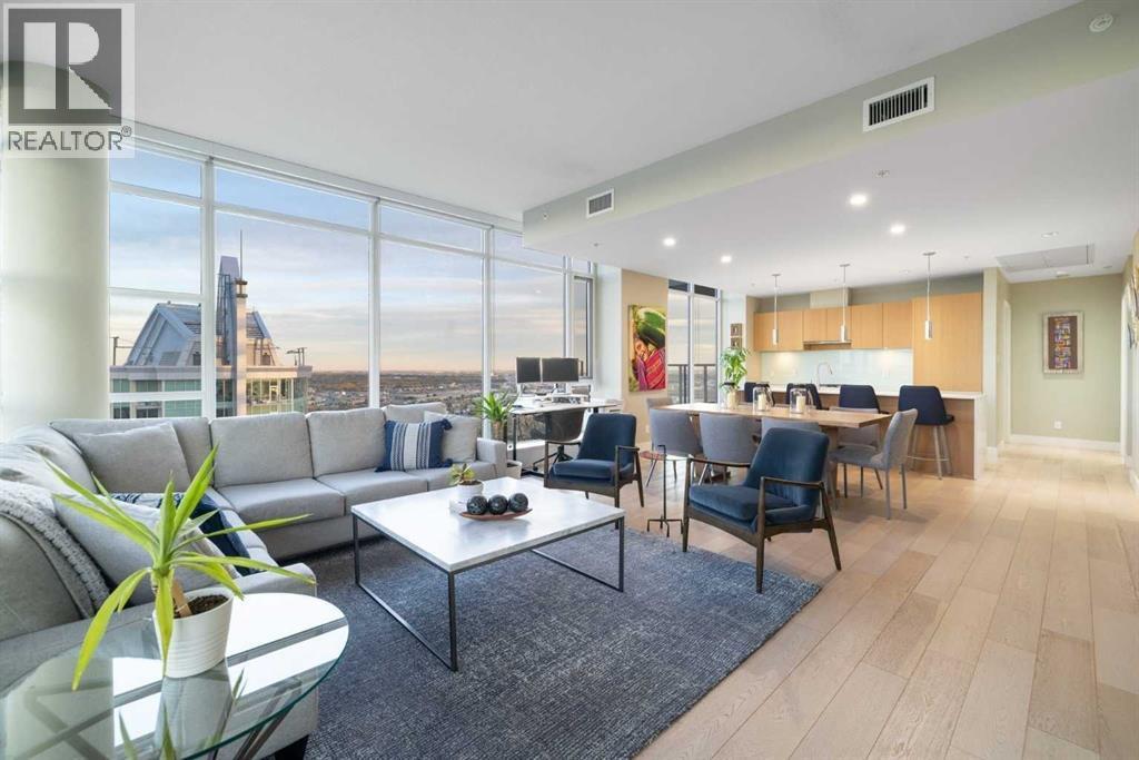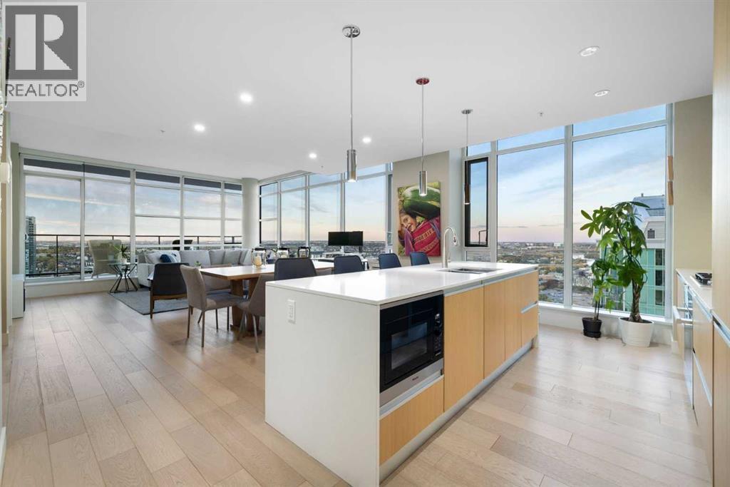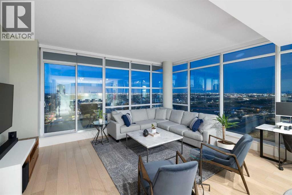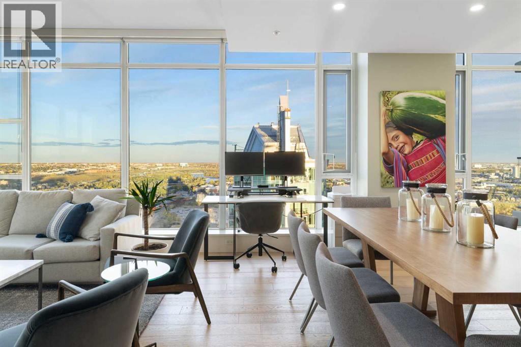 This beautiful, airy sub-penthouse in The Guardian North Tower welcomes you into a world of light and breathtaking views. Located on the 36th floor, this two-bedroom contemporary condo offers 1,260 sqft of refined urban living. The northeast corner location (one of only 4 units) on the 36th floor provides 270-degree views from the downtown skyline to the West, sweeping across to the North and wrapping all the way around to the East. Featuring floor to ceiling windows, 10-foot ceilings and terraces off the principal living spaces, the master bedroom, and the second bedroom. The main living area seamlessly flows with an open floorplan concept, and the bedrooms are ideally located for privacy and seclusion. Exceptional finishings such as engineered hardwood flooring, ceramic tiling, and blackout blinds offer comfort and luxury. Upgrades include an expansive pantry off the kitchen, and double blinds throughout offering either custom black-out or filtered light options. The living room affords downtown skyline views, and long-range views to the north and the east. Step onto the terrace through the patio doors and bring the stunning views into a spectacular perspective. Nestled between the living room and the kitchen, the dining room is elegant and offers spacious accommodation for a table of 8-10. The kitchen is a chef’s dream with Italian Armony Cucine cabinetry, a full Miele appliance package, and a large full waterfall island with seating for 4-5. Quartz counter-tops and a glass backsplash complete a stylish and beautiful kitchen that creates seamless entertaining and comfortable family living. Providing comfort with sophisticated style, the main living area and terrace are ideally suited for entertaining and modern living, all while enjoying unrivaled views, sunsets, and extraordinary downtown city lights. The primary bedroom is a tranquil retreat and offers outstanding city views, a 5-piece ensuite with double vanity, quartz countertops, and an upgraded, custo mized large walk-in closet. The second bedroom is optimally located on the opposite side of the floor plan and has its own 4-piece ensuite with quartz counter-tops. This bedroom also has two closet spaces with built-ins and its own private terrace with stunning east and north views, ensuring privacy and comfort for guests or family members. In-suite stacked laundry and an expansive pantry, and elegant powder room round out the living space. This unit comes with two side-by-side titled parking stalls in the underground heated parkade, in a coveted location directly opposite to elevator access. It also has an assigned storage locker, and all the amenities of The Guardian. Full-service amenities include a concierge, security, a state-of-the-art fitness facility, Residents Club, and outdoor garden terrace. Experience the convenience and excitement of living just steps away from shopping, restaurants, the new BMO Event Centre, and Pixel Park offering a dog park and sports courts, and the new Scotia Place (id:6769)