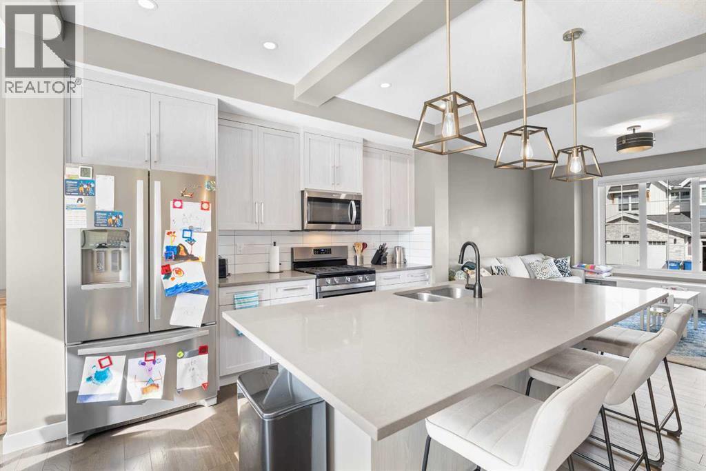 Welcome to this stunning, condo-free townhome located in the award-winning community of Coopers Crossing in Airdrie, AB. Built in 2019 by a respected local builder, this meticulously maintained home offers over 2,300 square feet of beautifully developed space and combines thoughtful design, quality craftsmanship, and premium upgrades throughout.Situated on a quiet, family-friendly street, this 4-bedroom home boasts remarkable curb appeal, a fully landscaped yard, and a rear detached double garage, providing both function and charm. Step inside to find an inviting open-concept main floor with central air conditioning, perfect for year-round comfort.The heart of the home is the chef-inspired kitchen, featuring upgraded stainless steel appliances, an oversized quartz island, custom cabinetry, and stylish fixtures—ideal for entertaining or casual family living. Adjacent, the bright and spacious living and dining areas flow seamlessly, creating a welcoming atmosphere for gatherings.Upstairs, retreat to the luxurious primary suite, complete with a 4-piece ensuite featuring a walk-in shower, double vanity and toilet closet as well as a generous walk-in closet. Two additional bedrooms, a full bath, and a conveniently located laundry area complete the upper level.The fully developed basement includes a fourth bedroom, a spacious family or recreation room, and plenty of storage—offering versatility for a guest suite, home office, or gym.Enjoy peace of mind knowing this property is move-in ready, with high-end finishes, well-maintained systems, and friendly, community-minded neighbors all around. Located within walking distance to parks, pathways, schools, and local amenities, and just minutes to all that Airdrie has to offer, this home truly combines comfort, location, and lifestyle.Key Features:Over 2,300 Sq Ft of Developed Living SpaceBuilt in 2019 by a Local BuilderCondo-Free, No Condo Fees4 Bedrooms | 3.5 BathroomsLarge Primary Bedroom with 4-Piece Ensuite & Wa lk-In ClosetCentral Air ConditioningUpgraded Appliances ThroughoutOversized Kitchen IslandFully Landscaped YardRear Detached Double Car GarageLocated on a Quiet Street in Coopers CrossingSurrounded by Wonderful NeighborsThis is a rare opportunity to own a high-quality home in one of Airdrie’s most sought-after neighborhoods. Don’t miss your chance—book your private showing today! (id:6769)