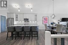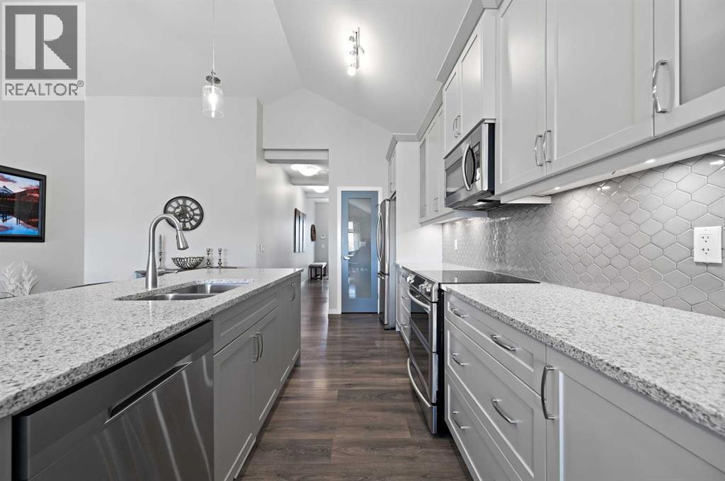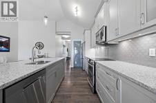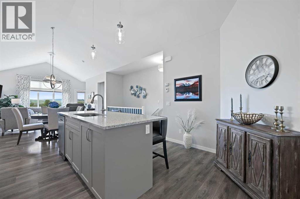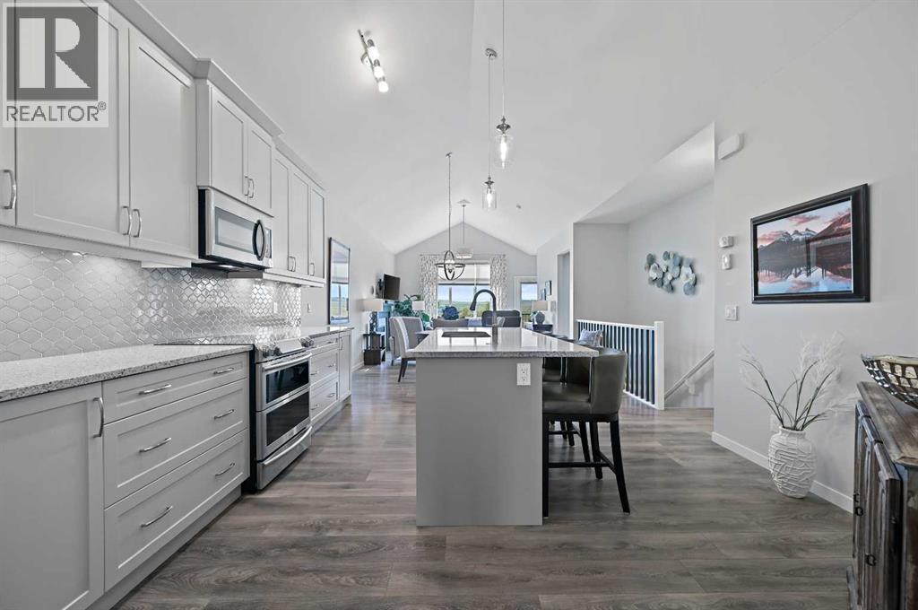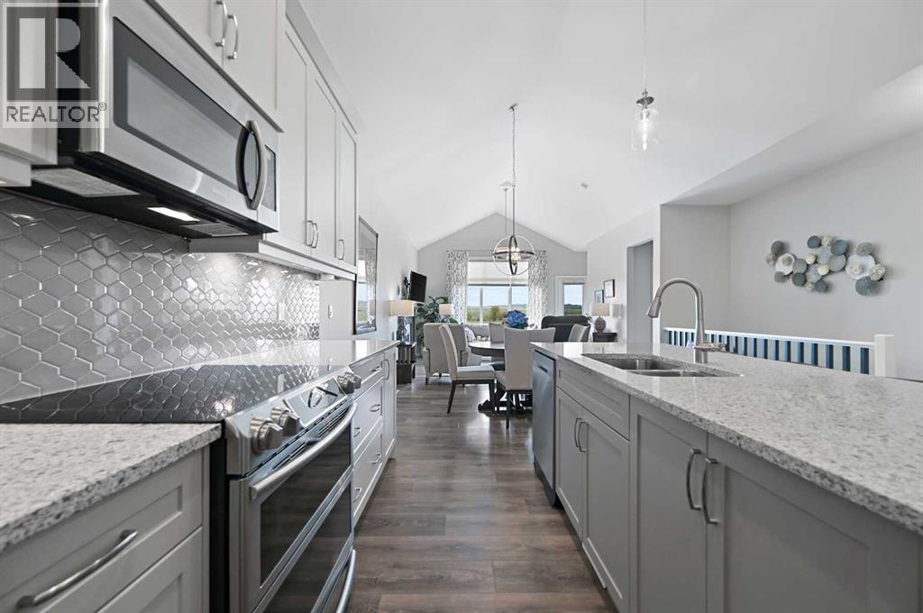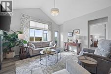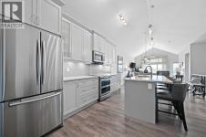 Immaculate Bungalow Villa – Private, Modern & Maintenance-Free. This immaculate bungalow villa blends upscale design with practical living, offering the perfect home base for empty nesters, snowbirds, or anyone ready to enjoy a simplified, low-maintenance lifestyle. Located in a peaceful small-town community, this home provides the quiet comfort of no neighbours behind you, allowing for exceptional privacy and relaxed outdoor enjoyment from your sunny south-facing backyard that is complete with a maintenance free composite deck with a powered awning. Inside, vaulted ceilings and luxury vinyl plank flooring create an airy, modern feel across the main level. The heart of the home is the open-concept kitchen, designed to impress with its stainless-steel range, quartz countertops, freshly refinished extended-height cabinetry that is in like new condition with modern designer colors, and large island that flows seamlessly into the dining area and cozy living room—complete with a gas fireplace. Whether you're hosting family or enjoying a quiet evening, this space feels both welcoming and refined. The double attached garage is more than just a place to park—it's a lifestyle feature. Offering secure, convenient access to the home, it provides extra space for storage, hobbies, or winter protection, and is especially valuable for those seeking a lock-and-leave setup for travel or seasonal living. Your main-floor primary suite offers peaceful retreat with a spa-style ensuite featuring double sinks, quartz counters, soaker tub, and a separate shower. Enjoy the added comfort of main-floor computer workstation area and main floor laundry just steps away, making daily tasks effortless. The fully finished lower level adds flexible living space that adapts to your lifestyle: a large media/family room for movie nights or gatherings with the added functionality of a wall bed for guests, a full bathroom, and a 2nd bedroom. Additional high-value features include Hunter Douglas bl inds, custom draperies on the living room and primary bedroom windows, central air conditioning and central vacuum to round out a home that’s as functional as it is beautiful. Whether you’re downsizing, seeking a seasonal retreat, or simply ready for a life of ease, this bungalow villa offers the peace, privacy, and turnkey convenience you’ve been looking for in a friendly, smaller community where lifestyle comes first. (id:6769)