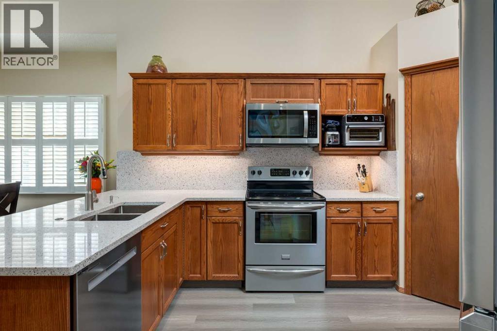 OPEN HOUSE SATURDAY OCTOBER 25th from 2 to 4 pm. This fully developed BUNGALOW in the established Millrise neighbourhood has been updated extensively over the past 5+ years, with almost 2500 square feet of developed space over two levels. There is a long list of quality interior and exterior improvements. Nicely located on a quiet CUL-DE-SAC with a pie shaped lot, the home has abundant curb appeal with a full exterior update by Lummerding Exteriors in 2022, including “heavy wall vinyl” and “class 4” hail impact roof shingles. The double attached garage is heated and finished with “Trimlight” LED lights on front & back of home. The main floor is an open concept layout with VAULTED CEILINGS in primary bedroom, foyer, living, dining, and kitchen areas, plus a skylight. Interior features include updated luxury plank vinyl flooring, custom window coverings, quartz countertops, several updated windows, chrome finish hardware, and updated light fixtures. The kitchen includes a pantry with stainless appliances and adjacent dining area plus eating bar. The exterior door off the living & dining area opens onto a HUGE DECK and backyard siding onto GREEN SPACE with walking paths. There is a large, newer window in the family room with a gas fireplace with fan. The primary bedroom offers a walk-in closet and 5-piece ensuite bath with jetted tub and separate shower. The main floor also includes a den with glimpse of mountains, convenient half bathroom, and laundry room with newer washer & dryer and back hall closet. The lower level includes a four piece bathroom, two spacious bedrooms and recreation room, each with walk-in closets. If you are looking for a home in MOVE-IN CONDITION and QUIET LOCATION, this property is ready for new owners. (id:6769)
