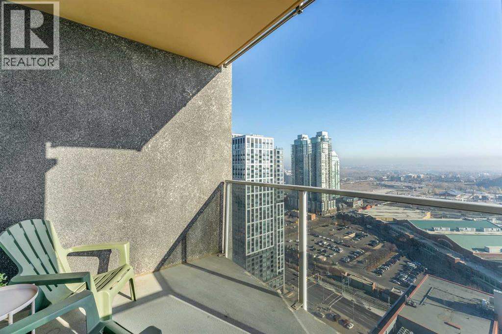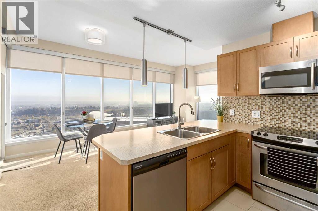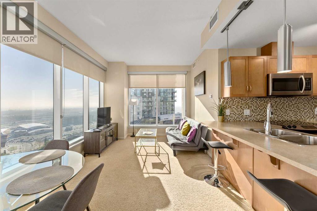 Welcome to the prestigious Alura! This expansive 800 sq. ft. corner unit on the 27th floor boasts soaring 9-foot ceilings and breathtaking eastward views, perfect for witnessing Alberta’s stunning sunrises. Crafted with modern living in mind, the open-concept layout seamlessly connects a spacious kitchen and living area, making it the perfect setting for both relaxation and entertainment. Both bedrooms are generously proportioned, with the primary suite offering a walk-through closet leading to a stylish four-piece ensuite. Floor-to-ceiling windows flood the home with natural light, framing panoramic views of the Calgary Stampede.This unit includes a titled underground parking stall, a dedicated storage locker, and access to visitor parking. Residents benefit from premium amenities, including an on-site fitness center, resident lounge, full-time concierge service, and round-the-clock security. Ideally located within walking distance of downtown, 17th Avenue, Stampede Park, Starbucks, Shoppers Drug Mart, Sunterra Market, and the Victoria Park C-Train station, it also offers quick access to scenic river pathways for cycling and walking.Experience the best of 18+ living. Schedule your private viewing today and discover this remarkable home! (id:6769)