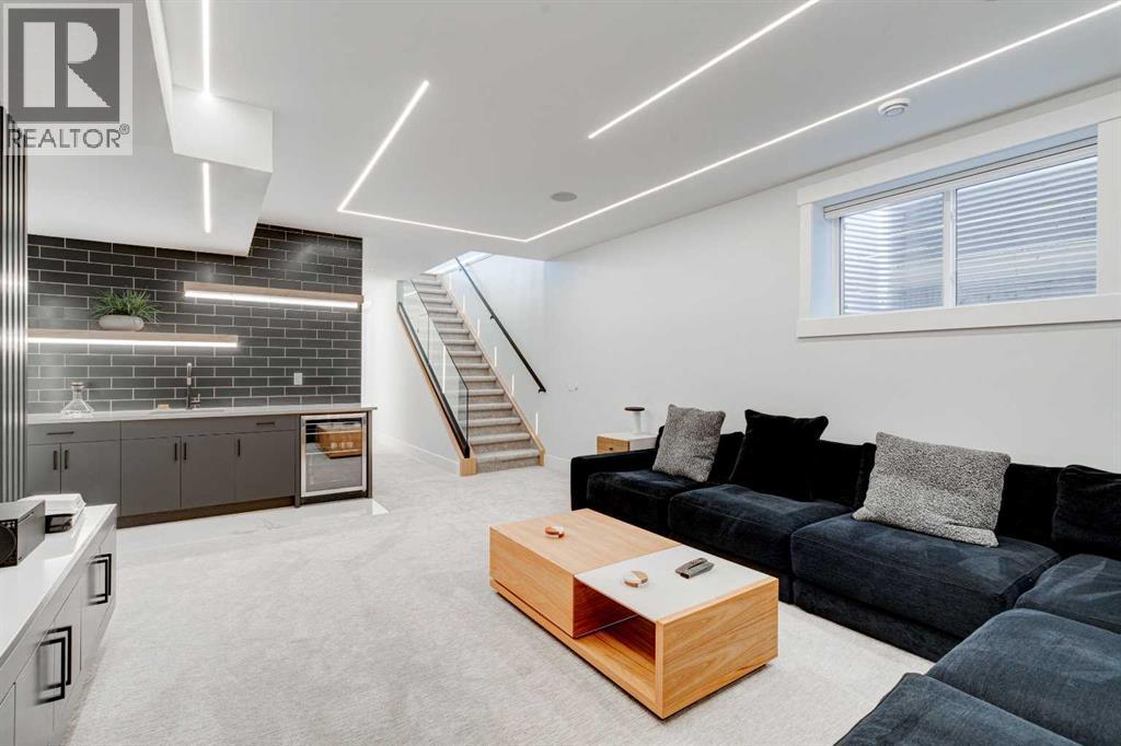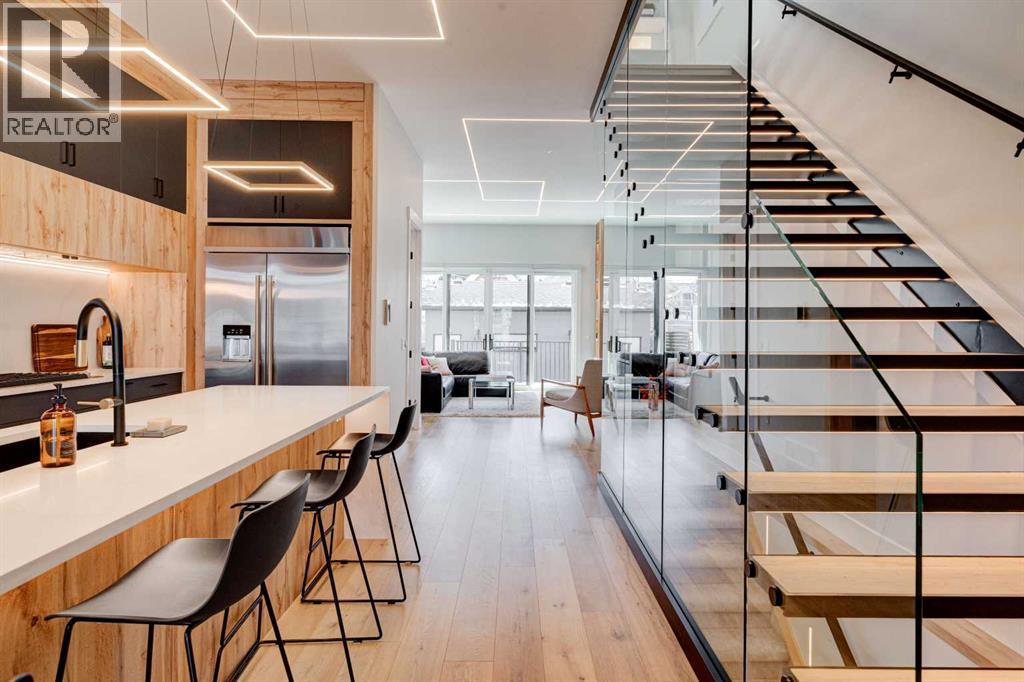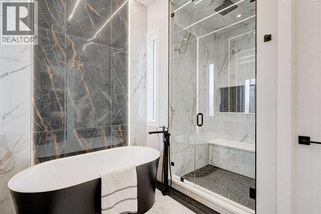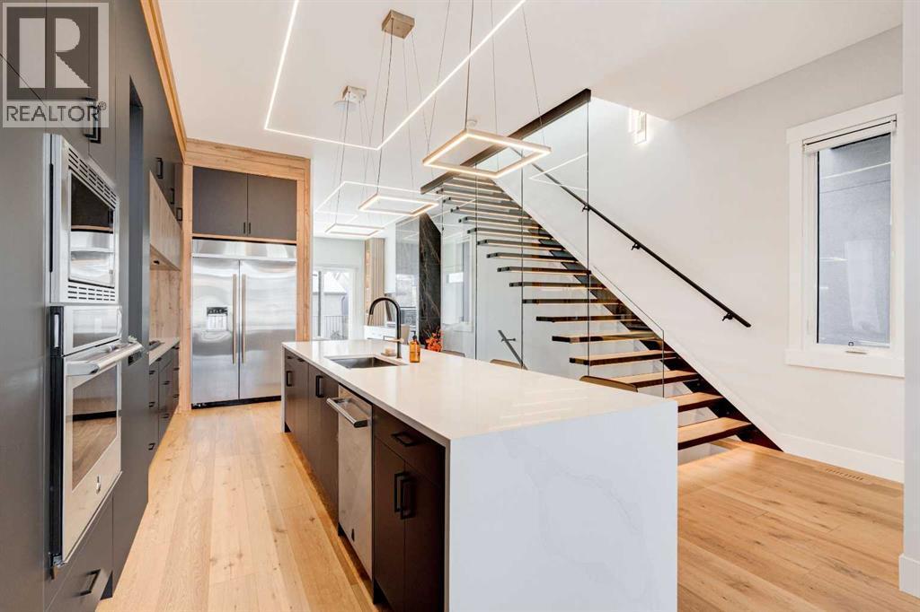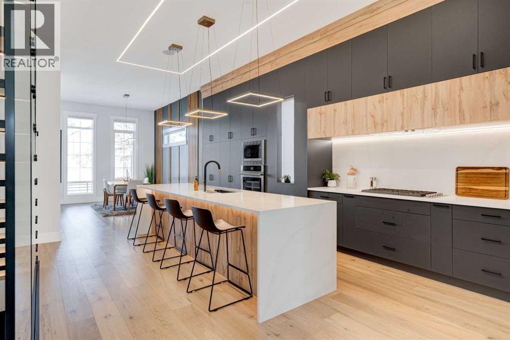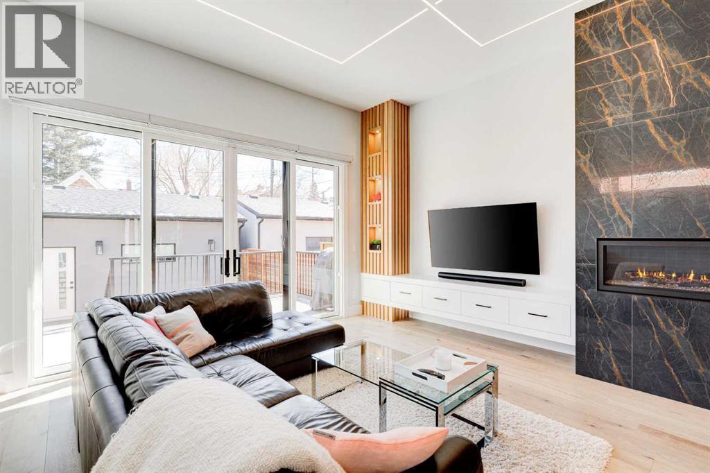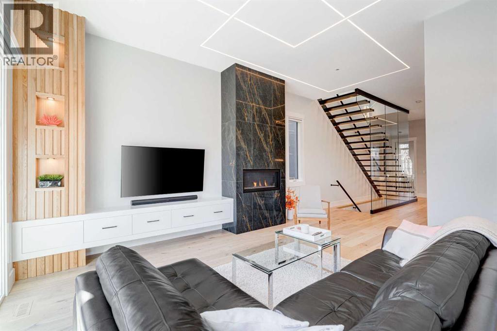 Step into refined luxury in this stunning modern home, perfectly situated in UPPER MOUNT ROYAL! Designed for effortless living, this 4-bed, 3.5-bath masterpiece offers endless impeccably crafted living space w/ high-end finishes and upgrades throughout! The striking brick exterior, lush artificial turf, and integrated lighting create an unforgettable first impression. Inside, the foyer welcomes you w/ soaring ceilings, wide-plank hardwood floors, and a stylish built-in bench w/ wood slat wall. A bright, open dining space w/ designer lighting and modern wood accented wall flows seamlessly into the high-end kitchen, a true showstopper w/ a massive waterfall quartz island, full-height flat panel cabinetry, and premium appliances. The sleek black and wood-accented cabinetry is complemented by under-cabinet lighting and island pendants that add a warm, inviting glow. The living room is anchored by a statement fireplace w/ floor-to-ceiling black marble w/ gold veining, creating a sophisticated yet cozy retreat. A wall of sliding glass doors extends the living space onto the deck, where extra-wide steps lead to the beautifully landscaped backyard featuring PRIVACY SCREENS, landscape lighting, and underground sprinklers for easy maintenance. An elegant powder room w/ a black vessel sink and a side mudroom w/ built-in storage round off the main level. A custom glass-enclosed staircase w/ open riser stairs and LED accent lights leads to the second floor, where the primary retreat is a true sanctuary. The spacious bedroom features modern ceiling lighting, arched windows, a sliding barn door, and a spa-inspired ensuite. The ensuite is a masterpiece w/ black and gold-veined marble, a freestanding tub, a glass-enclosed STEAM SHOWER w/ a rainfall head, and HEATED FLOORS for ultimate comfort. Two additional bedrooms, a sleek 4-piece bath w/ upgraded shower glass and heated floors, and a well-appointed laundry room w/ extra storage, a sink, and geometric tile flooring complete this level. The fully finished basement is the ultimate entertaining space, featuring a spacious media room w/ a built-in entertainment unit, a stylish wet bar w/ a full-height backsplash and wine storage, and an exercise area w/ rubber flooring and a mirrored wall. A fourth bedroom and another full bathroom w/ upgraded shower glass complete this level. This home is fully equipped w/ SMART HOME TECHNOLOGY, allowing you to control heating, cooling, lighting, security, and even the fireplace – all from your phone! The built-in sound system ensures seamless audio throughout, while Hunter Douglas AUTOMATED BLINDS add a touch of convenience. Additional features include A/C, security cameras, and an insulated DOUBLE GARAGE roughed-in for a gas heater. Located just steps from 17th Ave, this home offers unbeatable access to top restaurants, cafés, shopping, parks, and some of Calgary’s best schools. Enjoy the perfect blend of urban convenience and upscale living in one of the city’s most sought-after neighbourhoods! (id:6769)