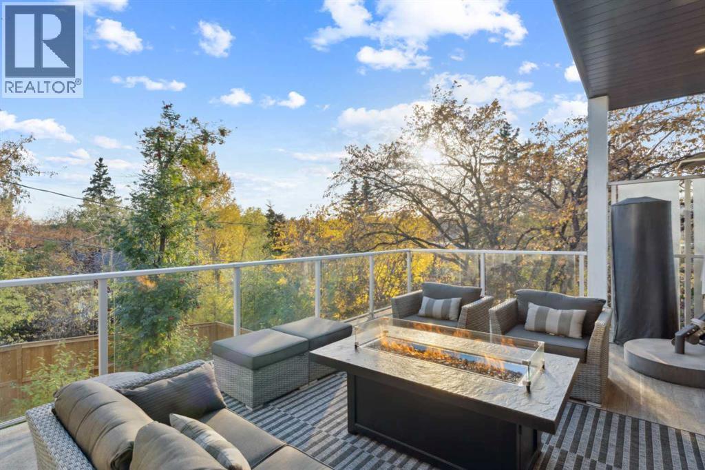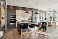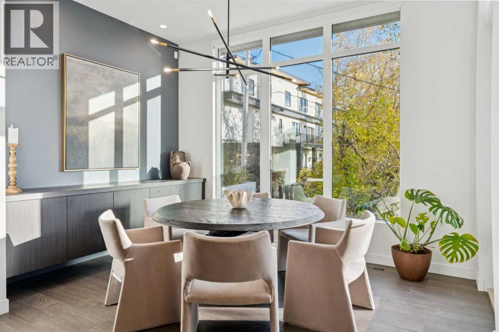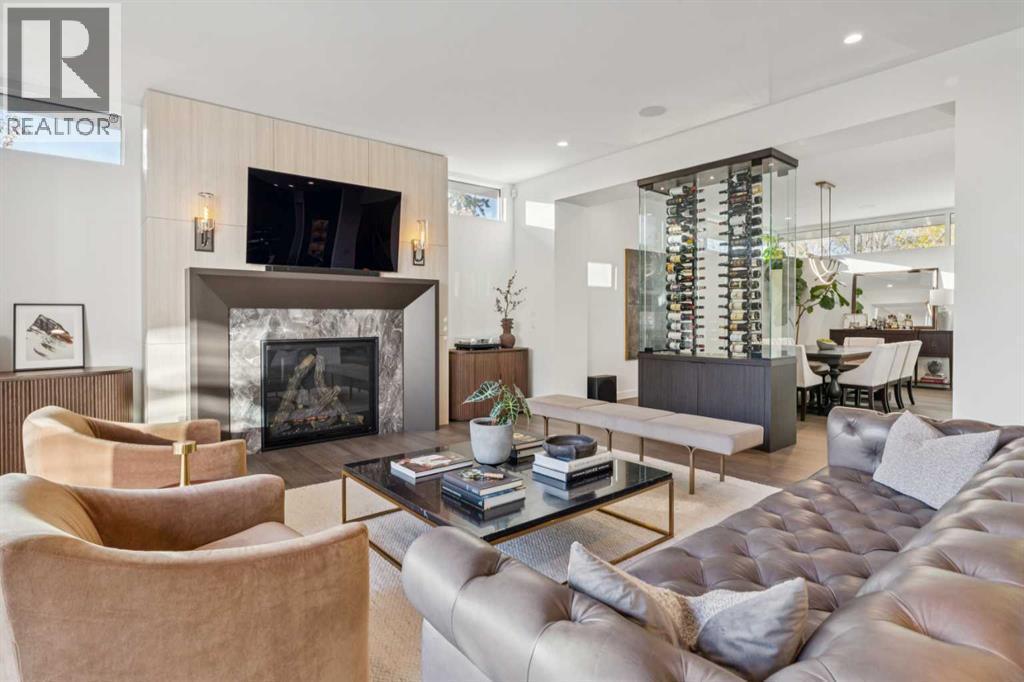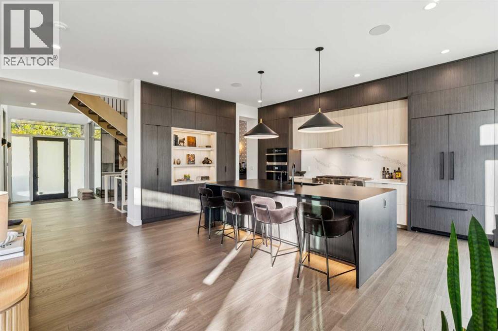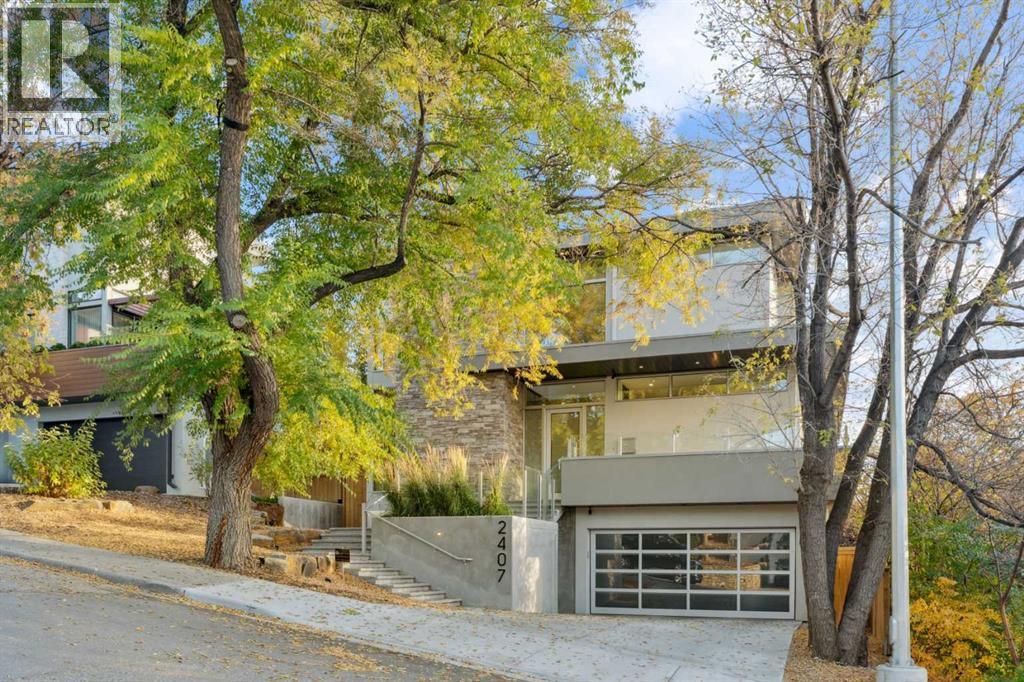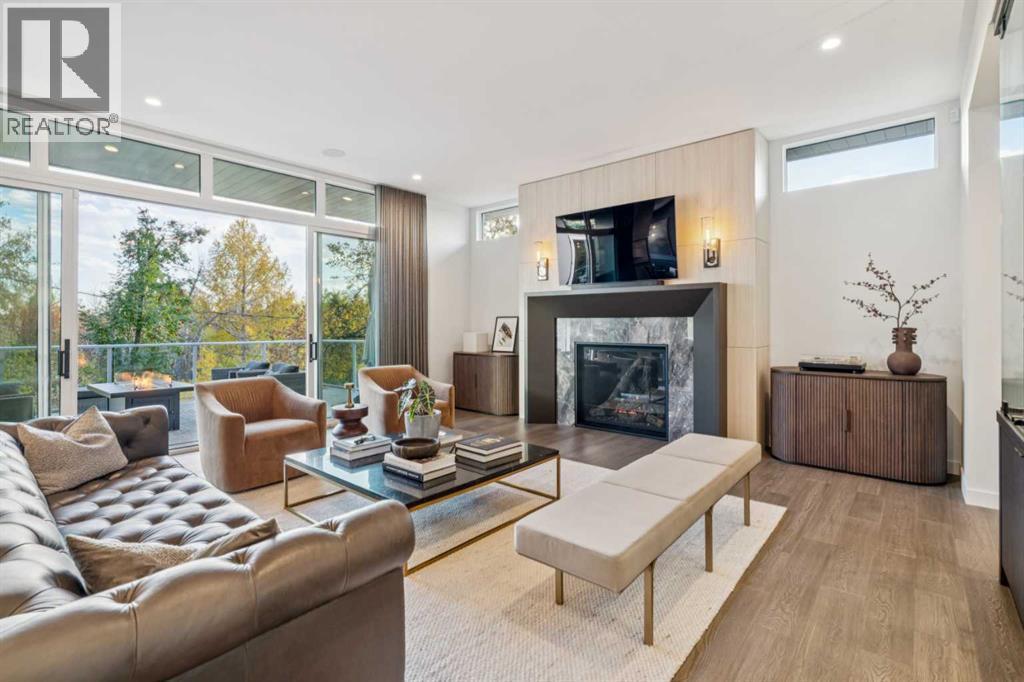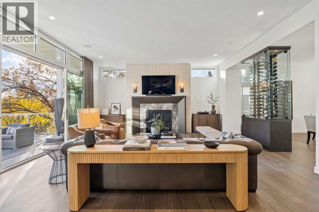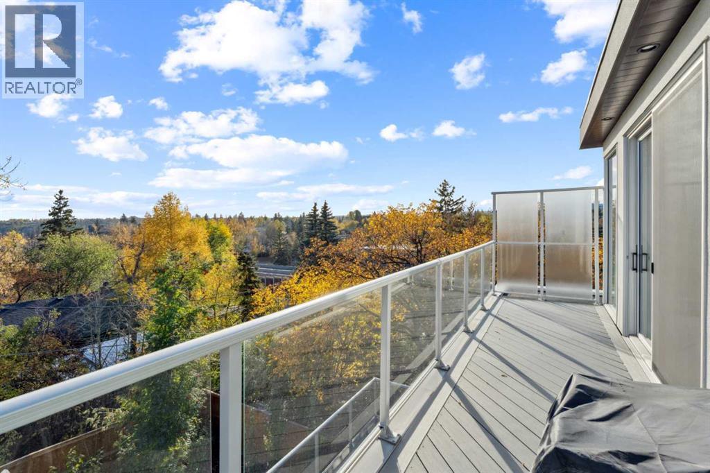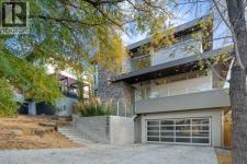 Tucked away in an exclusive enclave just moments from Kensington and the downtown core, this modern architectural residence offers refined living in a truly exceptional setting. Designed for both comfort and sophistication, the home combines thoughtful design, superior craftsmanship, and cutting-edge systems throughout. Built to the highest standards, it features triple-pane windows, 2-zone hydronic in-floor heating in the basement, finished triple garage with floor drains, and a dual-zoned HVAC system. Extensive concrete retaining walls and planters frame the property, while Lutron lighting control, an 8-zone sound system with integrated ceiling and outdoor speakers, and 7.2 surround sound in the recreation room elevate the living experience. Porcelain tiles imported from Italy, Caesarstone countertops, and solid core interior doors reflect the quality that defines every detail. The main level showcases expansive open-concept living with 10-foot ceilings and floor-to-ceiling south-facing windows that flood the home with natural light. The kitchen is a true centrepiece—equipped with integrated JennAir appliances including a 48” gas range top, and a walk-in coffee bar/pantry with prep sink and wine fridge. A striking glass wine wall with floating racks separates the formal dining area, which comfortably hosts 12–14. The stone-clad fireplaces anchors the living room, while a glass-enclosed main floor den provides a serene workspace. Step outside to the 25’ x 16’ deck overlooking a secluded, landscaped south yard surrounded by mature trees. Upstairs, three spacious bedrooms each feature a private ensuite. The primary suite is a sanctuary with a spa-inspired 5-piece ensuite bathroom with heated floors, custom window coverings, an impressive 21-foot walk-in closet with extensive built-ins, and a private south-facing balcony offering sweeping and serene views of the Bow River Valley. A large, well-appointed laundry room completes the upper level. The walk-out basement inc ludes a guest suite with attached bath, a recreation room with gas fireplace and wet bar, and access to a covered patio and your oversized triple garage with heated floors. The home has security cameras, central vacuum, irrigation, EV charging, and hot tub hookup. Perfectly positioned for an active lifestyle, this residence is steps from the Bow River pathways, West Hillhurst tennis and pickle-ball courts, and offers quick access to 16th Avenue for effortless weekend escapes to the mountains. Minutes from top schools, hospitals, shopping, the C-train, and downtown Calgary—this is contemporary living at its most complete and luxurious. (id:6769)