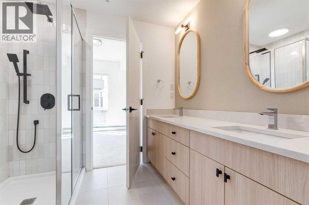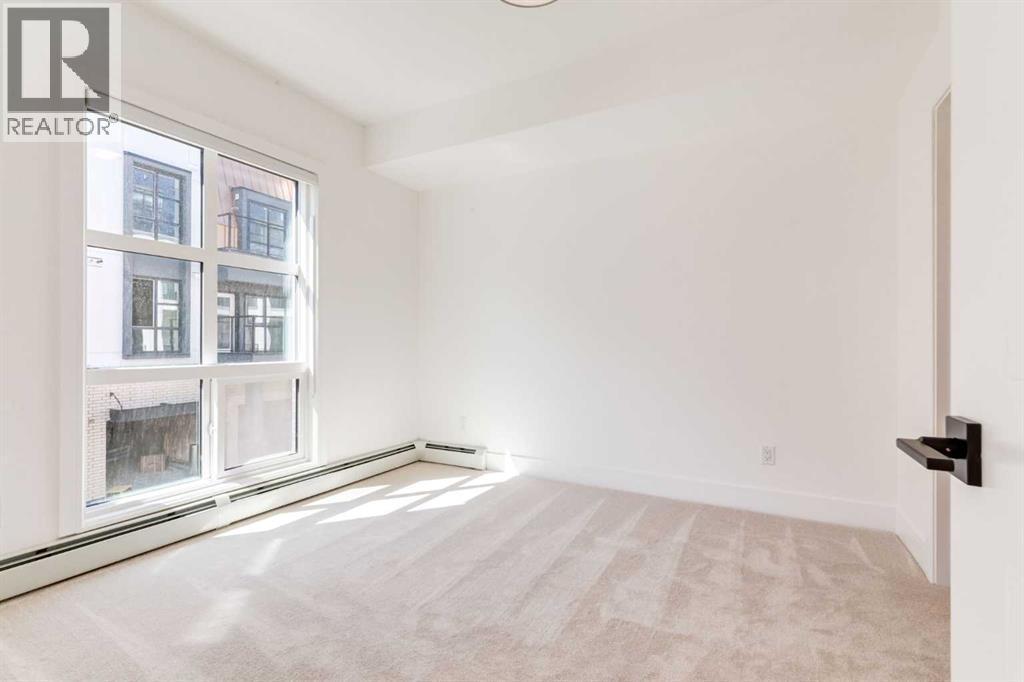 Discover the "Argento" floorplan by award-winning Rohit Homes—a beautifully designed 2-bedroom, 2-bathroom corner unit that offers the perfect balance of style and functionality. Located on the second floor in the sought-after Quesnay at Currie Barracks, this bright and airy home is flooded with natural sunlight, making it an ideal sanctuary for downsizers or anyone seeking a serene, low-maintenance lifestyle. Featuring the tranquil Ethereal Zen color palette, the interior exudes calm and sophistication. Designed by the award-winning interior designer, the unit includes premium finishes such as 9' ceilings, quartz countertops with a waterfall edge, a quartz backsplash, full-height cabinetry, a stainless appliance package, bespoke light fixtures, and window coverings. The open-concept layout seamlessly integrates the kitchen, dining, and living areas, perfect for both relaxing and entertaining. The spacious primary bedroom includes a private ensuite, while the second bedroom and additional full bath offer comfort and flexibility for guests or a home office. Step outside to enjoy a large SE facing balcony, extending your living space into the outdoors. This pet-friendly and AIRBNB-friendly building offers titled heated underground parking and plenty of visitor spaces. Ideally located minutes from downtown, Mount Royal University, and the vibrant amenities of 17th Ave and Marda Loop, the Argento floorplan is a rare gem. Limited units are available—secure your slice of modern living today! **Photos are taken from existing building of the same models. Not of the exact unit ** (id:6769)