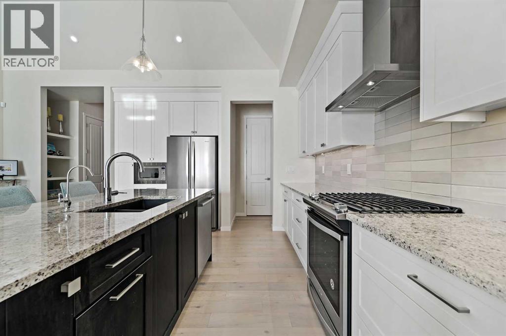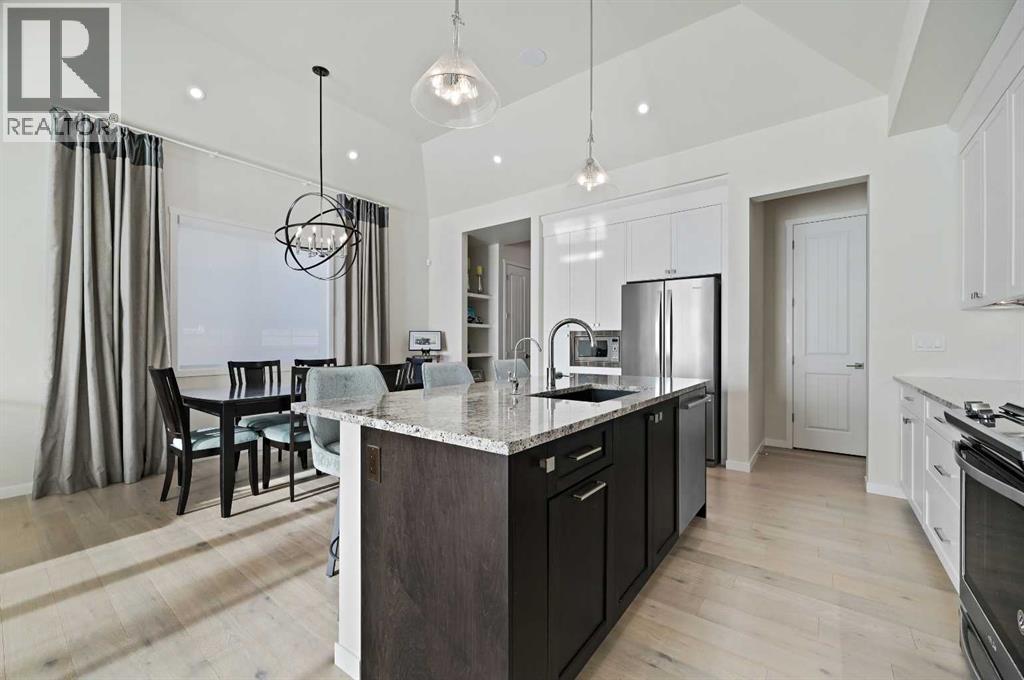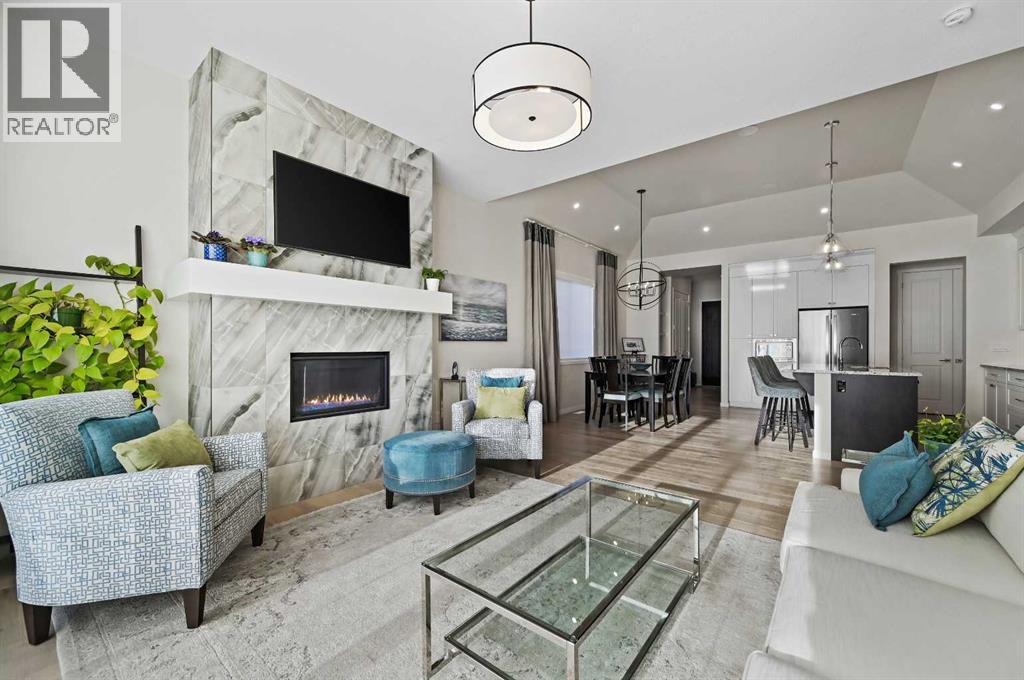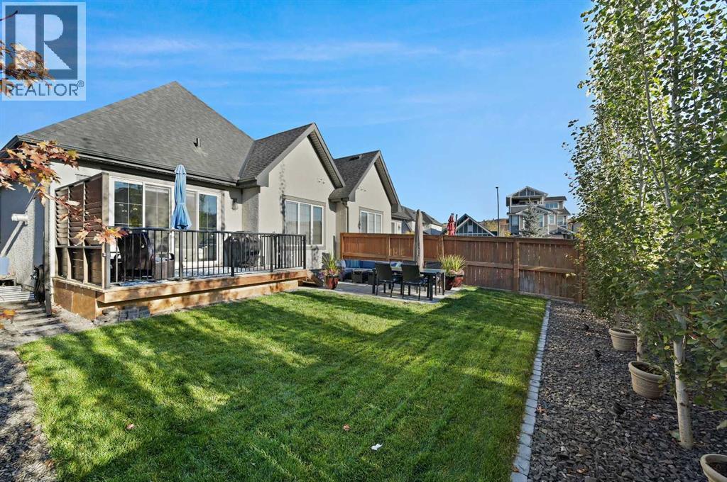 Experience refined living in this luxurious semi-detached villa bungalow, perfectly situated in the prestigious community of Riverstone — just steps from the tranquil Bow River and scenic walking and running paths. From the moment you step inside, you’ll be captivated by the home’s 10-foot ceilings, open-concept design, and abundant natural light that create an atmosphere of effortless elegance. The chef-inspired kitchen is a true showpiece, featuring stainless steel appliances, granite countertops, and an oversized island ideal for both culinary creativity and stylish entertaining. The living room exudes sophistication with its gas fireplace as the focal point and double patio doors leading to a private backyard oasis. The primary suite is a serene retreat complete with a spa-like ensuite featuring a dual vanity, heated floors, water closet, and a beautifully appointed California walk-in closet. Conveniently located off the mudroom/laundry area, a two-piece powder room and double attached garage provide both practicality and ease. Lower level offers exceptional versatility with 2 spacious bedrooms, a full bathroom, and an expansive recreation area perfect for entertaining or relaxing. A dedicated gym, home office, or den adds even more flexibility to suit your lifestyle. Every closet throughout the home is generously sized, offering abundant storage and thoughtful design at every turn. Additional highlights include central air conditioning, professional landscaping, Gemstone exterior lighting, fully finished drywalled garage, underground irrigation, and upgraded dishwasher, washer and dryer. Discover the perfect harmony of comfort, style, and quality craftsmanship in this remarkable Riverstone residence — a home that truly exceeds expectations! (id:6769)