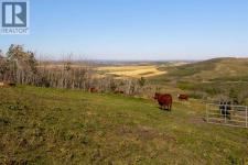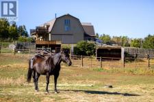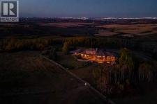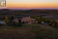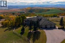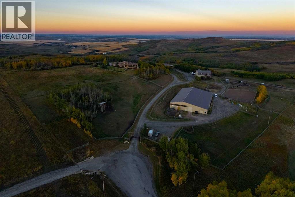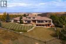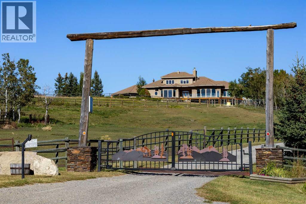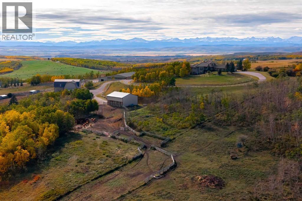 Welcome to an extraordinary 160-acre country estate where luxury, privacy, and equestrian excellence unite within a natural wildlife corridor. Panoramic views of the Rocky Mountains and Calgary skyline provide a breathtaking backdrop to this serene yet conveniently located property.A gated, rail-lined drive leads to a striking 3,483 sq.ft. custom walkout bungalow with over 6,200 sq.ft. of developed living space. Designed with light, proportion, and warmth in mind, this five-bedroom, five-bath residence features soaring ceilings, expansive windows, cherry hardwood floors, and handcrafted millwork. The flagstone foyer opens into a great room centered around a wood-burning stone fireplace that embodies both comfort and sophistication.The gourmet kitchen is a showpiece of design and function with granite countertops, bird’s-eye maple cabinetry, hand-forged hardware, high-end appliances, a copper hood fan, and cedar-lined vaulted ceiling. It flows seamlessly into the dining and living areas, extending to a wraparound cedar deck that frames sweeping mountain and pasture views—perfect for entertaining or quiet evenings outdoors.The spacious primary suite overlooks the Rocky Mountains and offers a private retreat with a gas adobe-style fireplace, deck access, walk-in closet, and spa-inspired ensuite. Thoughtful utility spaces include a custom mudroom, oversized pantry, and an exceptional laundry room. The fully developed walkout level provides a large recreation area with a second stone fireplace and abundant natural light.The home’s timeless exterior features low-maintenance adobe-style stucco, natural stone accents, a clay tile roof, and covered verandas surrounded by professionally landscaped grounds with underground irrigation. Every element reflects an effortless blend of elegance, practicality, and connection to the land.Beyond the home lies a world-class equestrian facility designed for year-round enjoyment. A 70’x160’ indoor riding arena with excellent footing and natural light adjoins a main working barn featuring six box stalls, four tie stalls, a wash rack, heated tack room, and comfortable viewing lounge with full kitchen, laundry, and bathroom. A large garage bay provides ample room for trailers and equipment.A separate hip-roof barn includes 2,400 sq.ft. of inviting living quarters—ideal for staff, guests, or extended family—above a fully insulated and heated shop with additional stalls. Outdoor amenities include a 100’x150’ arena, multiple rail-lined paddocks, each with heated waterers and shelters and hay storage. A seasonal creek, rolling pasture, and aspen groves weave through private riding trails that invite exploration.A 3,000-gallon cistern, two wells, and a rainwater catch system support residential, agricultural, and equine needs, ensuring efficiency and sustainability.Only 28 minutes from South Calgary, 15 to Okotoks, 20 to Spruce Meadows, and 10 to Strathcona-Tweedsmuir School, this estate redefines country living. (id:6769)