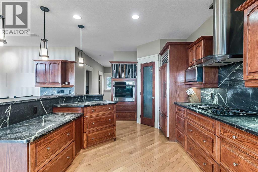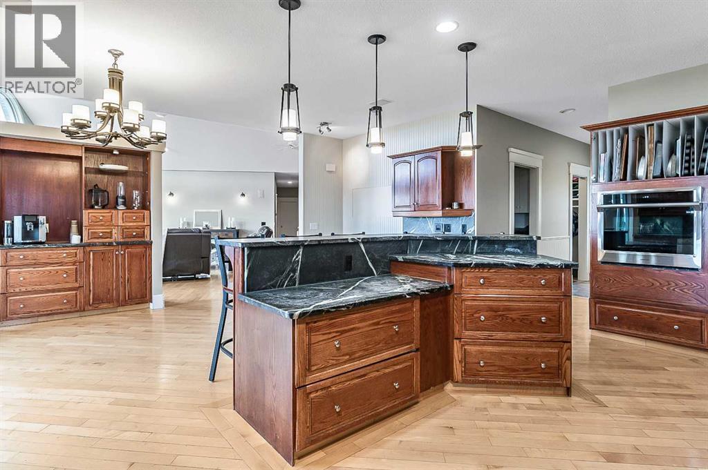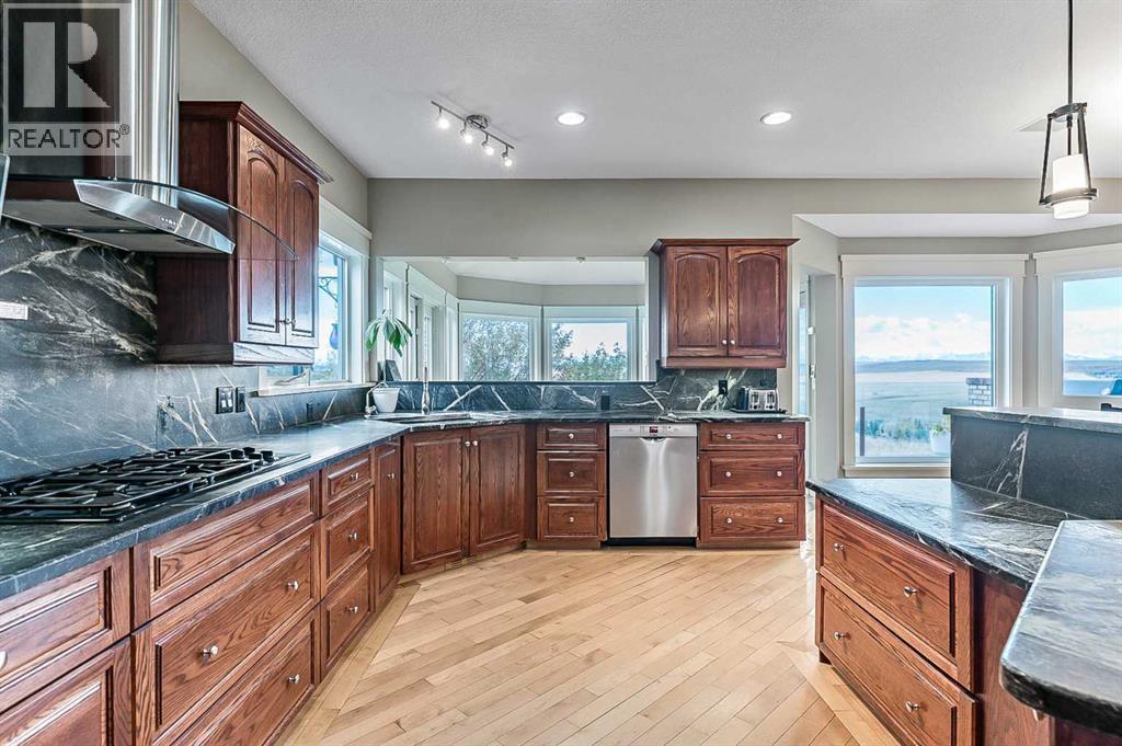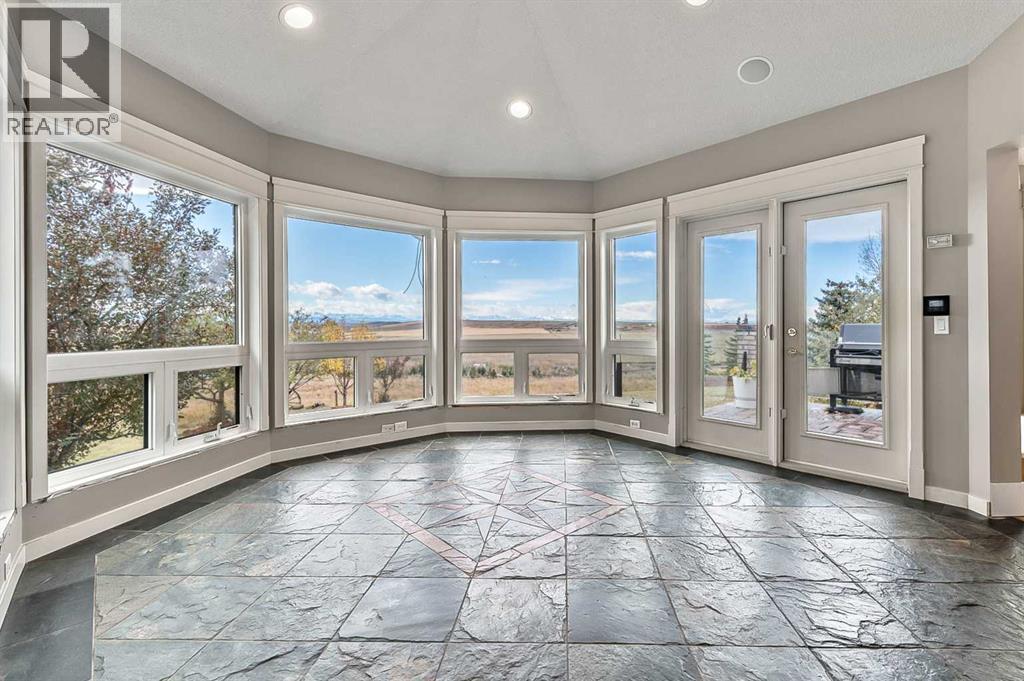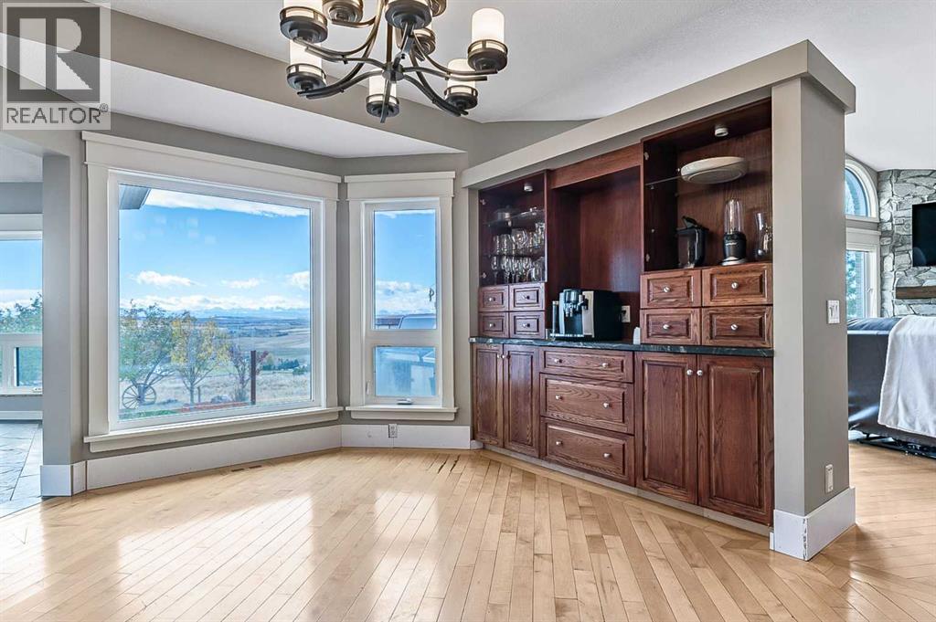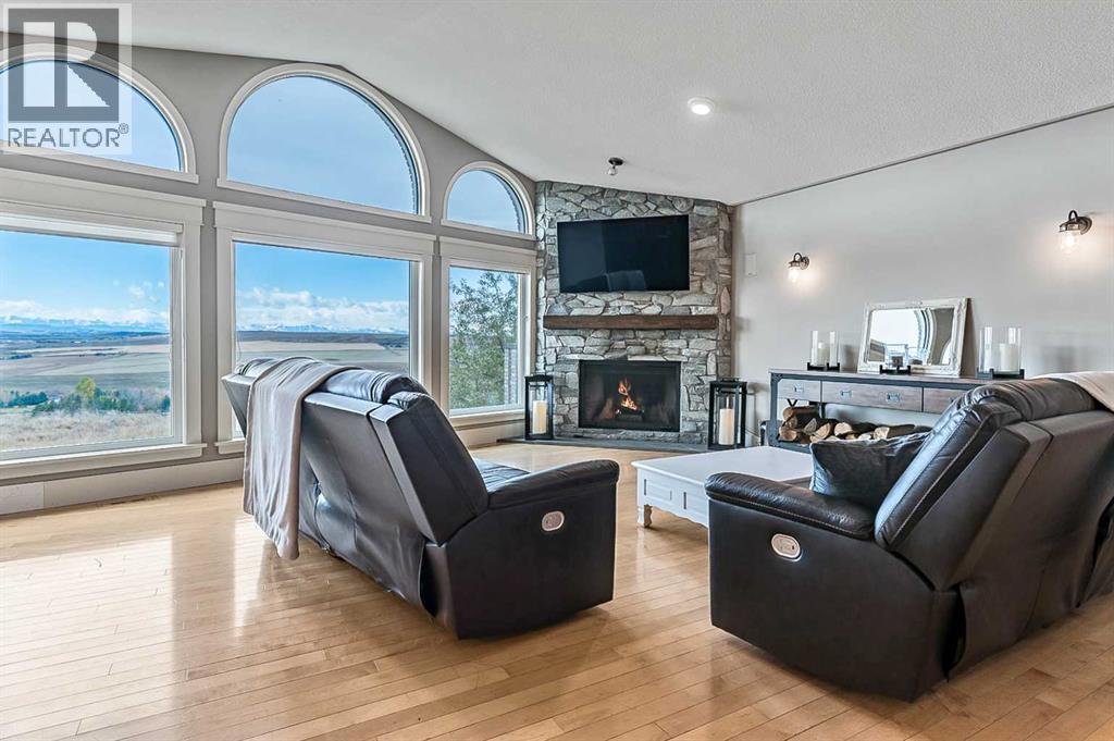 Imagine waking up to breathtaking panoramic views of the Rocky Mountains and rolling valleys, where the sun dips dramatically behind snow-capped peaks each evening—right from your west-facing windows. Nestled on over 55 acres of prime agricultural land in Rural Foothills County, this exceptional walk-out bungalow delivers 2,450 sq. ft. on the main level plus a fully developed basement, totaling 4,700 sq. ft. of luxurious living space. With 4 bedrooms, 4 bathrooms, office air conditioning, and thoughtful features like a large open kitchen, all-season sunroom/dining room flowing to expansive decks, vaulted living room with a stunning newer stone wood-burning fireplace, and premium hardwood, slate, and cork flooring throughout. The lower level boasts a family room with wet bar and wine cellar, dedicated media room, gym, abundant storage, and cozy lower deck access. Plus, an oversized attached double garage for all your needs.But this isn't just a home—it's a powerhouse property primed for smart investment. Unlock immediate equity through a potential subdivision opportunity! Owner recently submitted a land use redesignation application in order to start the process to potentially split off 13.7 acres of buildable bare land—pending Foothills County approvals—act now before this potentially elevates options and competition!Elevate your lifestyle with unmatched water security: Two excellent water wells —perfect for light irrigation, livestock, or self-sufficiency. The top field is fenced with new 7-strand high-tensile electric fence system, metal gates, and plank accents, plus a paved walking path for serene exploration or convenient at home fitness. Three versatile outbuildings await your vision: A 42' x 84' insulated metal barn with concrete floor, 110/220 power, and water (ideal for expansion); a 36' x 72' metal shop and a 24' x 72' animal shelter. An oversized gravel compound handles equipment, parking, and storage effortlessly.Tucked peacefully off Highway 7 under Alberta's vast blue skies, with mountain and city views blending into the horizon—this is serenity meets opportunity. Don't miss your shot to own this versatile gem before the potential subdivision greenlight changes everything. Schedule your viewing today and step into endless Alberta horizons! (id:6769)