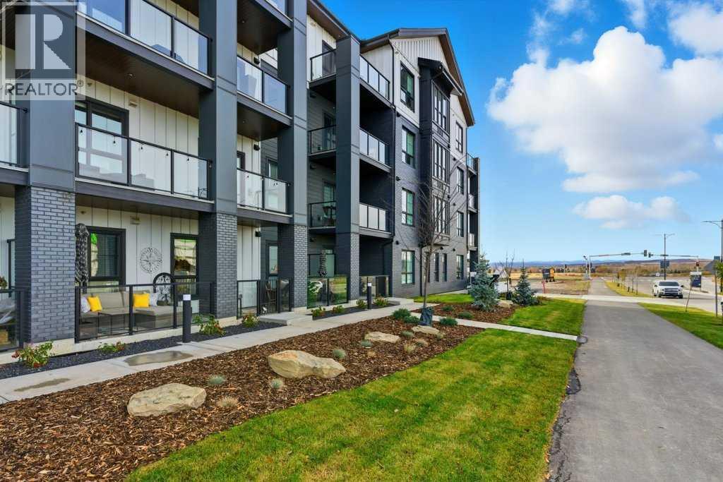 **Open House Sat Nov 15th 12pm-2pm!!** Welcome to #1107, 100 Banister Dr at the beautiful Lawrie Park Condos. This brand new Ava model condo offers the perfect blend of style, functionality, and location. Featuring 2 bedrooms, 2 bathrooms, and over 840 sq ft of thoughtfully designed living space, this home is ideal for anyone seeking comfort, convenience, and modern living. Only 15 minutes south of Calgary in one of Okotoks newest communities, this location has it all. Step inside to discover a bright open-concept layout with luxury vinyl plank throughout the unit, beautiful shaker-style cabinets, extra pull-out drawers in the kitchen, quartz counter tops and a seamless flow between the living, dining, and kitchen areas. The primary suite includes a spacious walk-in shower and a custom linen closet for added storage and organization. What truly sets this unit apart is its massive walkout patio — the largest in the entire complex (34 feet)! Other units in the complex have walkouts as well, but none as big and spacious as this one! Enjoy direct street access, making it easy for guests or pet owners to come and go. A phantom screen door and patio gate add extra comfort and convenience. This pet-friendly building also boasts low condo fees, offering exceptional value and peace of mind. Additional features include underground parking, a separate storage locker, and ample street parking right out front. The location can’t be beat — just steps from basketball courts, community garden plots, playground, bike park, a nearby shopping centre, golf courses, enclosed dog park, and a scenic pond with walking paths. Whether you’re looking to enjoy nature, stay active, or explore local amenities, everything you need is right at your doorstep. Move-in ready and loaded with upgrades, this beautiful condo combines modern finishes with unbeatable functionality. Don’t miss your opportunity to call this brand-new home your own — book your showing today! (id:6769)