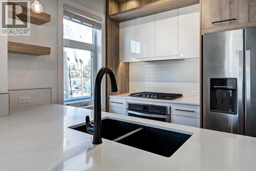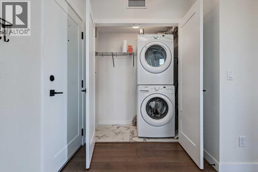 Corner end unit on the 3rd floor in a prime location, on the quiet side of the building. This home has ultra modern interiors with wide plank engineered hardwood flooring, high gloss white cabinetry with soft close drawers and doors, striking black fixtures. Well planned and scaled home with not a square inch of unused space. Gourmet kitchen offers Cesarstone quartz countertops, gas countertop stove, AEG pullout hoodfan, built in wall oven, Double door Stainless steel fridge, and anthracite undermount sink with Kohler touchless Faucet. Private and quiet location with no view obstructions, or neighbours looking into your windows. This building is just 3 blocks to the Shaganappi Point LRT station, and a 5 min drive to DT and 17th ave. An Unbeatable inner city location. Insuite Laundry. One underground Parking Stall. Same floor out of suite storage locker.Secure Bike storage in parkade. (id:6769)