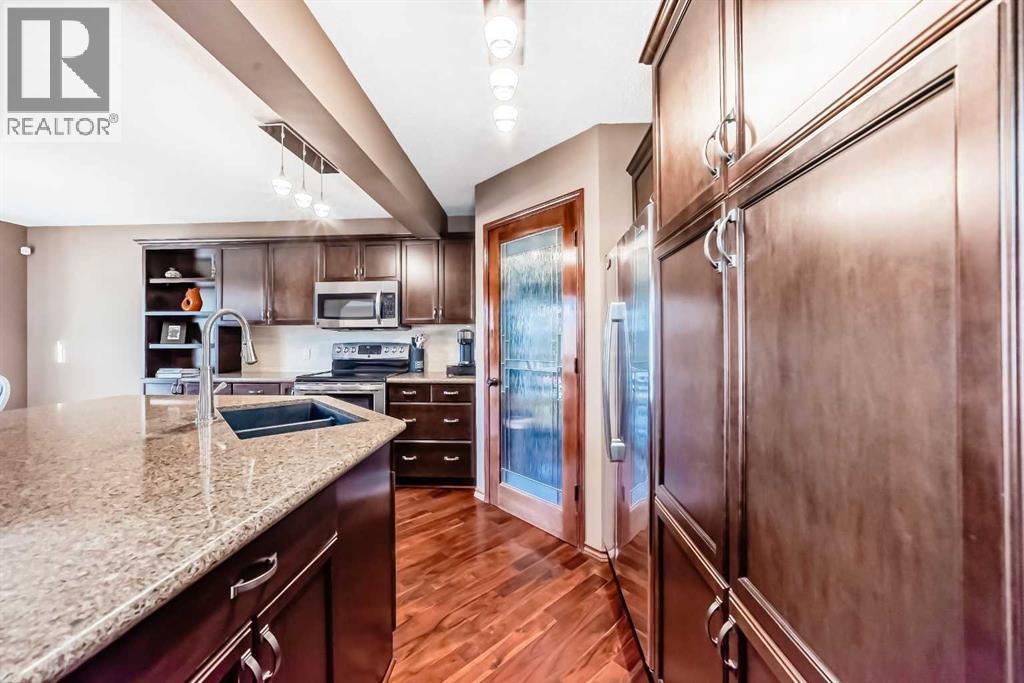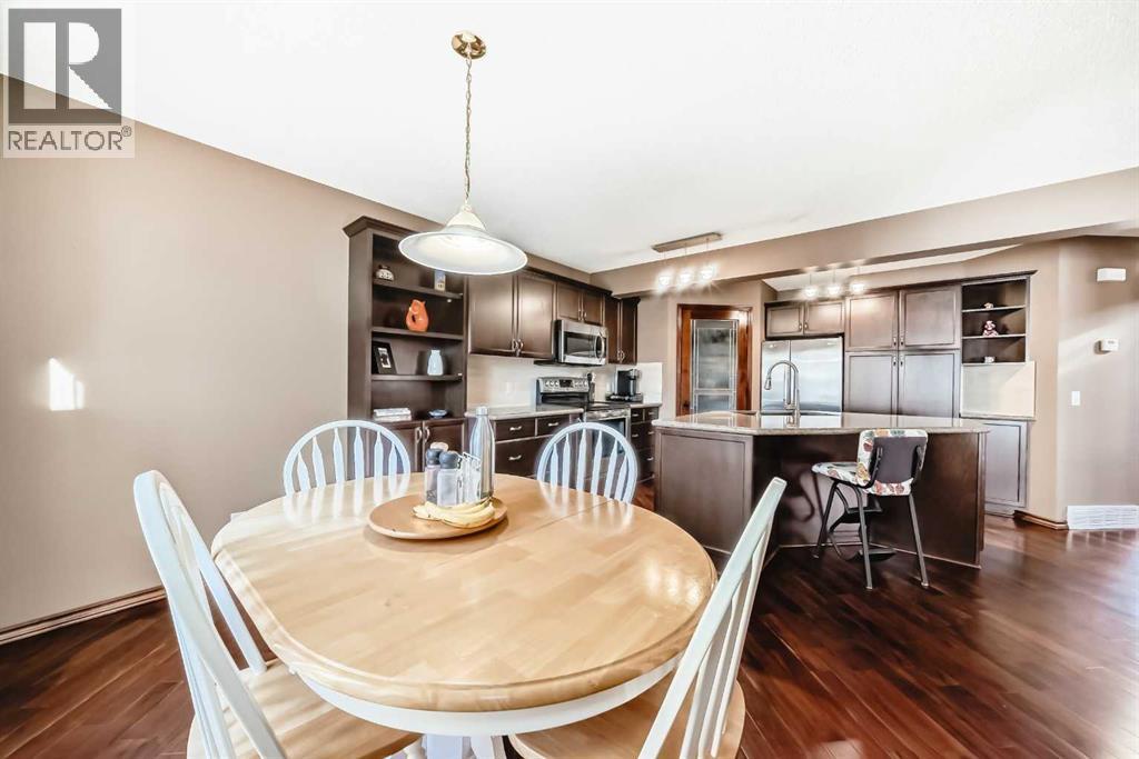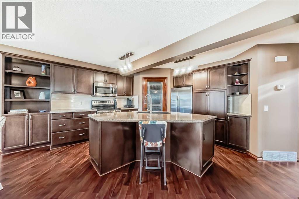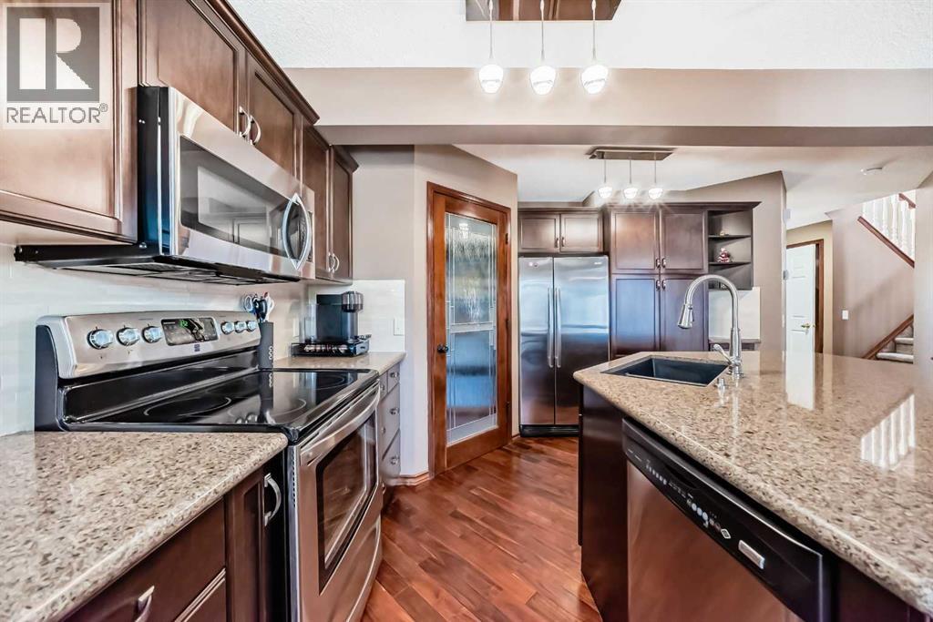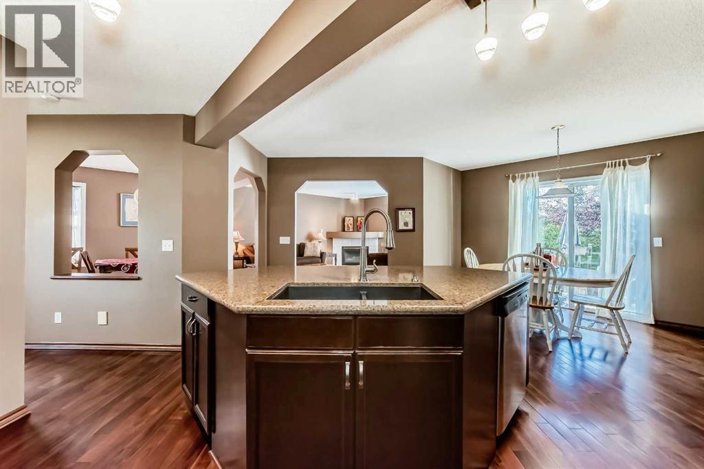 Live the Lake Life in Chaparral! Just one block from Lake Chaparral, this beautifully maintained two-storey offers over 2,500 ft² in one of Calgary’s most sought-after lake communities. Step inside to warm hardwood floors, granite counters, and a spacious kitchen with a central island, built-in microwave, Silgranit sink with garburator, walk-in pantry, ample pot drawers, and built-in bookshelves. Enjoy both a formal dining room and a bright breakfast nook that opens to the backyard. The large living room features newer carpet and a cozy corner gas fireplace, perfect for unwinding. A convenient 2-piece bath and main-floor laundry complete this level. Upstairs, you’ll find a generous bonus room with a second gas fireplace, a 4-piece bathroom, and three well-sized bedrooms, including a large primary suite with a walk-in closet featuring custom built-ins and a private 4-piece ensuite with a relaxing soaker tub. The finished basement adds versatility with a family room and a 2-piece bath roughed-in for a shower. Outside, enjoy a private fenced backyard with a deck, shed, underground sprinklers, and Gemstone lights. An insulated double garage adds everyday convenience on this corner lot with a paved alley and mature trees, offering excellent light and privacy. Recent upgrades include a new water heater (2025), carpet (2020), central air conditioning, and newer shingles (2021). Don’t miss your chance to enjoy lake privileges and a fantastic family lifestyle right here in Chaparral! (id:6769)