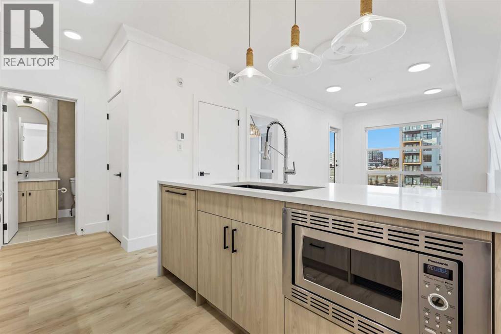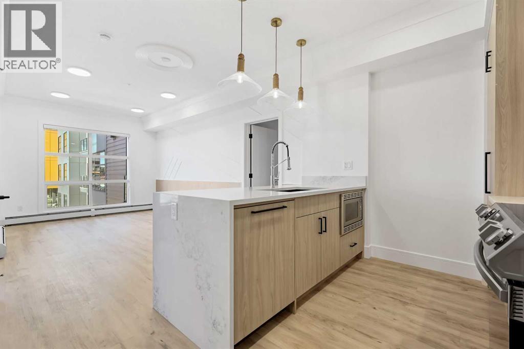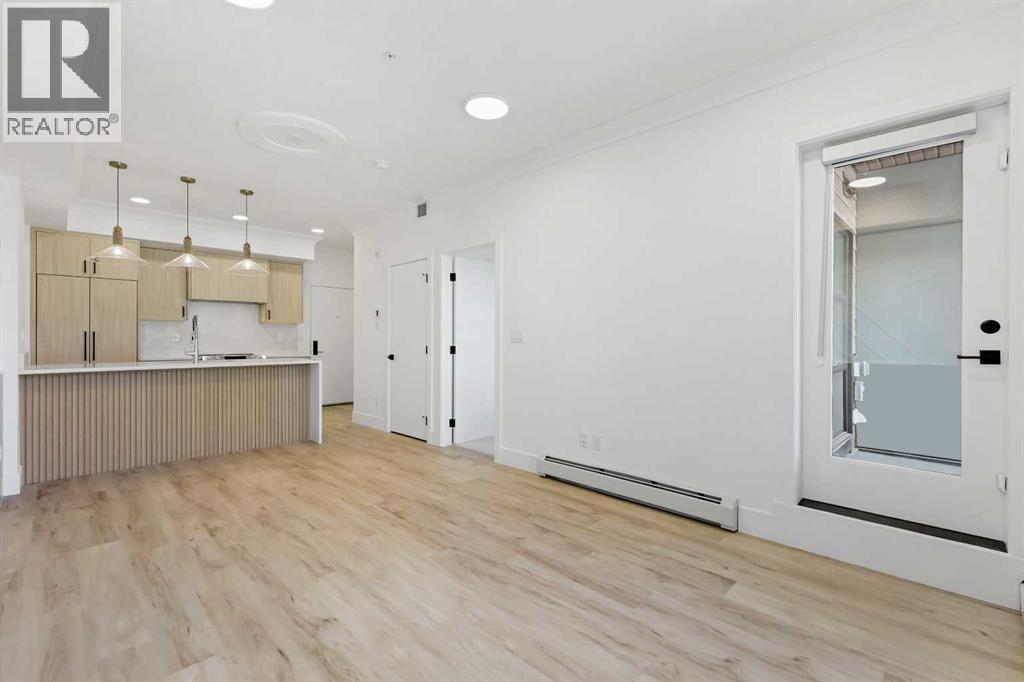 Experience elevated urban living in this brand-new, never-occupied 2-bedroom, 1-bathroom residence located in the highly desirable Currie Barracks community—one of Calgary’s most sought-after neighborhoods. Perfectly situated near Mount Royal University, this modern condo is ideal for professionals, students, or investors looking for exceptional rental potential in a prime location. From the moment you step through the grand front entrance, you’ll be greeted by an atmosphere of modern sophistication. The open-concept layout features designer wall paneling in the living area, upgraded lighting, and an abundance of natural light streaming through large west-facing windows that lead to a spacious balcony overlooking the peaceful courtyard—the perfect place to unwind after a long day. The gourmet kitchen showcases custom cabinetry with matching panel-front fridge and dishwasher, sleek quartz countertops, stainless steel appliances, a gas cooktop, and a convenient breakfast bar ideal for casual dining. Every detail has been thoughtfully considered to blend functionality with style, offering ample cupboard and counter space to enhance everyday living. Both bedrooms are generously sized, providing flexibility for a guest room, home office, or roommate setup. The spa-inspired bathroom boasts modern fixtures and a quartz-topped vanity, while the stacked in-suite laundry offers everyday convenience. Additional highlights include luxury vinyl plank flooring, A/C rough-in for future cooling, and secure building access for peace of mind. Residents of Currie Barracks enjoy a vibrant, walkable lifestyle surrounded by boutique shops, cafés, parks, and pathways. Commuting is effortless with quick access to major routes and public transit, and you’re only minutes from downtown Calgary and local golf courses for leisure and recreation. Whether you’re seeking a luxurious urban retreat or a turnkey investment property, this pristine unit offers a perfect blend of style, convenience, and modern living in an unbeatable location. (id:6769)