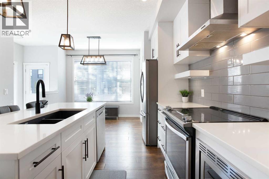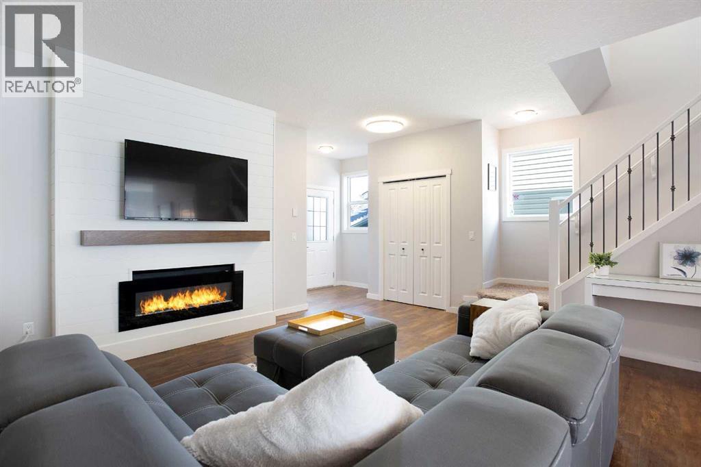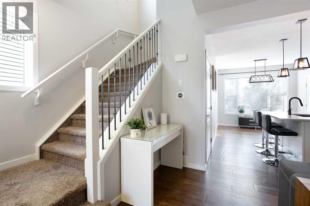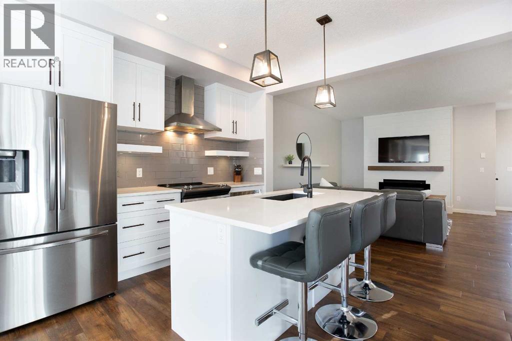 *** OPEN HOUSE SUNDAY NOVEMBER 2ND: 2:00PM - 4:00PM *** Step into this exquisite, move-in ready duplex nestled in the heart of Airdrie’s prestige Bayside community. Offering superb value with zero condo fees, this attached, two-story home showcases an undeniable pride of ownership across 1,370 sq ft of modern, bright living space. Upon entry, you’ll immediately appreciate the thoughtful design of the main floor, which boasts high ceilings, large windows, and an open-concept layout ideal for both everyday living and entertaining. The spacious living room invites relaxation, featuring a cozy electric fireplace framed by a chic shiplap floor-to-ceiling feature wall. This space opens directly into the stunning kitchen, a true chef's delight. It's equipped with modern finishes, ample white cabinetry, a convenient pantry, and centered around a magnificent quartz island illuminated by stylish pendant lighting. With clear sight lines, the kitchen seamlessly connects to your bright, contemporary dining area. A conveniently placed two-piece powder room completes the main level. The upper level continues the sophisticated aesthetic, providing a spacious primary retreat—a peaceful sanctuary complete with a walk-in closet and a spotless three-piece ensuite. This floor also hosts two additional great-sized bedrooms, a well-appointed four-piece bathroom, and the highly desirable designated upper-level laundry. Adding fantastic future value, the basement is pre-plumbed and ready for development, offering potential for a fourth bedroom, another full bathroom, or a spacious recreation room. Outside, the property features a single attached garage and a beautifully landscaped, fenced, sunny backyard with a deck and low-maintenance greenery. This home’s prime location is a key highlight, being just steps from the serene waterside pathways and offering easy access to schools, parks, and shopping. Don't miss the chance to experience this perfect blend of comfort and community—it's truly t he ideal place to call home! Book your Showing today! (id:6769)