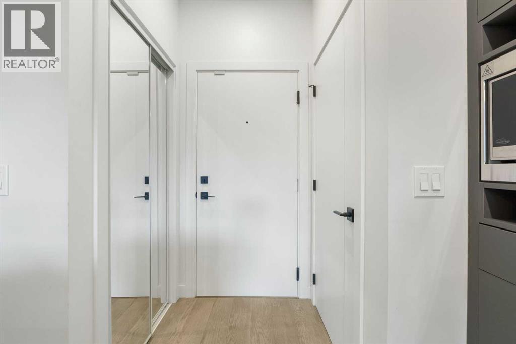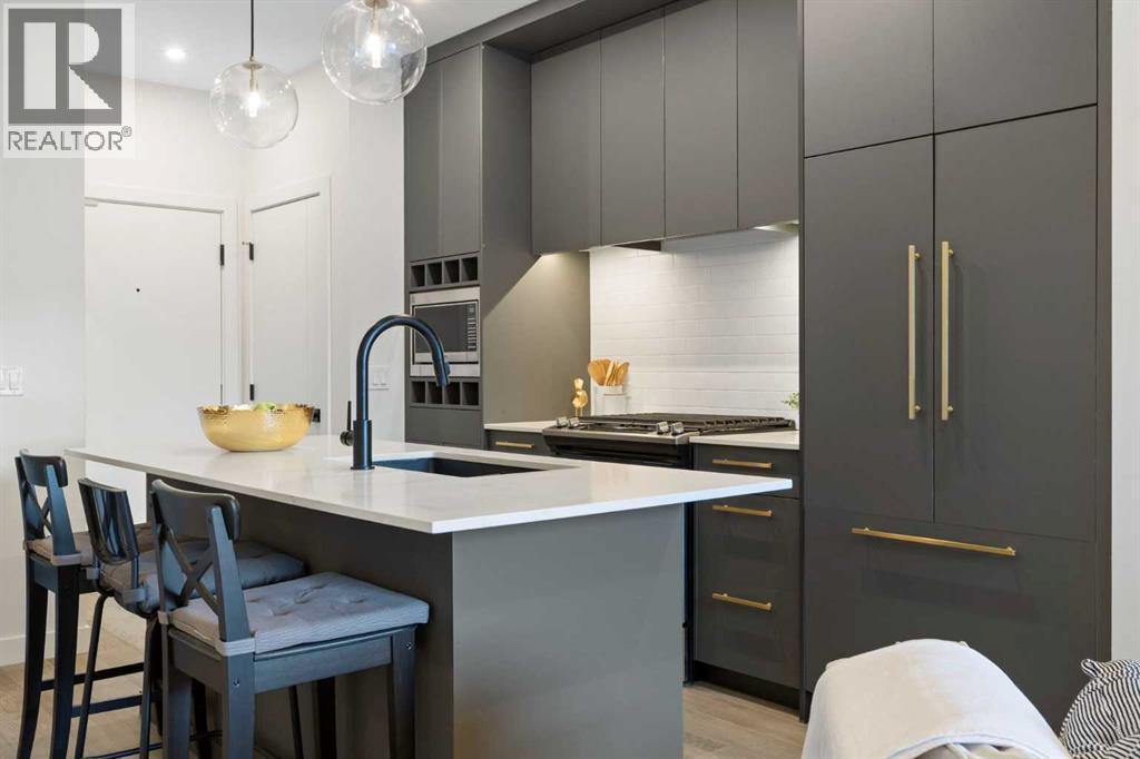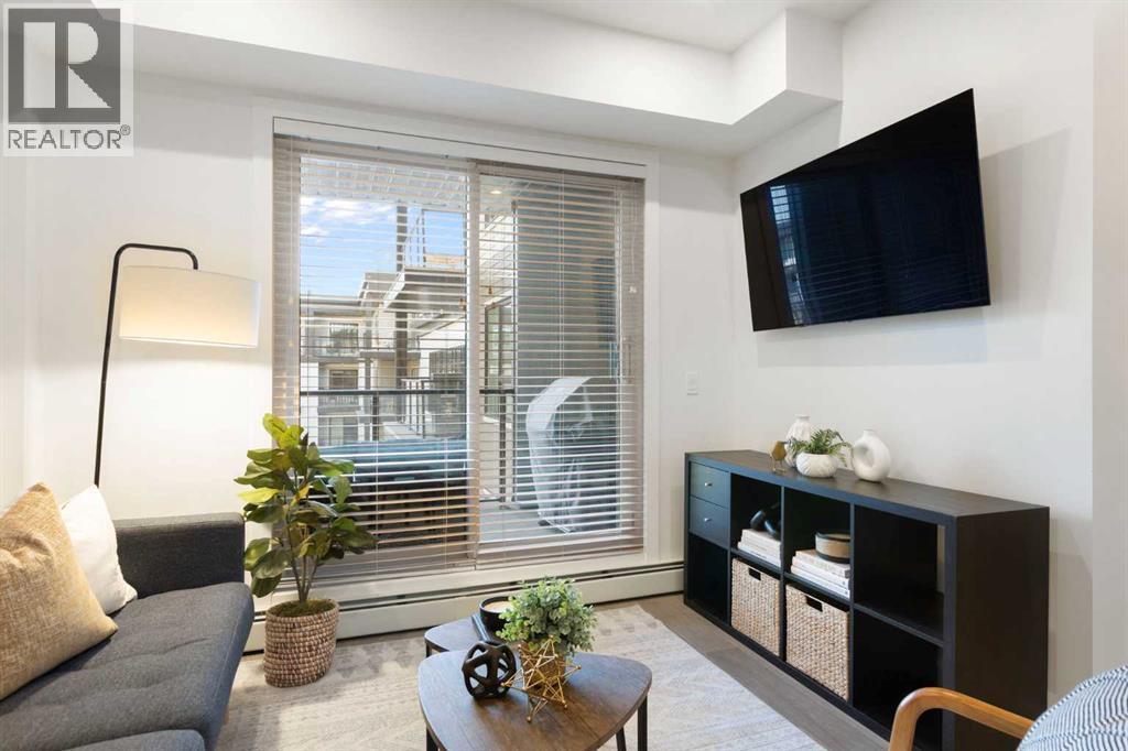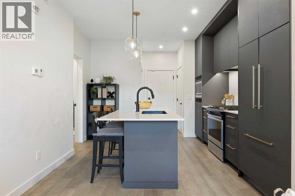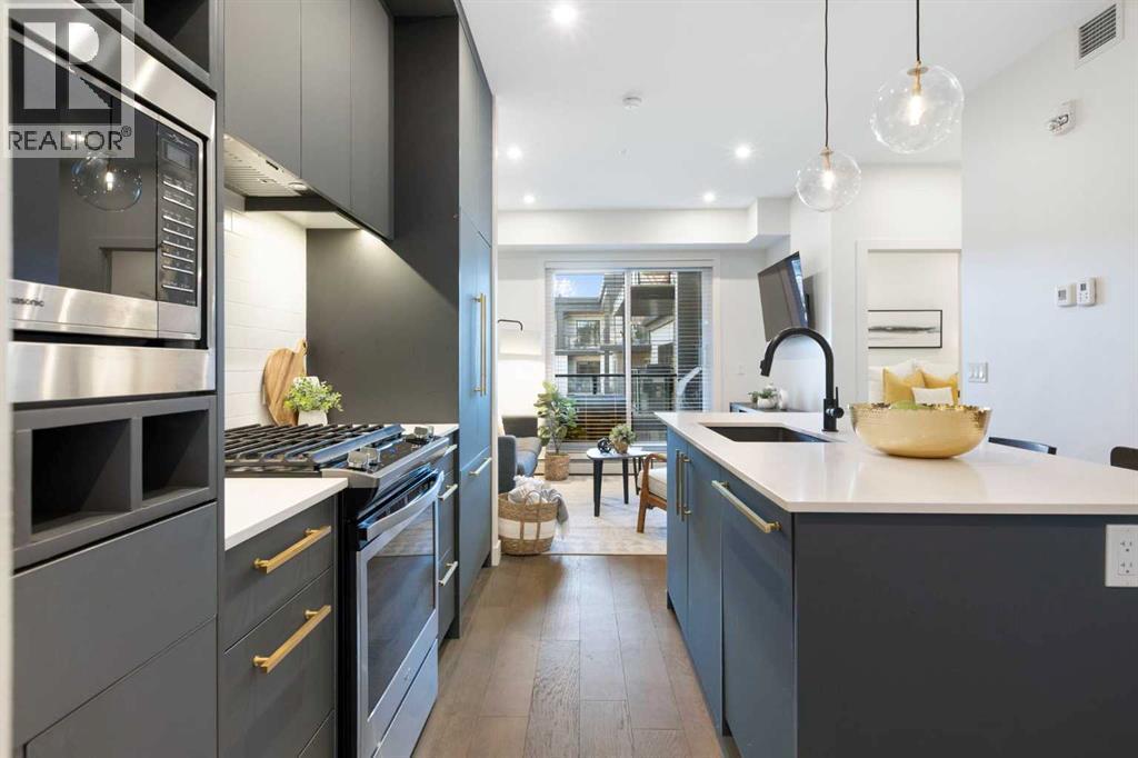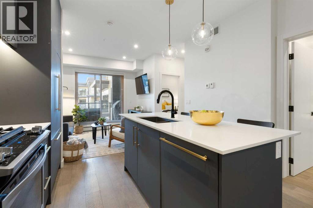 Elevate your lifestyle at Esquire’s Unit 325—where design, comfort, and connection define luxury in Calgary’s University District. DESIGN - Built by award-winning Truman Homes, Calgary’s builder of choice, this light-filled third-level unit offers 640 sq. ft. of open-concept living. Every element reflects modern sophistication, from the 9-foot ceilings and oak hardwood flooring to the premium fixtures and warm brass accents. The kitchen blends luxury and function with sleek charcoal cabinetry, soft-close drawers, an integrated wine rack, and elegant glass pendant lighting, while the white subway tile backsplash and under-cabinet lighting showcase the stainless steel microwave and gas range, and panelled appliances. Anchoring the heart of the home is the large white quartz island with seating for three, ideal for staying engaged for casual meals or hosting guests. COMFORT - Sun-drenched and airy floor plan with south-facing windows flows seamlessly to a covered balcony overlooking serene courtyard views. With 2 bedrooms, a stylish 4-piece bathroom, in-suite laundry, and LEED Platinum certification, this home offers a polished, comfortable experience. CONNECTION - Living up to its “Live Better” slogan, residents enjoy exclusive on-site amenities: 24-hour gym, workshop, pet spa, and bike room. Unique to this unit are titled heated underground parking and same-floor storage (no parkade trips), plus visitor parking in this pet-friendly building. Unmatched access to shop, sip, or get social at your favourite local cafes, shops, grocers, and restaurants, with an off-leash park and transit nearby.  Quick drive to downtown and the mountains, and just a short walk to Alberta Children’s Hospital, Foothills Medical Centre, and University of Calgary, this home offers tremendous value in one of Calgary’s most desirable neighbourhoods. Perfect for first-time buyers, investors, downsizers, students, or healthcare professionals seeking unmatched convenience and community. Check out  the online virtual tour, schedule your private showing today, and don’t miss the chance to own this exquisite Esquire condo Unit 325 in University District! (id:6769)