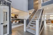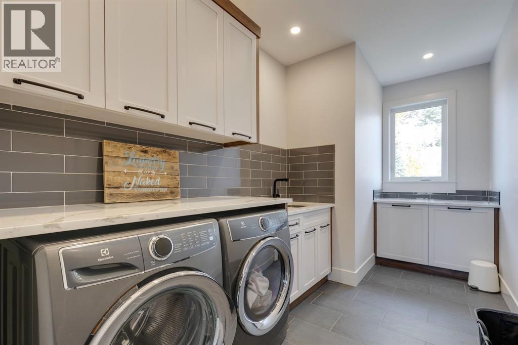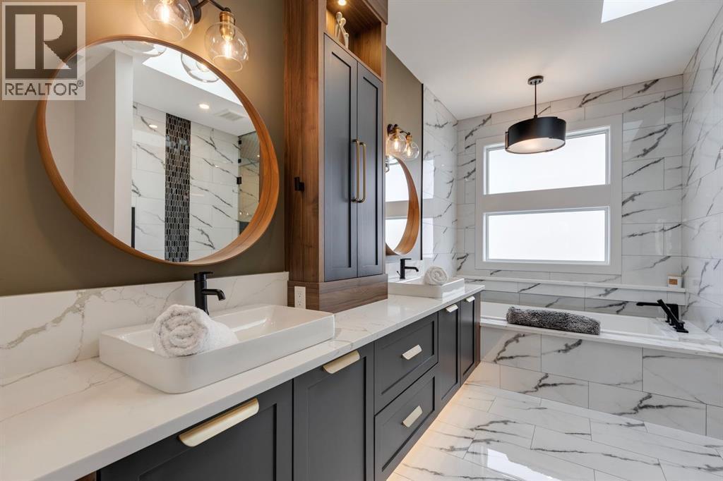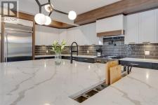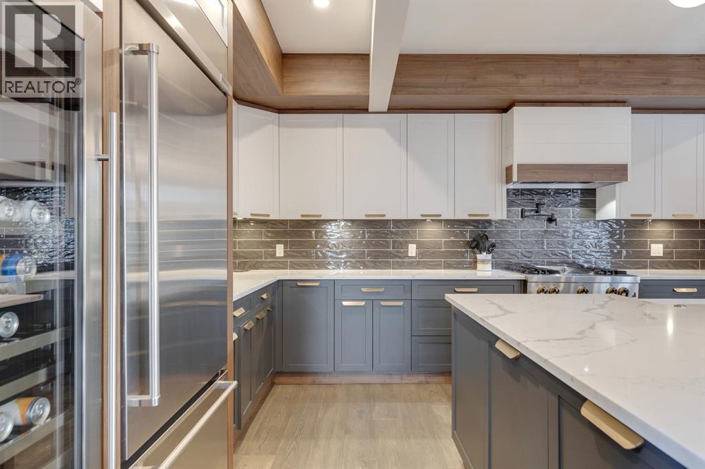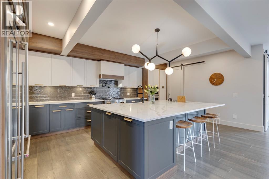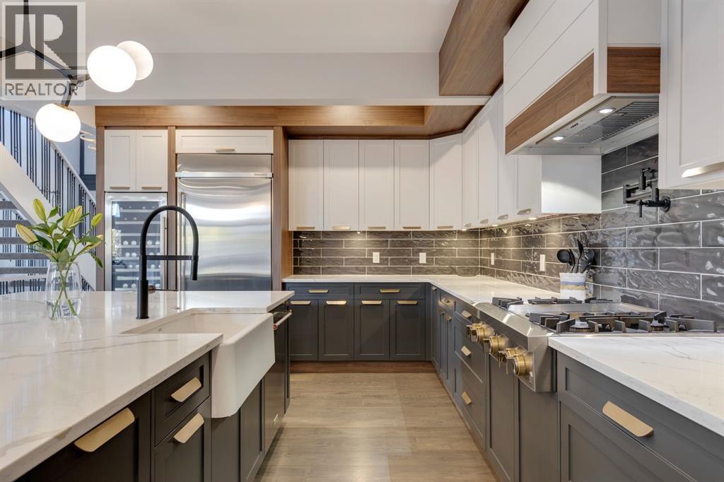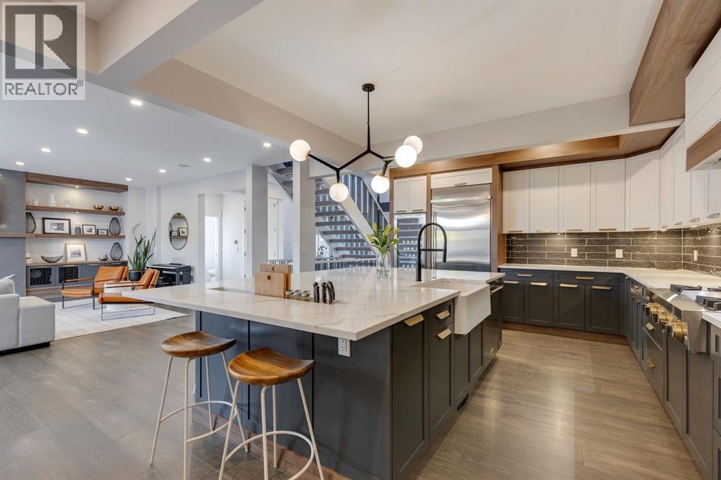 Discover modern elegance and refined living in this custom built architectural showpiece. Designed for families and entertainers alike, every element of this residence blends cutting edge technology, timeless craftsmanship, and a warm, luxurious ambiance that instantly feels like home. From the moment you arrive, you’ll be captivated by the exquisite curb appeal and inviting front porch where you can unwind with a glass of wine and wave to passing neighbours. Step inside to a warm, contemporary interior accented with rich walnut finishes throughout. A culinary enthusiasts dream kitchen is a true centrepiece, featuring an expansive eat-up island, a walk-in pantry, custom cabinetry, built-in appliances, and a massive island with a Zomodo prep sink that transforms seamlessly for entertaining. Designed to impress and inspire, this kitchen effortlessly blends functionality with sophistication, making it ideal for both intimate family meals and lavish entertaining. The open concept main floor invites connection, whether you’re hosting elegant dinner parties or cozy family nights by the fireplace. Extend your living outdoors to a spectacular, multi-tiered deck and beautifully landscaped rear yard, ideal for summer gatherings or peaceful evenings under the stars. Upstairs, the primary suite redefines luxury with a gas fireplace, coffee station with beverage fridge, and large windows framing tranquil views. The lavish ensuite pampers with a large skylight, heated floors, deep soaker tub, steam shower with body sprays, double vanity, and even a heated towel rack for ultimate comfort. Two additional spacious bedrooms, a full bath, and a large laundry room complete the upper level. The lower level presents plush carpets and exceptional versatility with two additional bedrooms (or home gym), a family room and games area, a gorgeous wet bar, and a spacious wine cellar for the wine collecting enthusiast. Located on a quiet, tree-lined street just steps from both public and catholi c schools, Confederation Park and the golf course, and moments from the Calgary Winter Club, this home offers an unmatched lifestyle balancing recreation, relaxation, and urban convenience. A true smart home built with integrated voice-controlled Lutron lighting, Nest thermostats, Ring Pro security cameras, and smart irrigation, allowing you to manage your environment from anywhere. Even the triple car heated garage features belt-drive smart openers for ease and convenience. Built with uncompromising quality and integrity, every element of this home showcases expert craftsmanship, premium materials, and enduring design crafted for families who value beauty, function, and comfort. Make your dreams a reality in a home built to create memories for generations. (id:6769)