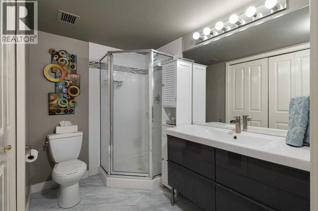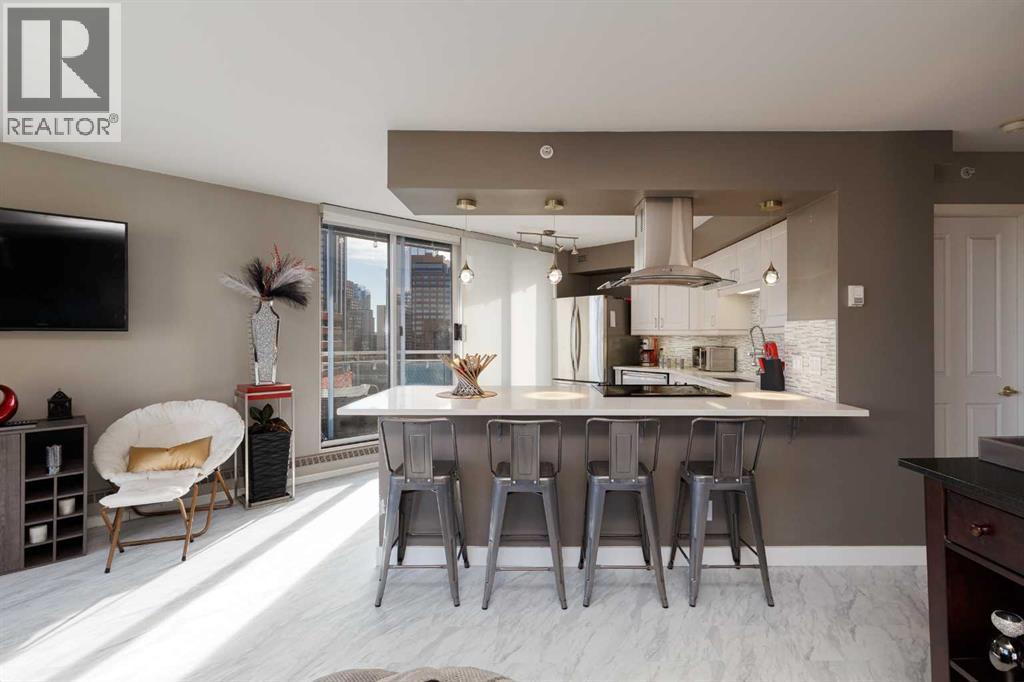Welcome to an unparalleled urban lifestyle in the heart of the dynamic riverfront community of Eau Claire. Living here means being steps away from Prince’s Island Park, the Bow River Pathway system, trendy cafés and restaurants, all just a short walk to the business district. Situated in the Liberte building, this sophisticated, beautifully appointed 2 bedroom, 2 bathroom suite has incredible natural light from expansive, floor-to-ceiling windows, and offers captivating cityscape views. The open concept living space has a modern, bright aesthetic and was designed for comfort and effortless entertaining. The spacious living room features a corner gas fireplace and ample room for the most generous seating arrangements. The gourmet kitchen boasts pristine white cabinetry, stainless steel appliances, and a large central island that anchors the room and provides the perfect spot for casual dining and conversations. The adjacent den allows for a great home office space, or alternatively, an additional dining area. The living area is extended by two large balconies, where one can enjoy their morning coffee or evening cocktails while taking in the panoramic views of the downtown skyline. The layout of the home provides separation and privacy between the living areas and the two bedrooms, each designed as a comfortable retreat. The spacious primary suite easily holds a king bed and additional furniture pieces, and has double closets lining the hall to the ensuite bathroom. The second bedroom is equally well sized, and has a second full bathroom (including laundry closet) located just outside the door. The building offers extensive amenities, including a fitness centre, tennis court, party room, and heated underground parking. This turn key residence is more than just a home, it’s an opportunity for amenity and activity rich living. Walk out your door to the Bow River Pathway for a run or bike ride, stroll across to Prince's Island Park for a festival, or walk just minutes t o the fantastic restaurants and shops, and for professionals working downtown, the commute can’t be beat! Book your private showing today. (id:6769)