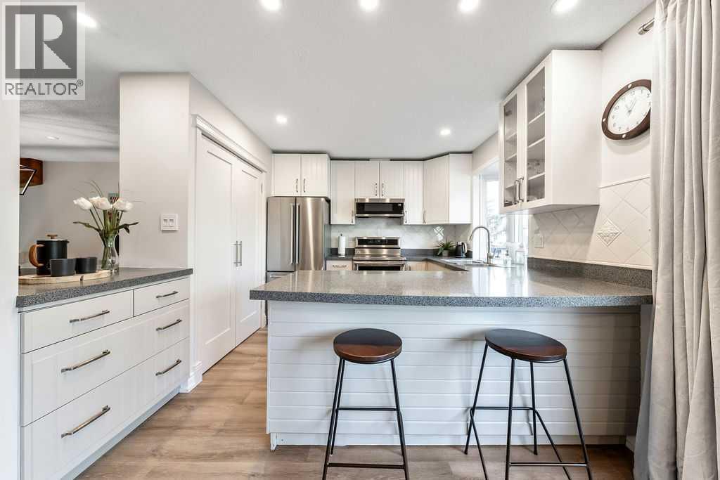 If you’ve been searching for an impeccably planned, beautifully renovated, and move-in-ready end unit, this might be the one!This stunning four-level split townhome offers over 1,900 sq. ft. of developed living space, four bathrooms, a double attached heated garage and triple pane windows throughout — all in a prime Oakridge location. With over $75,000 in recent renovations and upgrades, every inch of this home has been thoughtfully updated for modern comfort and style.Main LevelStep into a spacious and welcoming foyer featuring a striking feature wall and durable natural slate flooring. This level also includes a convenient three-piece bath and laundry area.Second LevelThe impressive living room showcases vaulted cedar ceilings, a cozy gas fireplace, and brand-new carpeting throughout. Oversized south-facing patio doors and an additional large window flood the space with natural light. The private fenced yard and patio offer an inviting outdoor retreat — perfect for summer entertaining.Third LevelThe newly installed luxury vinyl plank flooring flows through a formal dining area overlooking the living room, ideal for hosting family and friends. The upgraded kitchen features quartz overlay countertops, a peninsula eating bar, and a large custom pantry with beautiful doors. The coffee bar/pass-through to the dining area adds both function and charm. A bright breakfast nook opens onto a 16’x 20’ deck through another large sliding door, creating an easy indoor-outdoor flow. A newly renovated two-piece bath completes this level.Upper LevelRetreat to a spacious primary bedroom with a new walk-in closet and a luxurious four-piece ensuite featuring double sinks and an oversized tiled walk-in shower. Two additional generous bedrooms provide ample space for family or guests. The show stopping spa inspired four-piece bathroom boasts a free standing soaker tub, corner shower, feature wall, barn door, large vanity and recessed lighting — pure relaxation at home.Lo wer LevelThe family/media room is perfect for movie nights or casual gatherings and includes an upgraded dry bar with cabinetry, countertop, and a recessed beverage fridge space. There’s also room for a home gym, plus well-lit crawl-space storage for all your extras.Location & LifestyleOakwood Lane is a well-managed, pet-friendly complex in an unbeatable location. Walk through the back gate and you’re just minutes from Oakridge Co-op, Boston Pizza, A&W, yoga studios, and professional services. Outdoor lovers will appreciate easy access to South Glenmore Park, the Southland Leisure Centre, and an huge off leash dog park only a 5 minute walk away. Walk to nearby schools, and enjoy shopping at Glenmore Landing, Southcentre, and Shops (and cheap gas!) at Buffalo Run. Plus, you’re less than an hour from the mountains!Welcome home to comfort, style, and convenience — in this all in one exceptional Oakridge property. (id:6769)