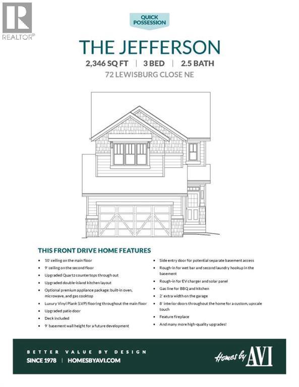LET’S BE HONEST—THE SECOND ISLAND CHANGES EVERYTHING. Suddenly there’s room for cereal chaos, laptop cords, and a half-finished science project without losing prep space for dinner. In a world full of cookie-cutter kitchens, this one dares to ask: what if function looked this good? The double-island layout anchors the main floor and proves that design and everyday life can actually get along.TEN-FOOT CEILINGS pull light across every surface, softening the edges and making the space feel calm even when the calendar isn’t. The FULL-HEIGHT FIREPLACE WALL adds quiet definition to the living, while the UPGRADED THREE-PANEL PATIO DOOR opens to an ELEVATED DECK that steps down to a partially fenced yard with NO DIRECT NEIGHBOURS BEHIND—just the kind of privacy that makes morning coffee or late-night barbecue feel like a small luxury. The flow from garage to mudroom to WALK-THROUGH PANTRY to kitchen makes unloading groceries almost satisfying.Upstairs, you arrive in the BONUS ROOM—a bright, open space that catches light from the south stairwell window. From there, FRENCH DOORS lead to the master bedroom, where calm takes over: a SOAKER TUB, DUAL SINKS, TILED SHOWER, and enough space to exhale. Each secondary bedroom includes its own walk-in closet (a rare peace treaty in most families), and the laundry room comes with a built-in counter that turns folding into something you might actually finish.Down below, a SEPARATE SIDE ENTRY and NINE-FOOT FOUNDATION height set the stage for whatever comes next—future development, multi-gen living, or that gym you swear you’ll use. ROUGH-INS FOR A WET BAR, SECOND LAUNDRY, EV CHARGER, AND SOLAR CONDUIT are already waiting, because good planning is invisible until you need it.Outside, durable HARDIE SIDING and clean lines give the home a modern, enduring feel that fits the evolving streetscape of Lewisburg. You can tell this plan was drawn by people who understand how families actually move through a house—and what happens when the y don’t.Book a showing today. It’s the kind of plan that doesn’t need a pitch—just a walk-through. • PLEASE NOTE: Photos are of a finished Showhome of the same model – fit and finish may differ on 72 Lewisburg Close NE. Interior selections and floorplans shown in photos. (id:6769)