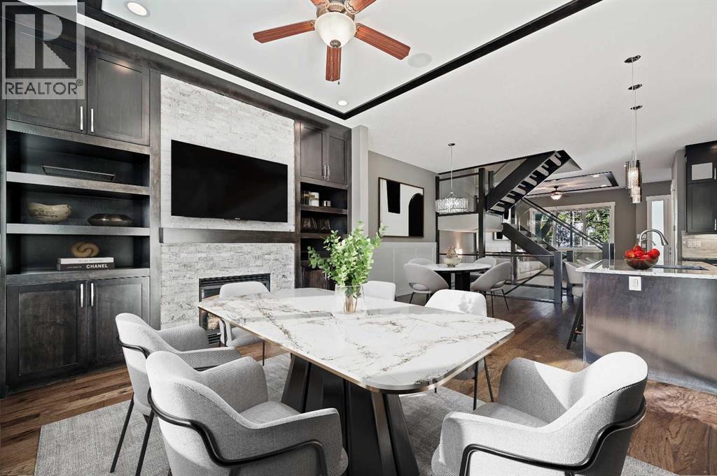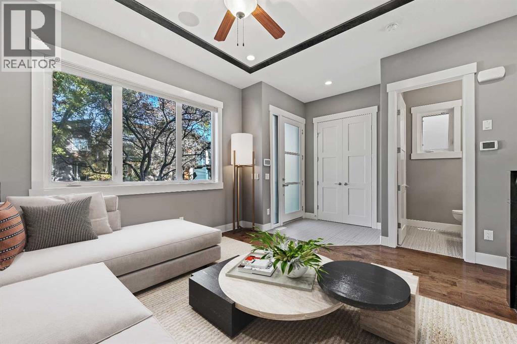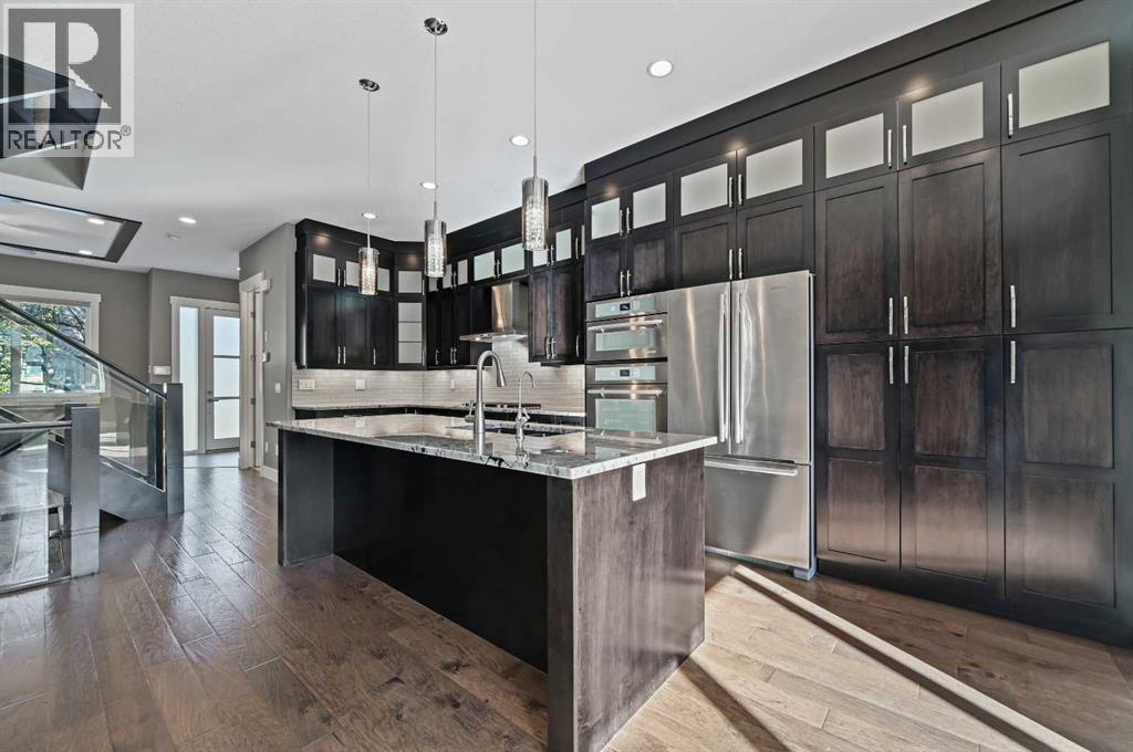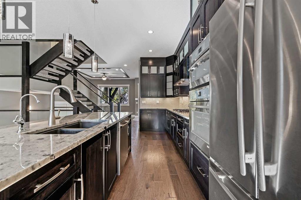 Upscale semi-detached home in Mount Pleasant offers a blend of sophistication and functionality with nearly 3000 Sq.Ft. of thoughtfully designed living space on a quiet, tree-lined street in Calgary’s inner city.High ceilings on all three levels—including the fully developed basement— and large windows provide natural light for the open floor plans.. The main floor features textured hardwood, detailed millwork, and an architecturally striking open staircase. The gourmet kitchen, finished with granite countertops and rich dark cabinetry includes a full package of stainless Jenn-Air appliances, and dedicated water purification, centering the main level with style and practicality. Upstairs, the primary retreat includes a large customized walk-in closet and a spa-inspired 5-piece ensuite with a large jetted tub, walk in shower and dual vanity. Two additional bedrooms, central 4-piece bath, and a well-appointed laundry room complete the upper level.The lower level offers a spacious rec room, fourth bedroom, beautifully finished 3-piece bath with walk-in shower, and a sleek wet bar—ideal for guests and entertaining, along with in floor heat throughout. The professionally installed solar panel system (SkyFire Energy) helps to reduce energy costs while adding long-term value. Gutter protectors (Gutter Doctor) and high-quality finishings throughout speak to the care and attention invested in the home.Outdoors, the south-facing backyard offers a private retreat with two productive garden plots, a shaded patio area along the garage, and a charming garden strip that runs along the walkway and fence.Set on a quiet avenue framed by a mature tree canopy, this location balances serenity with walkability. École de la Rose Sauvage and St. Joseph’s School are just steps away. Walk to Lina’s Market, Safeway, Confederation Park, and local favourites like 4th Spot, Our House, and Turca. Transit access is quick and convenient with nearby BRT and local routes.Minutes to downtown an d just 15 minutes to the airport—this home delivers upscale inner-city living without compromise. (id:6769)
