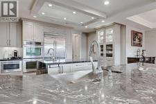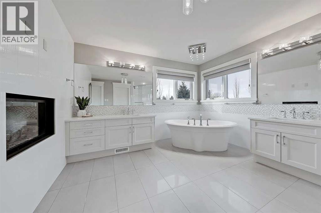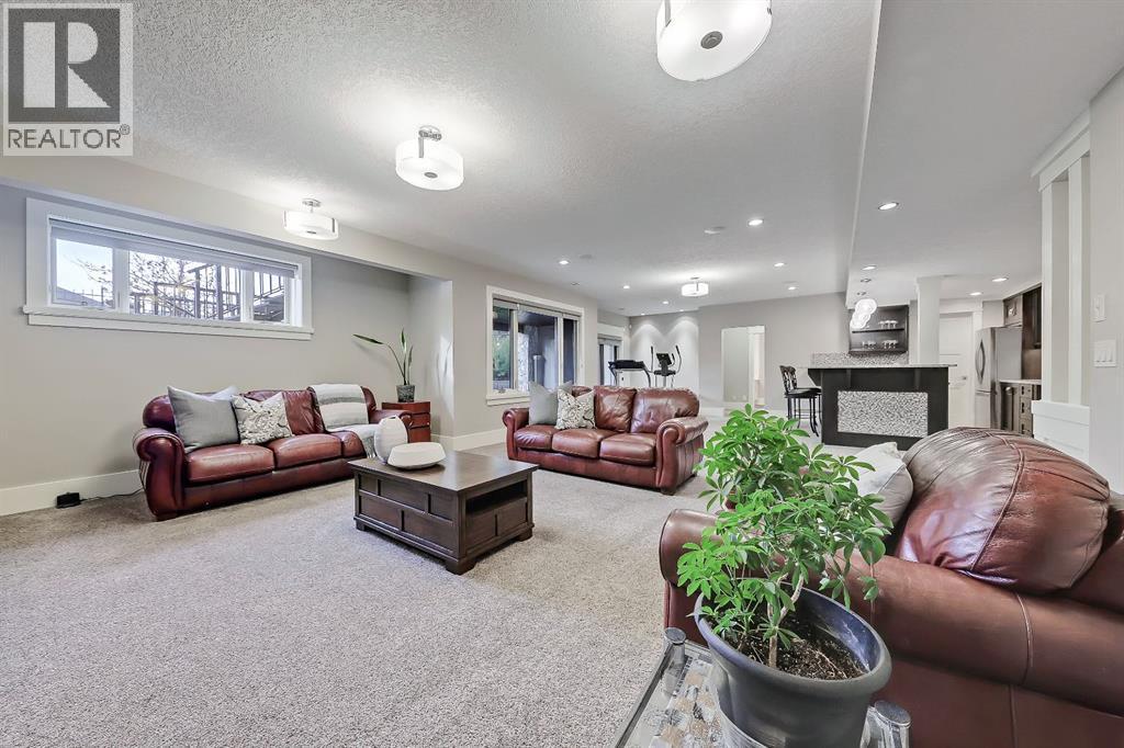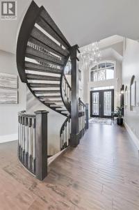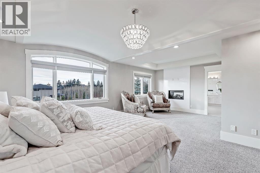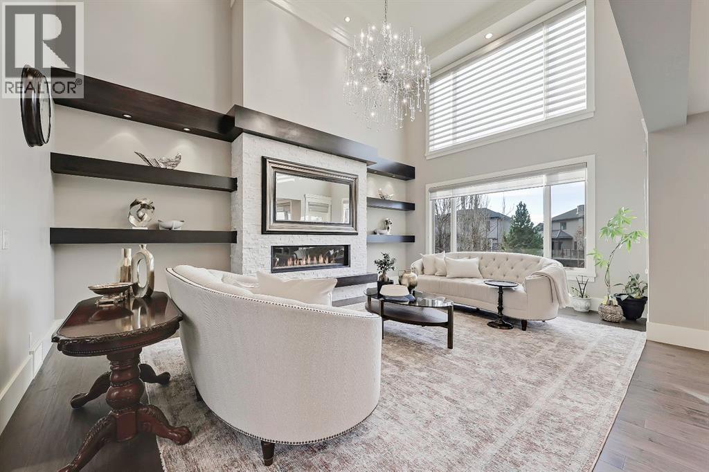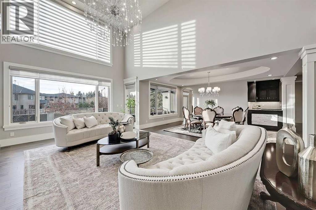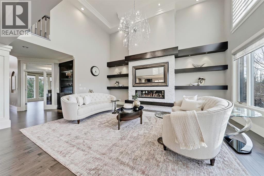 This exceptional Aspen Woods residence captures the best of west-side living—space, light, and quiet sophistication. Set on a 65’ x 136’ lot with a west-facing backyard and no rear neighbours, this well designed home offers over 6,200 sq.ft. of thoughtfully crafted living space. Soaring 19-ft ceilings, a chef-inspired kitchen, elegant living and dining areas, and a full lower-level entertainment zone define this remarkable home. A stone-and-stucco exterior, exposed aggregate drive, and heated 4-car garage set an impressive tone. Inside, a grand curved staircase and statement chandelier anchor the foyer. The living room features double-height ceilings and a full-height stone fireplace beside the formal dining area with bar and display cabinetry making this the perfect place to entertain friends and family. The kitchen connects effortlessly to the family room and breakfast nook, featuring JennAir appliances, granite counters, a prep island, bar seating, and walk-in pantry. A refined office with a built-in granite-topped desk and custom millwork creates a sophisticated and luxurious workspace for ultimate comfort and productivity. Nicely completing this floor is a large laundry with ample counters and storage, a stylish powder room featuring a stunning stone accent wall, and a well-appointed mudroom with custom built-ins. Upstairs, the primary suite is a true retreat with sitting area, walk-in closet, and spa-inspired 5-pc ensuite with two-way fireplace, freestanding tub, dual vanities, and tiled shower. An additional 3 bedrooms include one with ensuite and balcony, plus two sharing a 5-pc bath and loft nook. The walkout lower level impresses with a large rec area, wet bar, wine room, fourth gas fireplace, two bedrooms, and two full baths. Additional highlights include central A/C, in-floor heat rough-in, new high-efficiency hot water tank (2025), covered patio, upper deck, pro landscaping with irrigation, smart exterior lighting, and a six-camera security system. Quie tly tucked on a cul-de-sac near top private schools (Rundle, Webber & Calgary Academy), Aspen Landing, Westside Rec, LRT, and pathways—this is elevated west-side living at its finest and the perfect place to call home. (id:6769)