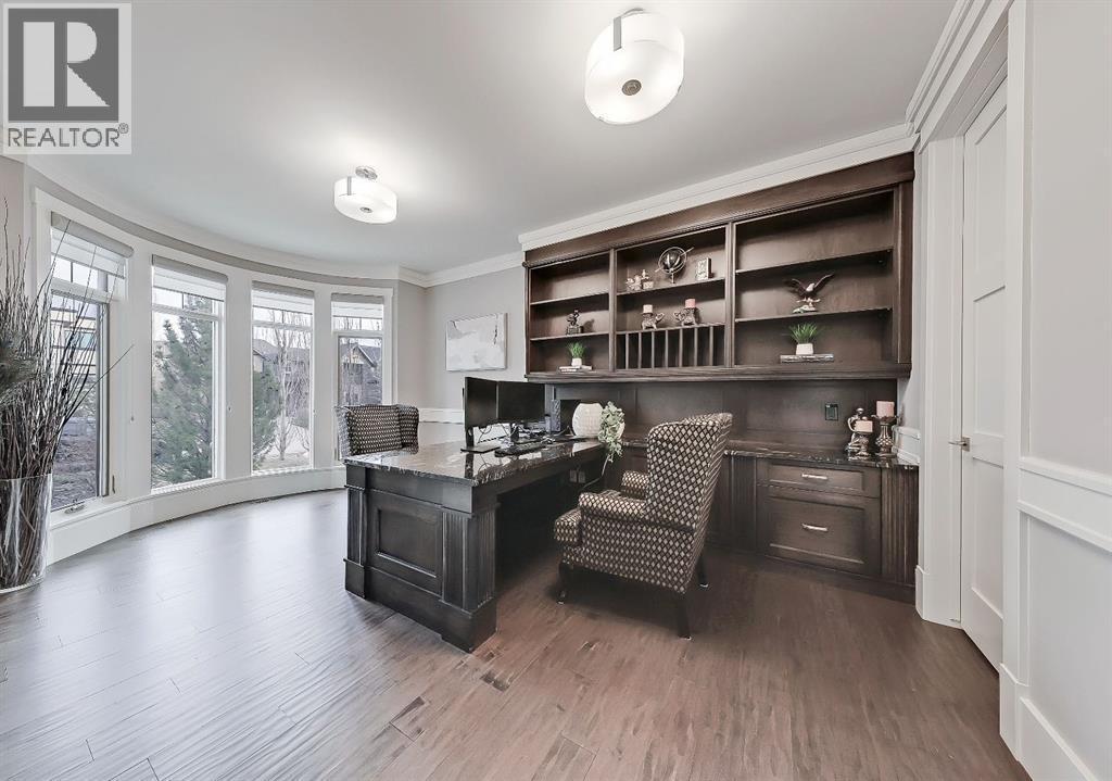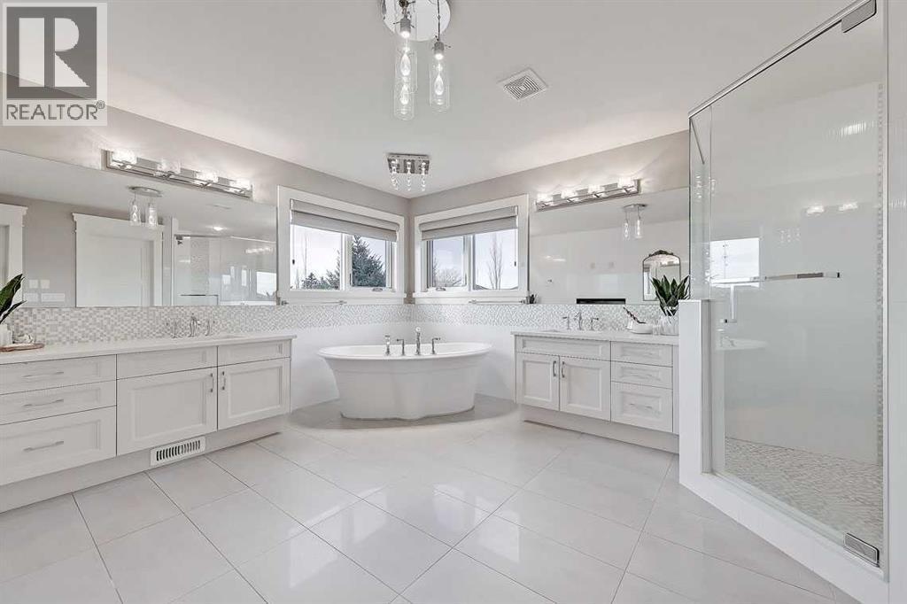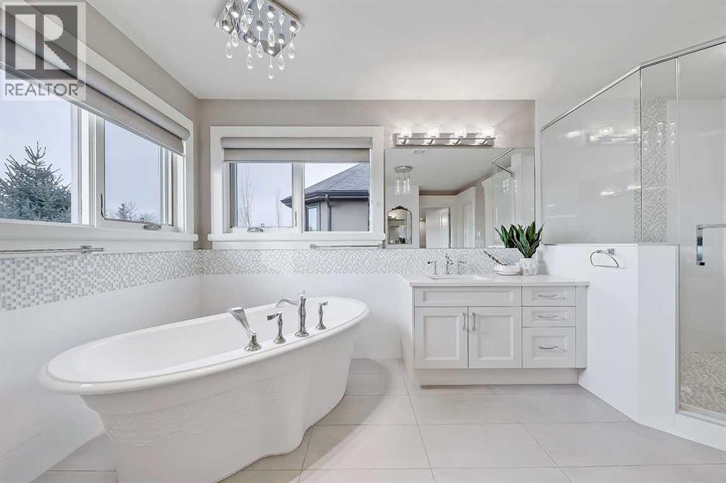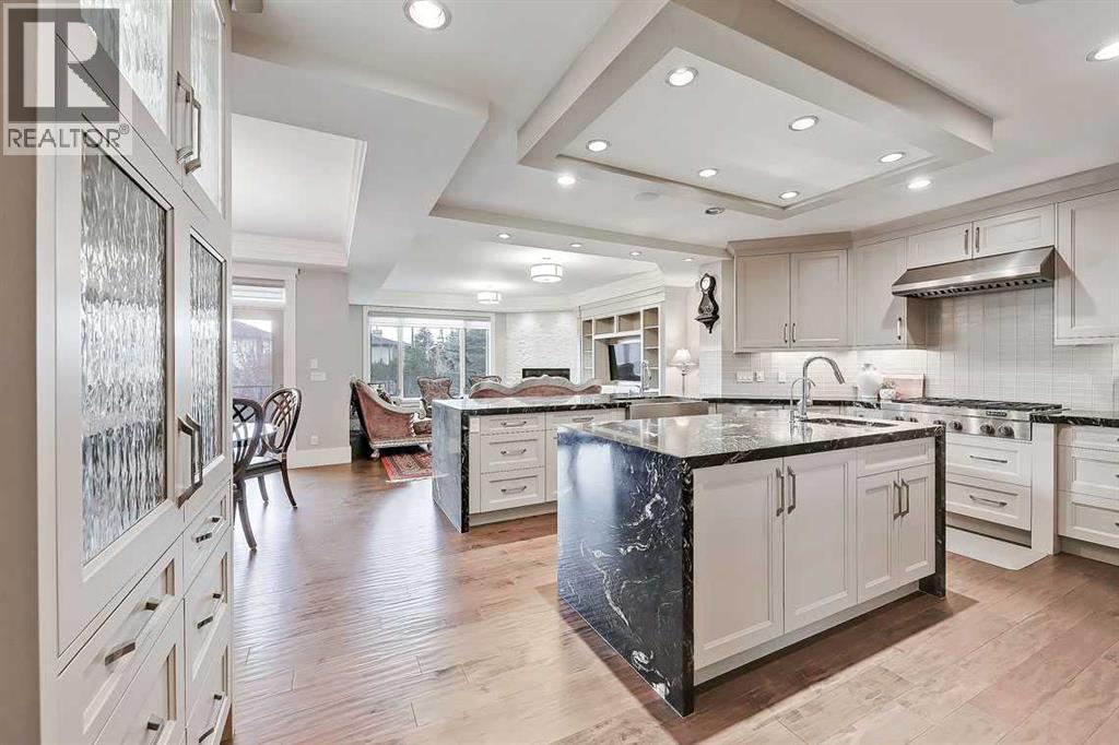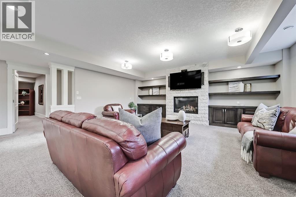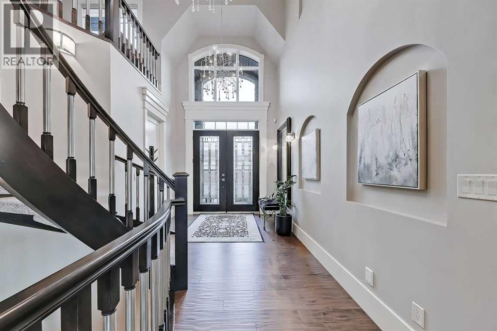 This exceptional Aspen Woods residence captures the best of west-side living—space, light, and quiet sophistication. Set on a 65’ x 136’ lot with a west-facing backyard and no rear neighbours, this well designed home offers over 6,200 sq.ft. of thoughtfully crafted living space. Soaring 19-ft ceilings, a chef-inspired kitchen, elegant living and dining areas, and a full lower-level entertainment zone define this remarkable home. A stone-and-stucco exterior, exposed aggregate drive, and heated 4-car garage set an impressive tone. Inside, a grand curved staircase and statement chandelier anchor the foyer. The living room features double-height ceilings and a full-height stone fireplace beside the formal dining area with bar and display cabinetry making this the perfect place to entertain friends and family. The kitchen connects effortlessly to the family room and breakfast nook, featuring JennAir appliances, granite counters, a prep island, bar seating, and walk-in pantry. A refined office with a built-in granite-topped desk and custom millwork creates a sophisticated and luxurious workspace for ultimate comfort and productivity. Nicely completing this floor is a large laundry with ample counters and storage, a stylish powder room featuring a stunning stone accent wall, and a well-appointed mudroom with custom built-ins. Upstairs, the primary suite is a true retreat with sitting area, walk-in closet, and spa-inspired 5-pc ensuite with two-way fireplace, freestanding tub, dual vanities, and tiled shower. An additional 3 bedrooms include one with ensuite and balcony, plus two sharing a 5-pc bath and loft nook. The walkout lower level impresses with a large rec area, wet bar, wine room, fourth gas fireplace, two bedrooms, and two full baths. Additional highlights include central A/C, in-floor heat rough-in, new high-efficiency hot water tank (2025), covered patio, upper deck, pro landscaping with irrigation, smart exterior lighting, and a six-camera security system. Quie tly tucked on a cul-de-sac near top private schools (Rundle, Webber & Calgary Academy), Aspen Landing, Westside Rec, LRT, and pathways—this is elevated west-side living at its finest and the perfect place to call home. (id:6769)