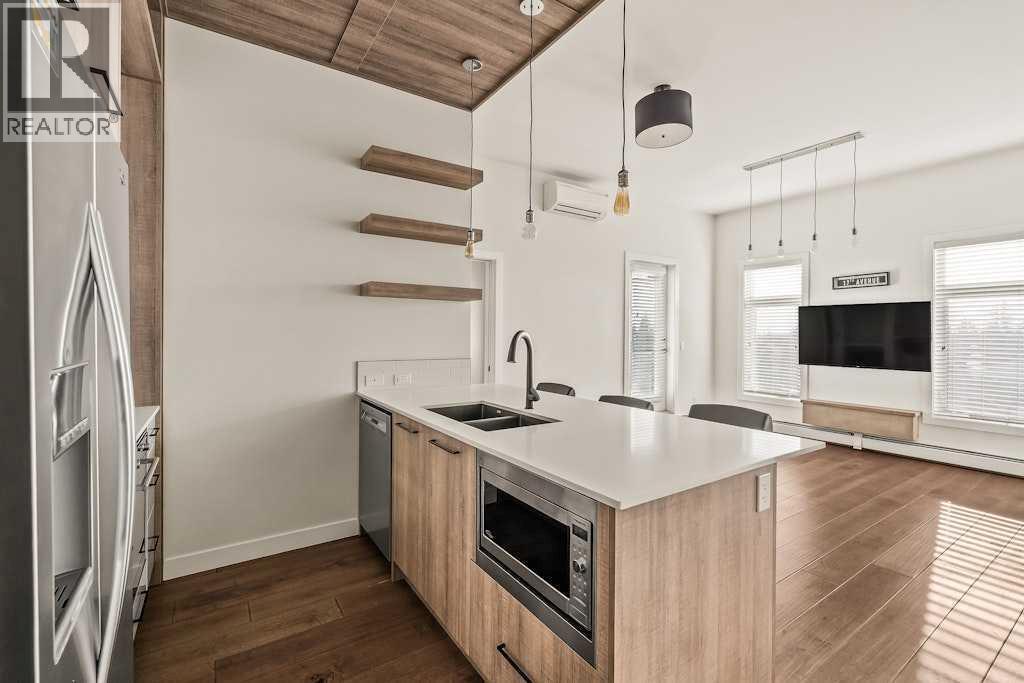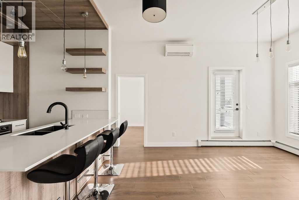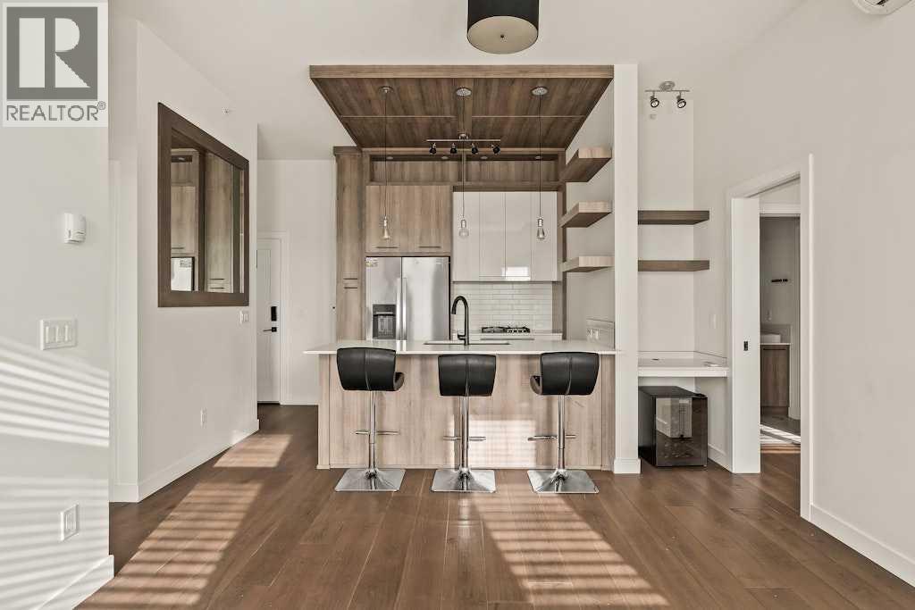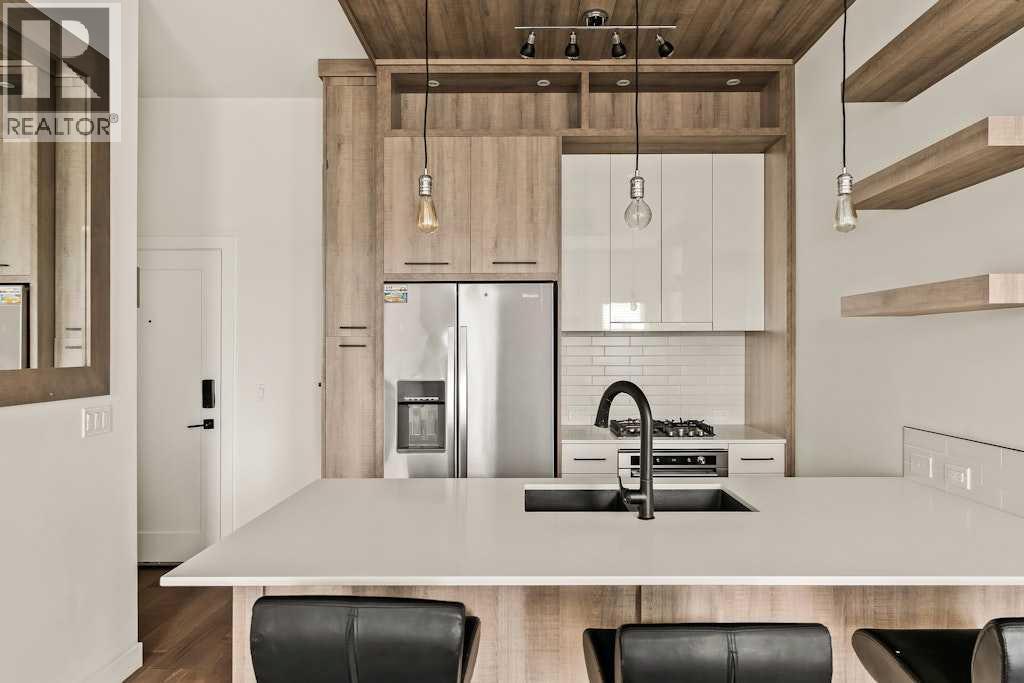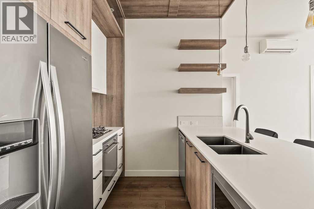 Perched on the top floor of 1741, this beautifully curated 2-bed, 2-bath residence blends contemporary sophistication with effortless urban living, offering a sunny south-facing balcony with a gas BBQ hook-up and a coveted position steps from Calgary’s favourite restaurants, boutique shopping, the LRT, Killarney Pool, Shaganappi Golf Course, local parks, and the library. Inside, illuminated in natural light and boasting all fresh paint, discover hand-scraped engineered hardwood floors that sets a warm, textural foundation for the opulent picture-frame kitchen-finished with high-gloss soft-close cabinetry, white subway tile backsplash stainless steel appliances including a gas cooktop and french-door fridge with filtered water/ice, Caesarstone counters, an under mount sink, under-cabinet LED lighting, and modern industrial-inspired fixtures glowing with vintage Edison bulbs. Thoughtful finishes elevate the everyday: A/C, a custom pantry, added shelving over the built-in desk nook, a newer dishwasher (1.5 years), garburator, matte-black hardware throughout, and seamless in-suite laundry. The spacious layout offers plenty of space to entertain, and offers excellent separation between the bedrooms, making it ideal for couples, professionals, or shared living, while underground titled parking and an assigned storage unit provide year-round convenience. Perfectly balancing high design and high function, you'll find every element of refined inner-city living in one exceptional property. **OPEN HOUSE: Saturday, November 15th from 1:00 - 3:00pm** (id:6769)