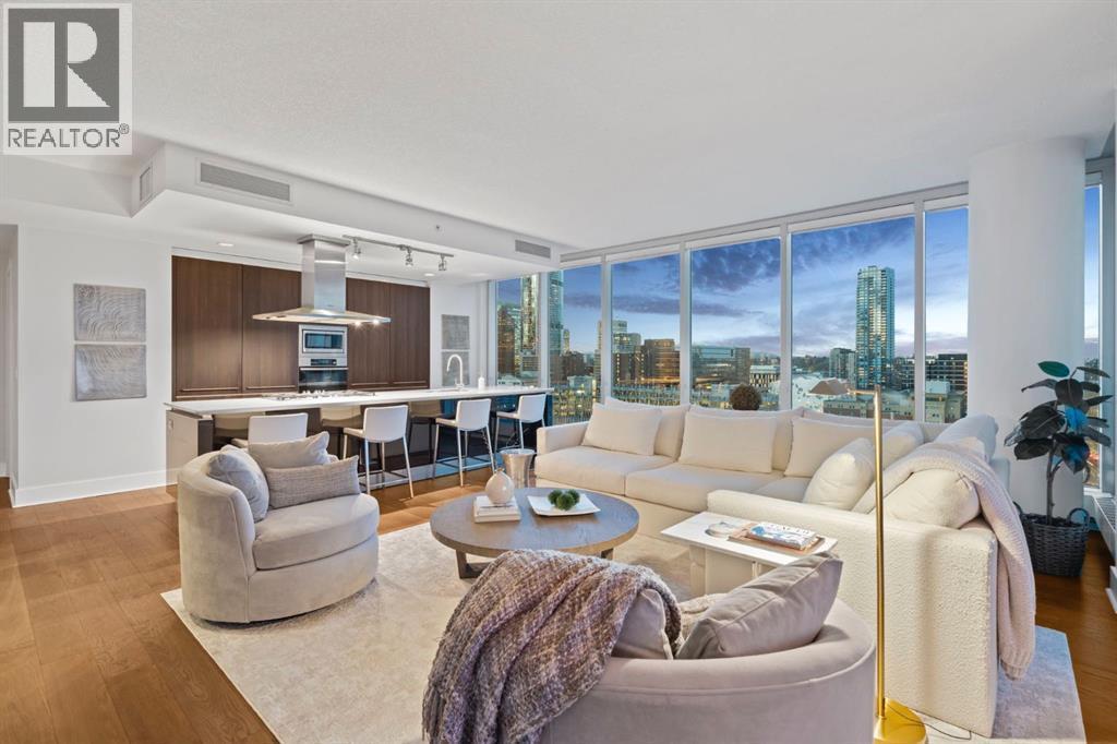 Experience elevated downtown living in this stunning 16th-floor residence at the iconic Arriva Tower. Spanning 1,367 sq. ft., this bright and airy corner unit offers 2 bedrooms, 2 bathrooms, and uninterrupted east facing views through floor to ceiling windows that capture the morning light and stretch across the city skyline and Bow River valley. The orientation provides an incredible sense of privacy and tranquility, paired with sweeping, ever changing vistas.The contemporary kitchen is a showpiece, featuring a full Miele appliance package, gas cooktop, sleek cabinetry, and an expansive island that anchors the open concept layout. Stunning engineered hardwood floors flow throughout the main living spaces, creating warmth and sophistication against the modern design.The spacious living and dining areas are perfect for entertaining or simply relaxing while taking in the panoramic views. The primary suite is a true retreat, complete with a walk-through closet and spa-inspired ensuite featuring a deep soaker tub and glass-enclosed shower. A generous second bedroom and full bathroom offer flexibility for guests or a home office.This home includes two titled underground parking stalls, an assigned storage locker, central air conditioning, and high speed elevators for quick, private access.Known for its luxury living and exceptional service, the Arriva Tower offers a full time concierge who also accepts parcel deliveries, a convenient bonus for residents. Additional building features include 24-hour security, two guest suites, an owner’s lounge and event room, and a beautifully maintained fourth floor courtyard terrace with BBQ area for outdoor relaxation.Located in the vibrant Beltline, steps from the Stampede Grounds, future Event Centre, C-Train access, and Calgary’s best restaurants and entertainment. (id:6769)