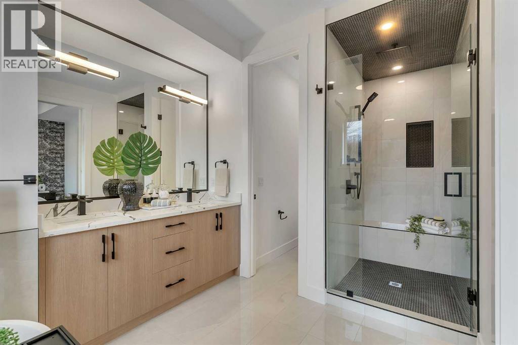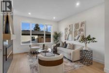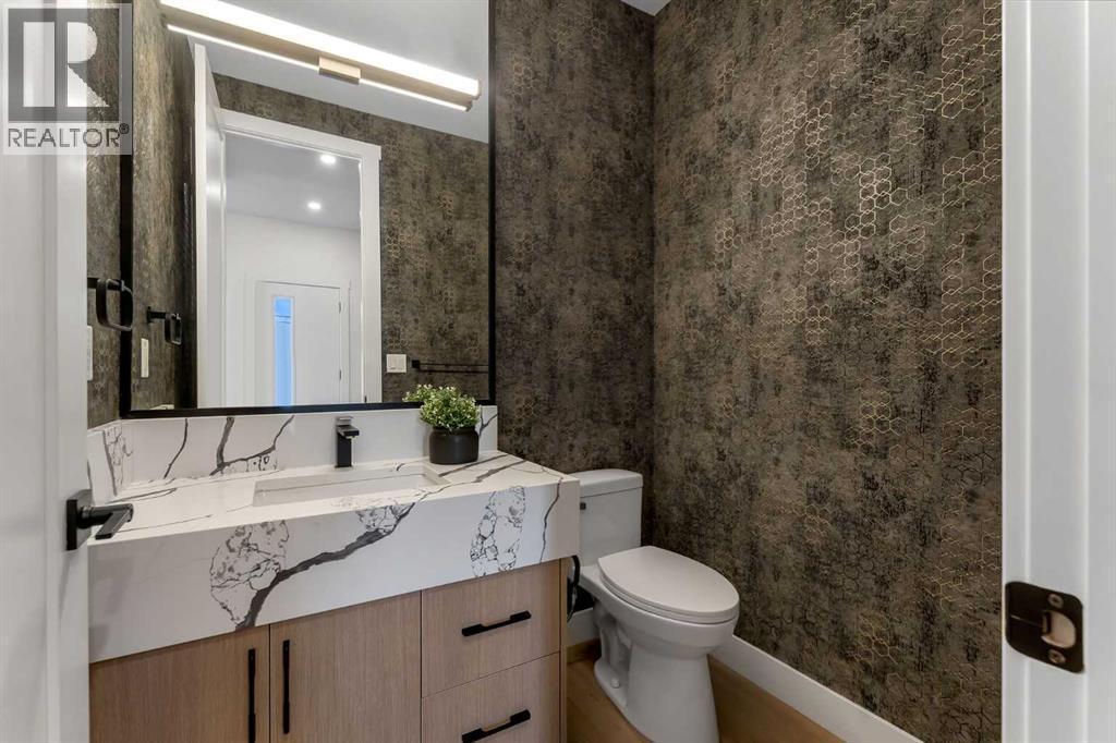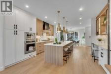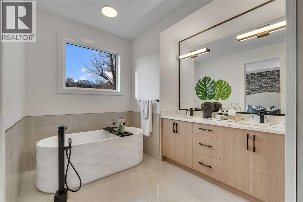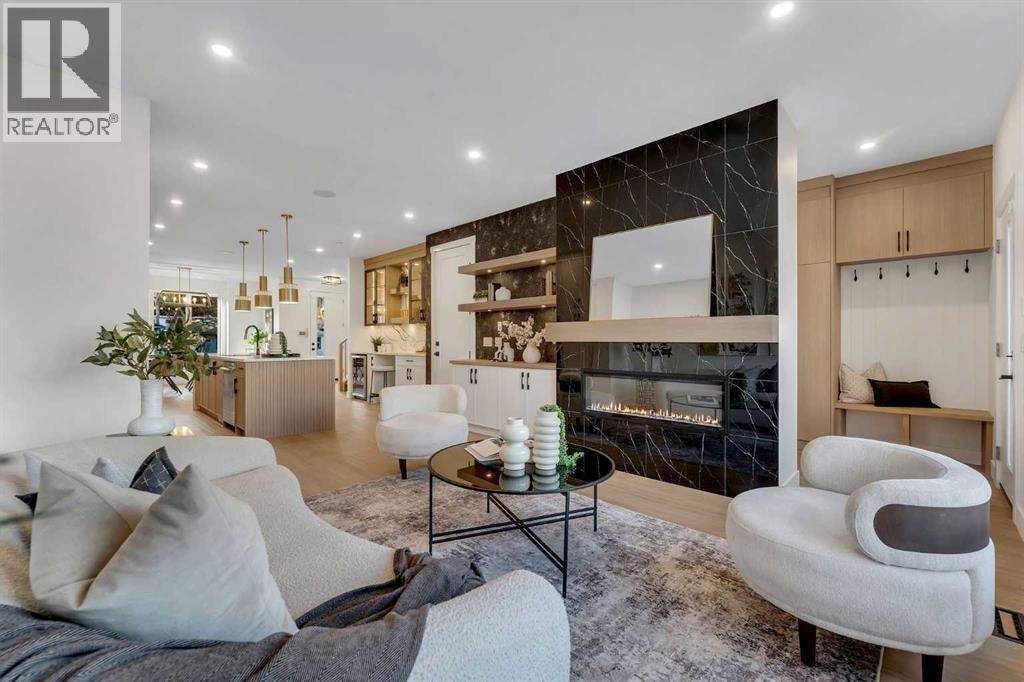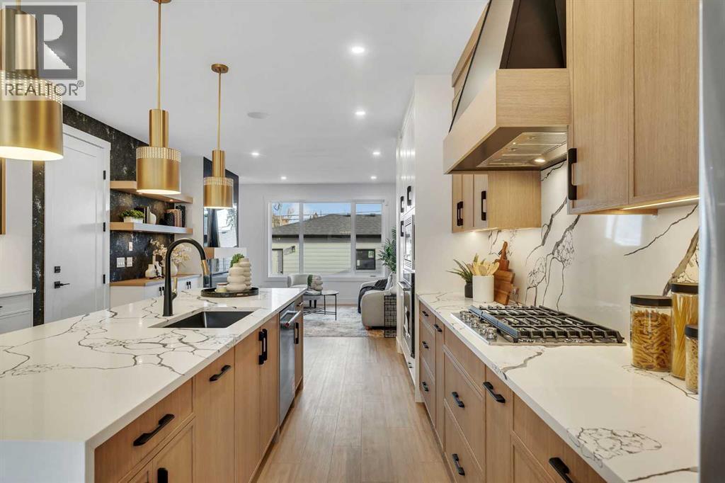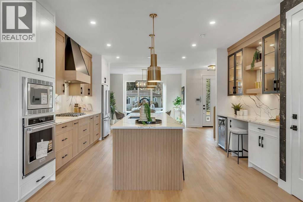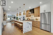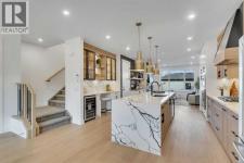 Discover the epitome of modern living in this impeccably located home! Nestled on a quiet street, steps from Bowness Park and next to a school, this 5-bedroom, 3.5-bath residence offers over 2800 sqft of luxury. The home showcases countless upgrades, including a CUSTOM UPGRADED QUARTZ BACKSPLASH throughout. The gourmet kitchen features a stainless steel KitchenAid package with built-in wall oven & microwave, double-door fridge with waterline, dishwasher, custom canopy hood fan, plus a large island with custom slat design and quartz waterfall, pantry, pull-outs, quartz counters, under-cabinet lighting, and custom cabinetry. The main floor also includes a formal dining area, living room with custom built-ins & fireplace, and a designer mudroom with bench & storage. Upstairs, you’ll find two spacious bedrooms, a laundry room with sink, a full bath, a bonus room with 10ft tray ceiling, and a luxurious master retreat with 10ft tray ceiling, a vast custom walk-in closet, and a spa-inspired ensuite featuring a freestanding tub, double vanity, and custom-tiled shower. The fully developed LEGAL basement suite offers spacious open-concept living with a bright living room enhanced by a large window, a dining area, and a custom kitchen complete with quartz backsplash, microwave hoodfan, breakfast bar, and ample counter space. It also features two large bedrooms, stacked laundry, and a full bathroom with a tiled surround shower. Exterior highlights include custom concrete steps, walkways, and patio, full landscaping, new fencing, BBQ gasline, and a private backyard area designed for basement tenants to enjoy. Additional features: 9ft ceilings on all levels, 8ft doors, flat painted ceilings (main & upper), knockdown basement ceilings, smart home wiring, upgraded lighting, custom faucets, central vac rough-in, AC rough-in, and CAT 5 wiring. A true blend of craftsmanship and intelligent design, this home is a must-see. Don’t miss this opportunity—next door unit 8718 is also availab le! (id:6769)