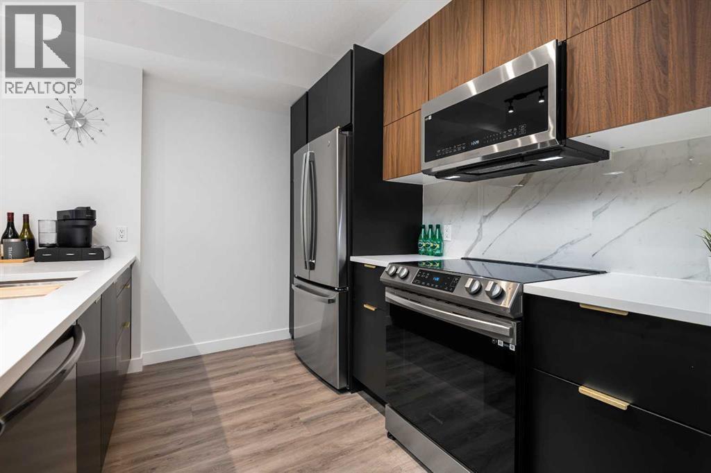 Freshly updated and move-in ready! This upscale 1-bedroom plus den condo in Lower Mount Royal has been beautifully renovated with a brand-new kitchen, quartz countertops with a waterfall edge, sleek stainless steel appliances, and vinyl plank flooring throughout. Fresh designer colors and modern materials create a stylish, contemporary feel. Located on the spacious main floor, this 865 sq. ft. suite features large principal rooms, a living room with a cozy gas fireplace, and direct access to your private patio through garden door. The generous primary bedroom includes a walk-in closet, while the den—currently classified as a non-bedroom due to the absence of a window—offers excellent flexibility as a guest room, home office, or second bedroom option. You’ll love the convenience of the in-suite laundry room with a new stacking washer/dryer, plus additional storage. The unit also comes with an assigned underground parking stall and access to bike storage. The Mantra building is tucked just off vibrant 17th Avenue, placing you steps from shops, restaurants, cafés, nightlife, Tomkins Park, transit, and everything that makes this one of Calgary’s most walkable and lively inner-city locations. Ideal for first-time buyers, investors, or downsizers seeking space, style, and unbeatable urban convenience. If you’re looking for a beautifully finished inner-city condo with room to live, work, and entertain—this one is a must-see. (id:6769)