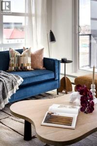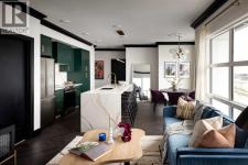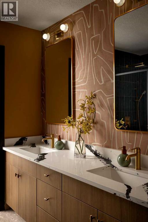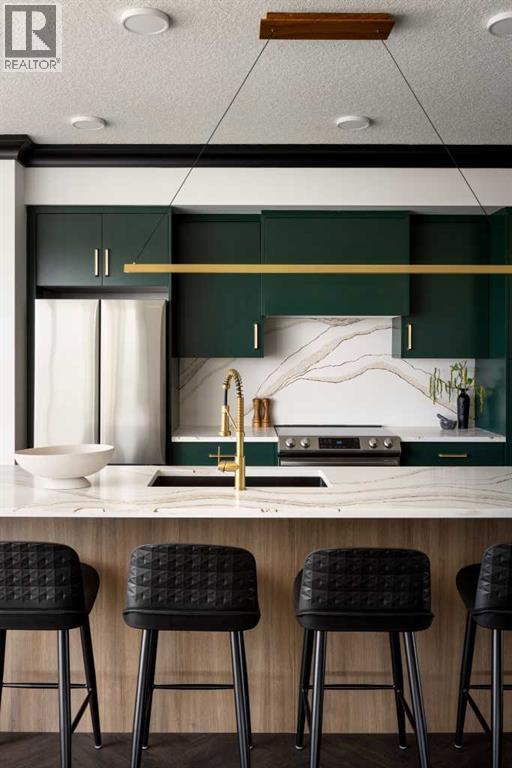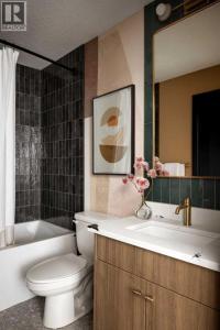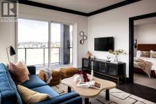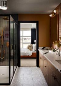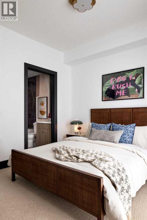 Discover the "Argento" floorplan by award-winning Rohit Homes—a bright and spacious 2-bedroom, 2-bathroom corner unit thoughtfully designed for comfort and style. Perfectly situated on the 5th floor of Quesnay at Currie Barracks, this home boasts soaring 9’ ceilings that create an airy, open feel while large windows fill the space with natural light. Featuring the bold and stylish Haute Contemporary color palette, the interior showcases a modern edge with sleek finishes and striking contrasts. The Argento offers high-end details throughout, including quartz countertops with a waterfall edge, a matching quartz backsplash, full-height cabinetry, a premium appliance package, bespoke light fixtures, and designer window coverings. The open-concept layout flows seamlessly between the kitchen, dining, and living areas, ideal for entertaining or simply enjoying everyday life. The primary suite includes a private ensuite for a touch of luxury, while the second bedroom and additional full bath provide comfort and flexibility for guests or a home office. Step outside to your ground-floor patio, extending your living space and offering a convenient connection to the outdoors. This pet-friendly and AIRBNB-approved building includes titled heated underground parking and plenty of visitor spaces. With its unbeatable location just minutes from downtown, Mount Royal University, and the vibrant communities of 17th Ave and Marda Loop, the Argento floorplan is perfect for downsizers or anyone looking for a stylish, low-maintenance home. Limited units are available—don’t miss your chance to make this striking residence yours! **Photos are taken from existing building of the same models. Not of the exact unit ** (id:6769)