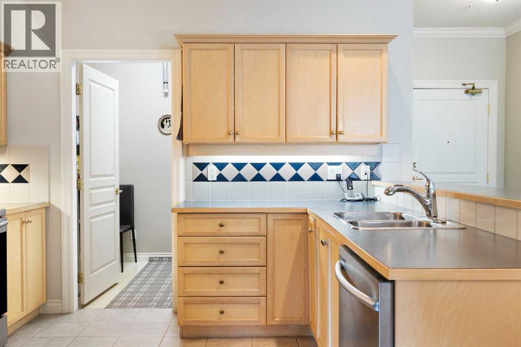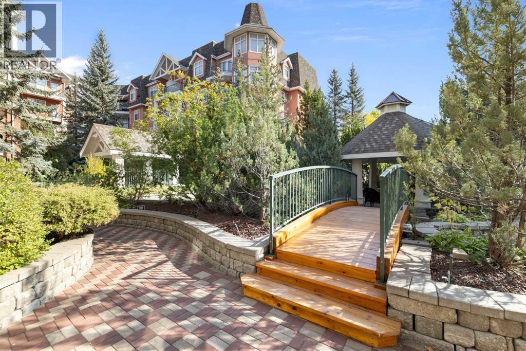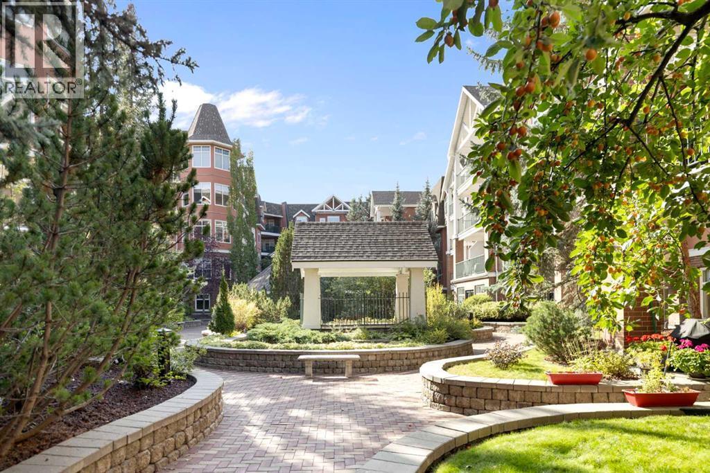 A Rare Find in River Grande Estates! PRIVATE SINGLE GARAGE IN THE UNDERGROUND PARKINGWelcome to this bright and spacious 2-bedroom, 2-bath condo perfectly located in the prestigious River Grande Estates. This home is steps from the MNP Centre, Elbow River pathways, the Saddle Dome, C-Train, and the trendy shops and restaurants of 4th Street SW. Truly, city living at its best!Inside, the open-concept layout is warm and welcoming. The large dining room and spacious living room are perfect for relaxing or gathering with friends with direct access to your private patio overlooking the tranquil courtyard with its trees and fountain. The well-appointed kitchen provides abundant cabinetry, stainless-steel appliances, lots of counter space—ideal for the chef in you.. Plus there is extra pantry /storage in the adjacent laundry room Your primary retreat is oversized and easily accommodates a king bed along with additional furniture. A luxurious 5-piece ensuite bath and walk-thru closet completes this private space. The second bedroom is equally inviting, with a large window and space for a queen bed, while the nearby 3-piece bath doubles as a guest washroom. Added conveniences include a generous in-suite laundry with storage, plus a separate assigned storage locker in the underground parking.The building itself sets the tone with an impressive front entry, stone detailing, and a spectacular landscaped courtyard featuring water fountains, trees, shrubs, and a gazebo. Residents also enjoy an exceptional list of amenities.: billiard room, library, party/entertainment room, bike storage, on-site maintenance manager, two car washes, and an extraordinary 30 underground visitor parking stalls. The complex also boasts a healthy reserve fund. Pets are welcome, with board approval (up to two pets; one dog up to 30 lbs.).This rare opportunity combines style, comfort, and location in one of Calgary’s most desirable condo communities. Don’t miss your chance to call River Grande Estates home—book your private showing today! (id:6769)