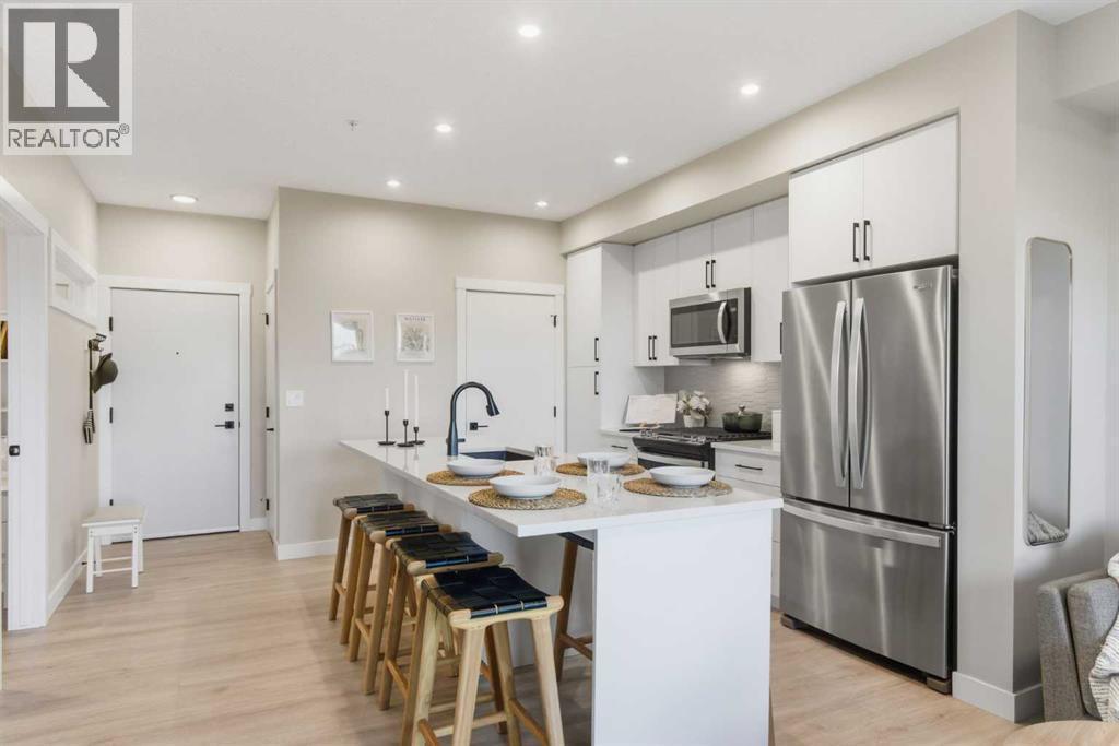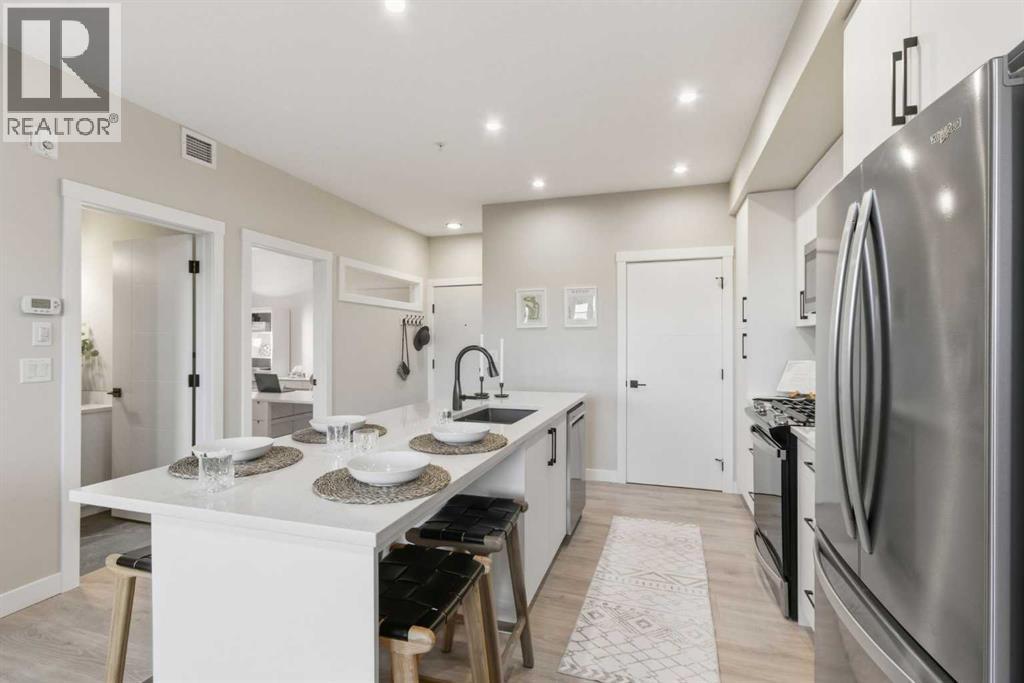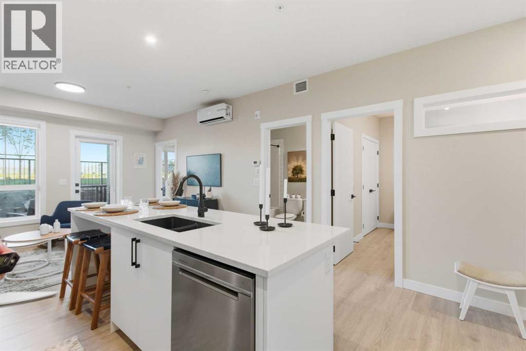 Better Than New – Walkout Patio and $21,000+ in Upgrades! Welcome to Lawrie Park, where modern living meets small-town charm in the heart of Okotoks. This beautifully upgraded 2-bedroom, 2-bathroom condo offers 691 sq. ft. of thoughtfully designed living space (744 sq. ft. builder size) and is move-in ready. Partners Homes’ most popular model has sold out in Buildings 1000, 2000, and 3000, and while Building 4000 is under construction with more of this plan, those won’t be available until mid-2026 and won't have outside ground access. Why wait when you can move in now and enjoy an exclusive walkout patio with direct outdoor access, something none of the Building 4000 units will have. Inside, you’ll appreciate the attention to detail and quality craftsmanship that Partners Homes is known for. The bright, open-concept design features 9-ft ceilings, large windows, and a clean, modern aesthetic. The white kitchen includes over $21,000 in upgrades such as a gas stove, upgraded quartz island with built-in dining space, extra kitchen drawers for storage, upgraded lighting, and durable Luxury Vinyl Plank flooring throughout. The living area opens directly to your private patio—perfect for morning coffee or evening relaxation. The spacious primary suite features a walk-in shower ensuite and generous closet space, while the second bedroom is ideal for guests, a home office, or hobby room. You’ll also enjoy air conditioning, in-suite laundry, a heated underground parking stall, and a storage locker. Lawrie Park offers a true sense of community with basketball courts, gardens, and gathering spaces. The Wedderburn neighbourhood includes walking paths, a pond, playground, off leash dog park and easy access to D’Arcy Crossing with Safeway, Starbucks, and Shoppers. Only 15 minutes to Calgary, you’ll love the blend of convenience and charm. Don’t wait until 2026—this home offers new construction quality, pet-friendly living, and immediate possession. Move in and enjoy everything La wrie Park has to offer! (id:6769)